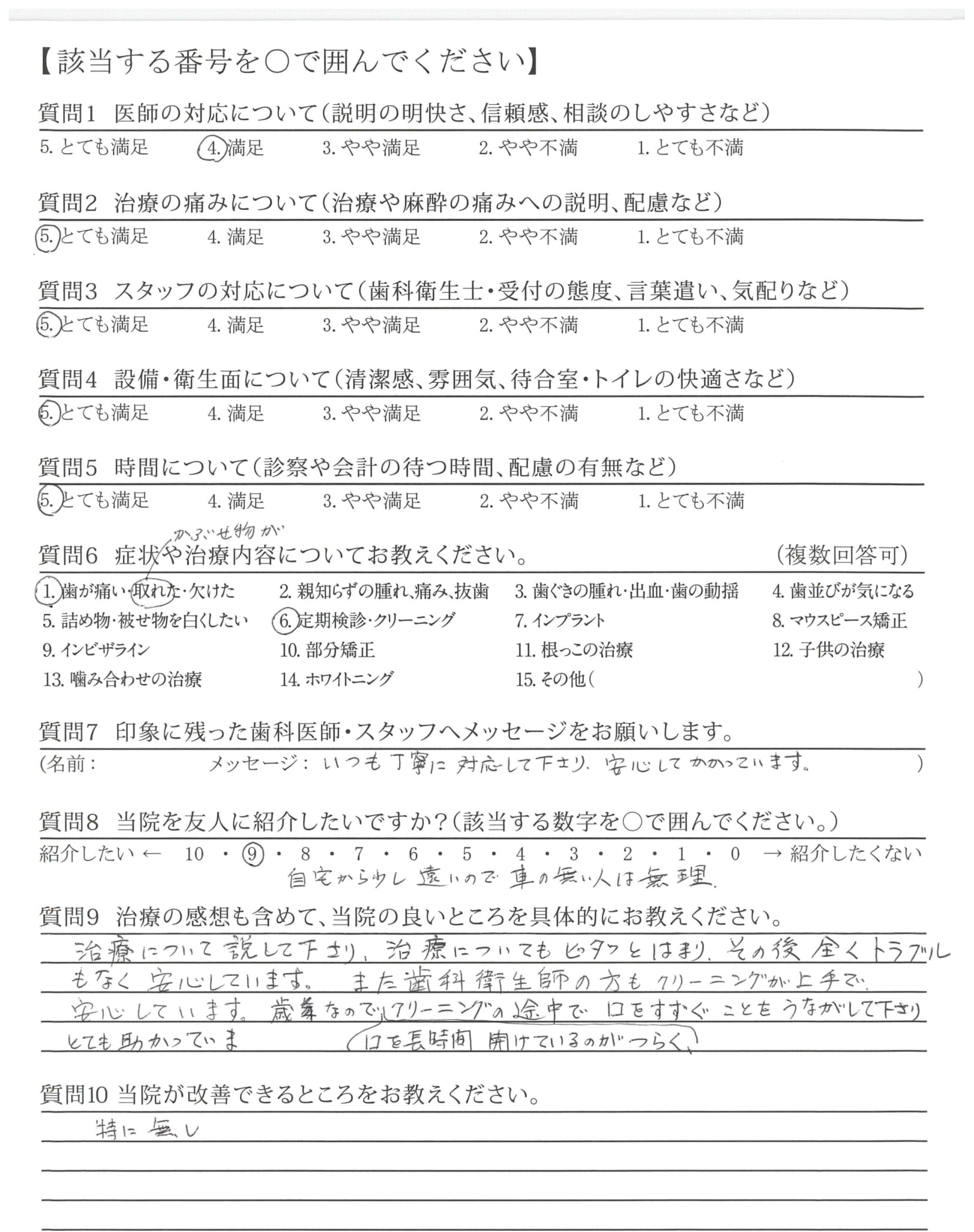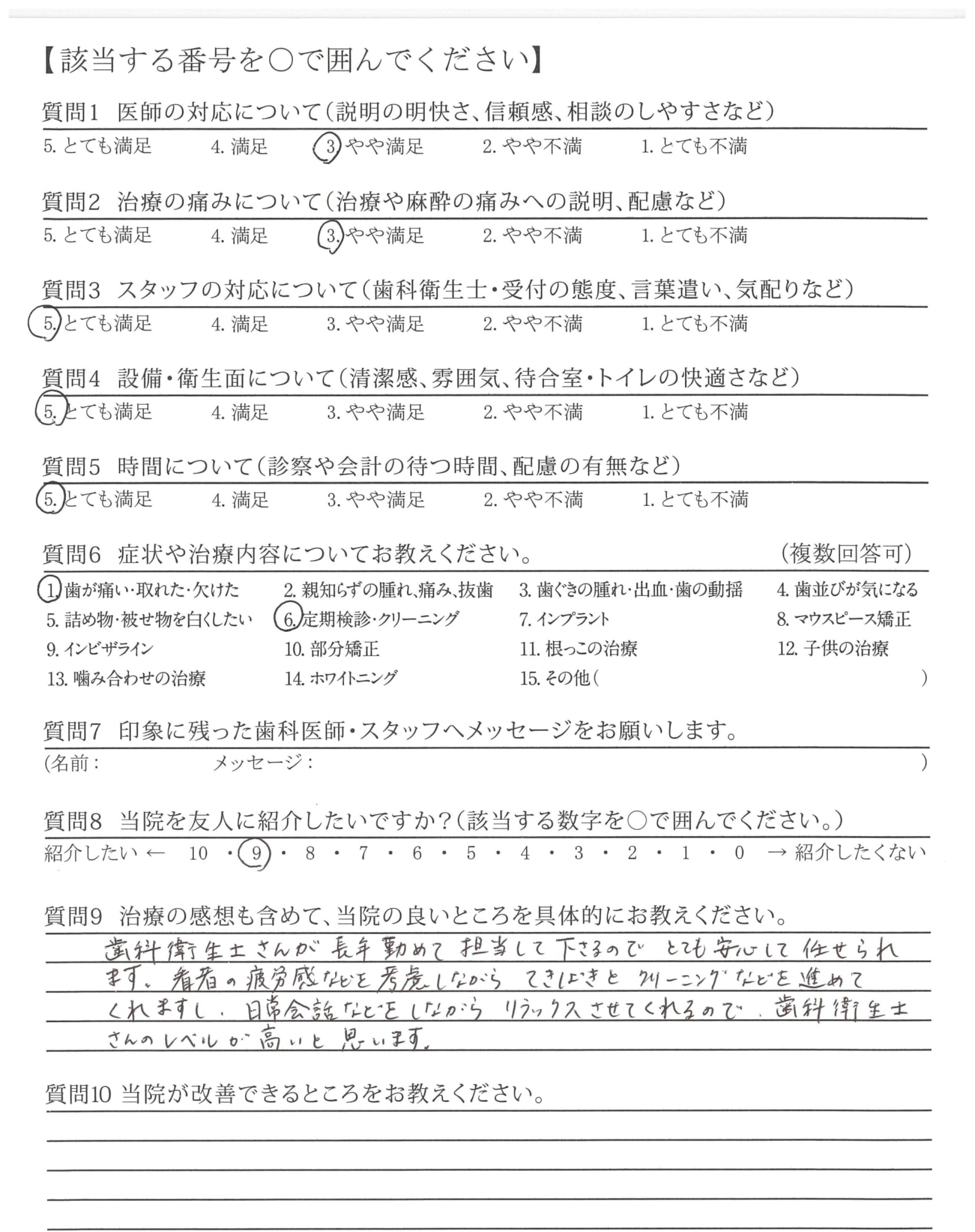 治療について説して下さり、治療についてもピタッとはまり、その後全くトラブルもなく安心しています。また歯科衛生師の方もクリーニングが上手で安心しています。歳なので口を長時間開けているのがつらく、クリーニングの途中で口をすすぐことをうながして下さりとても助かっています