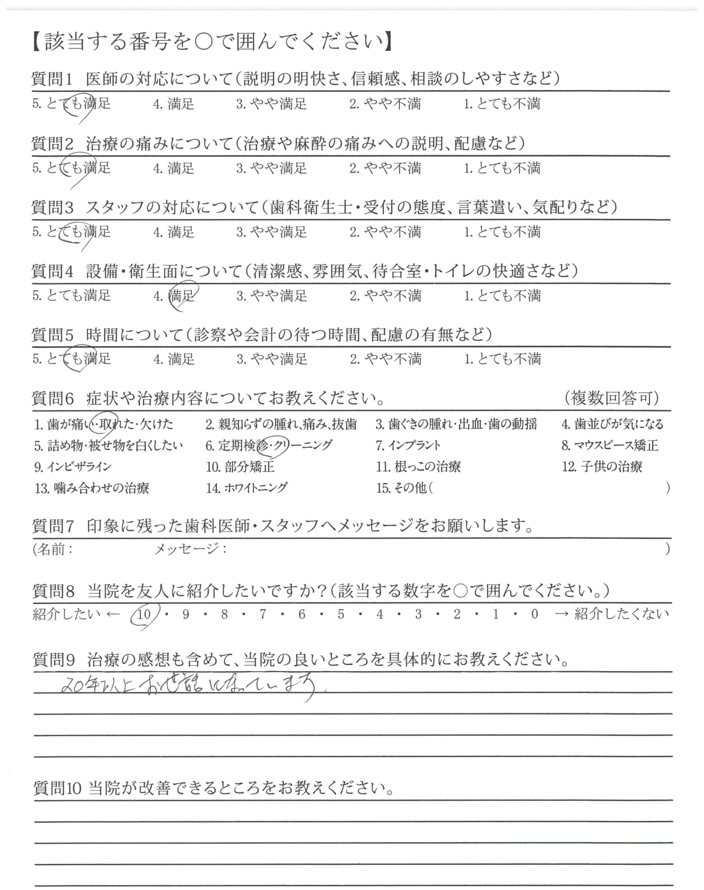 歯槽膿漏がヒドくて、10年以上前からおせわになっています。途中ブランクがあってもていねいに対応してもらえたのと、昭和の歯医者とはちがってしっかりとした説明、歯のみがき方など慧眠した所も多く、入歯に対するネガティブな部分もなくなり、歯医者の概念が変わりました、いつもありがとうございます。