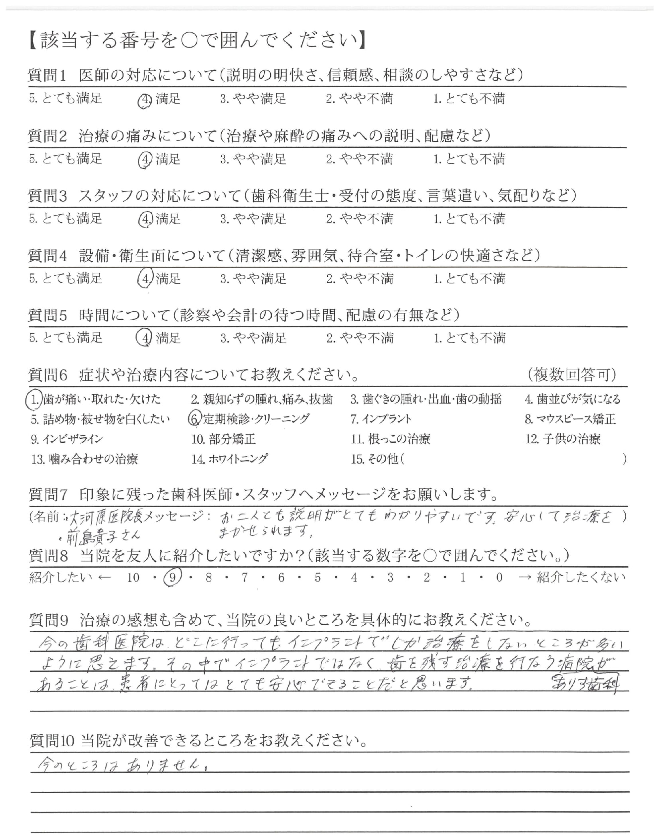 長い間担当していただき、歯磨きの指導いただき、ありがとうございます。