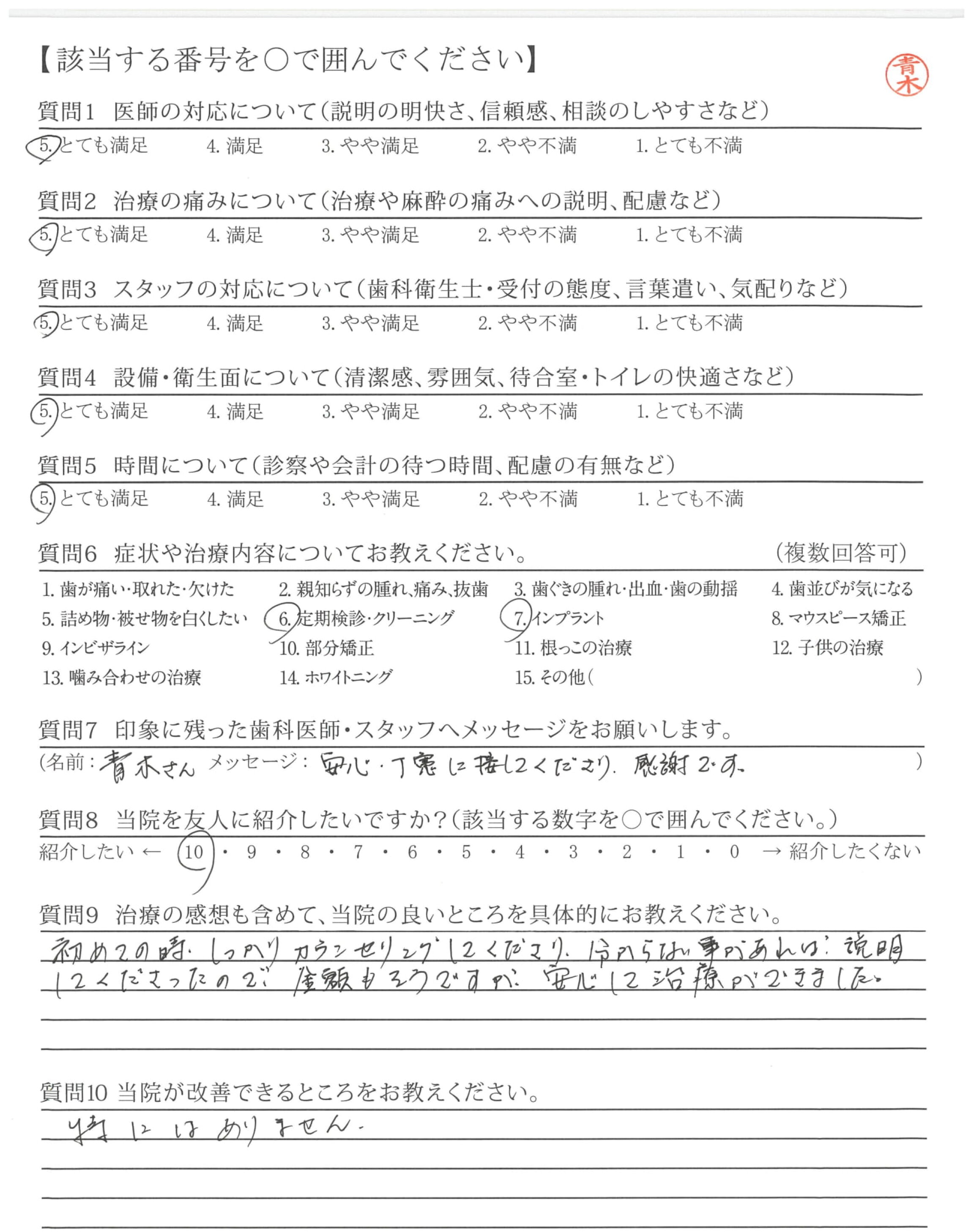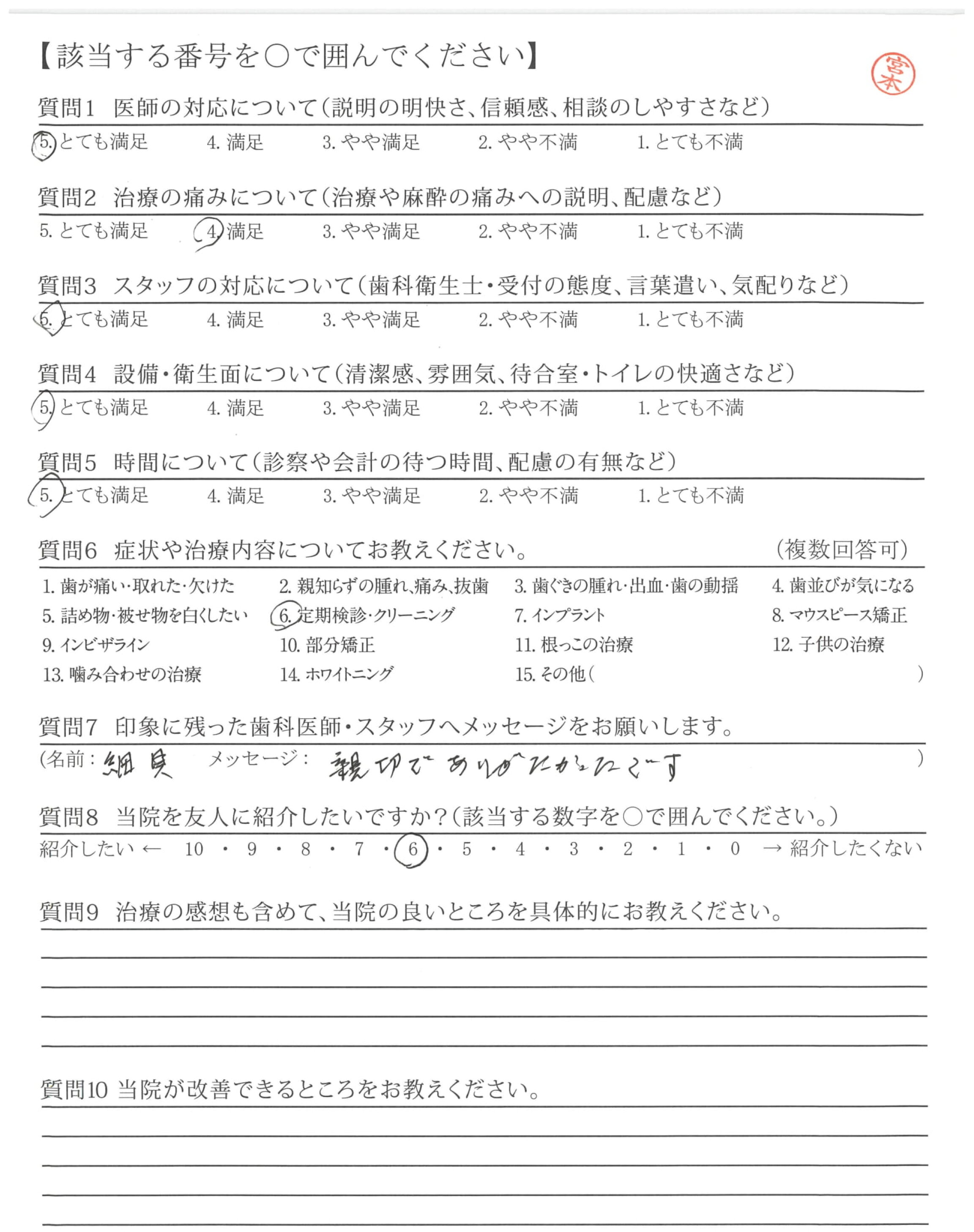 初めての時、しっかりカウンセリングしてくださり、分からない事があれば、説明してくださったので、金額もそうですが、安心して治療ができました。