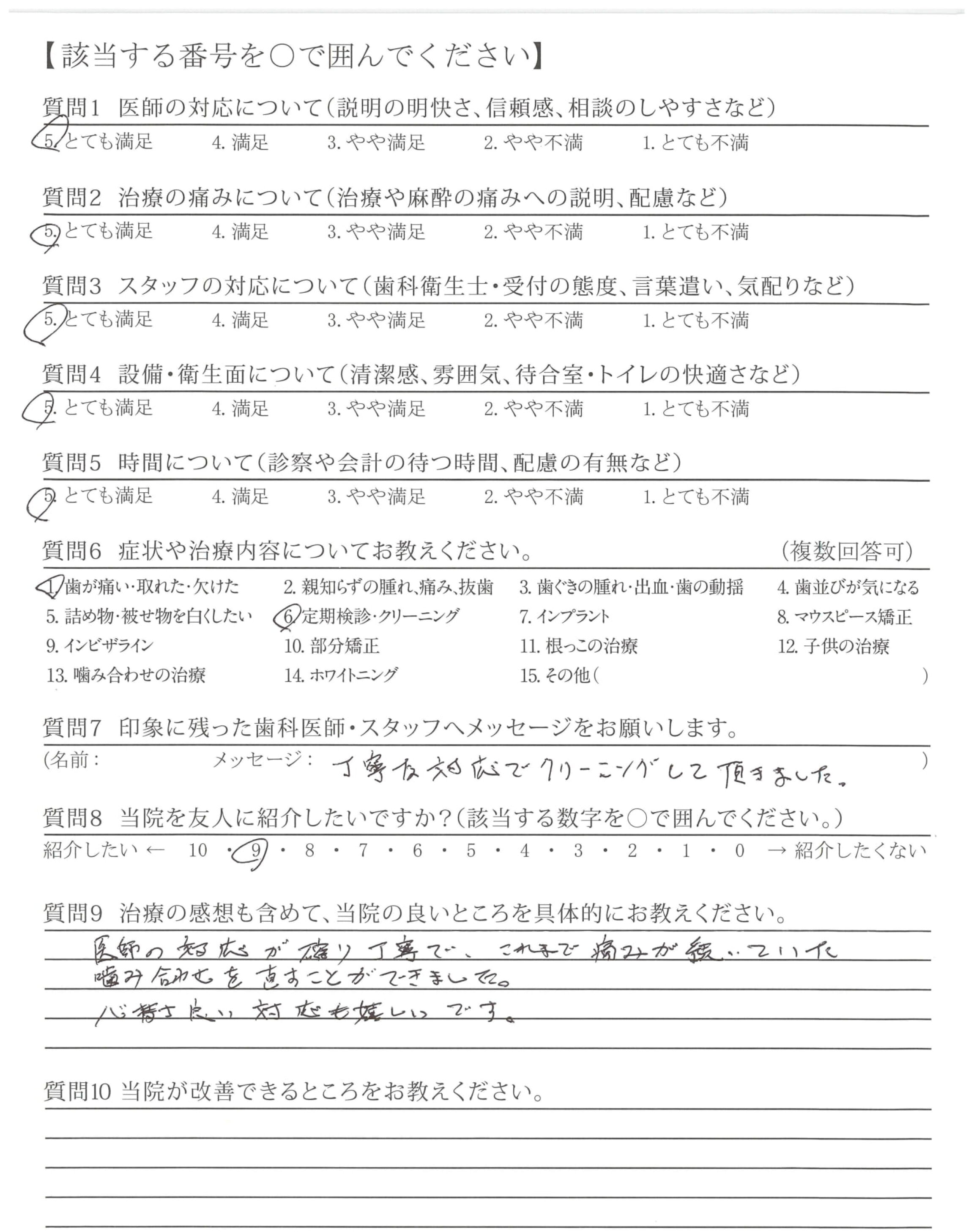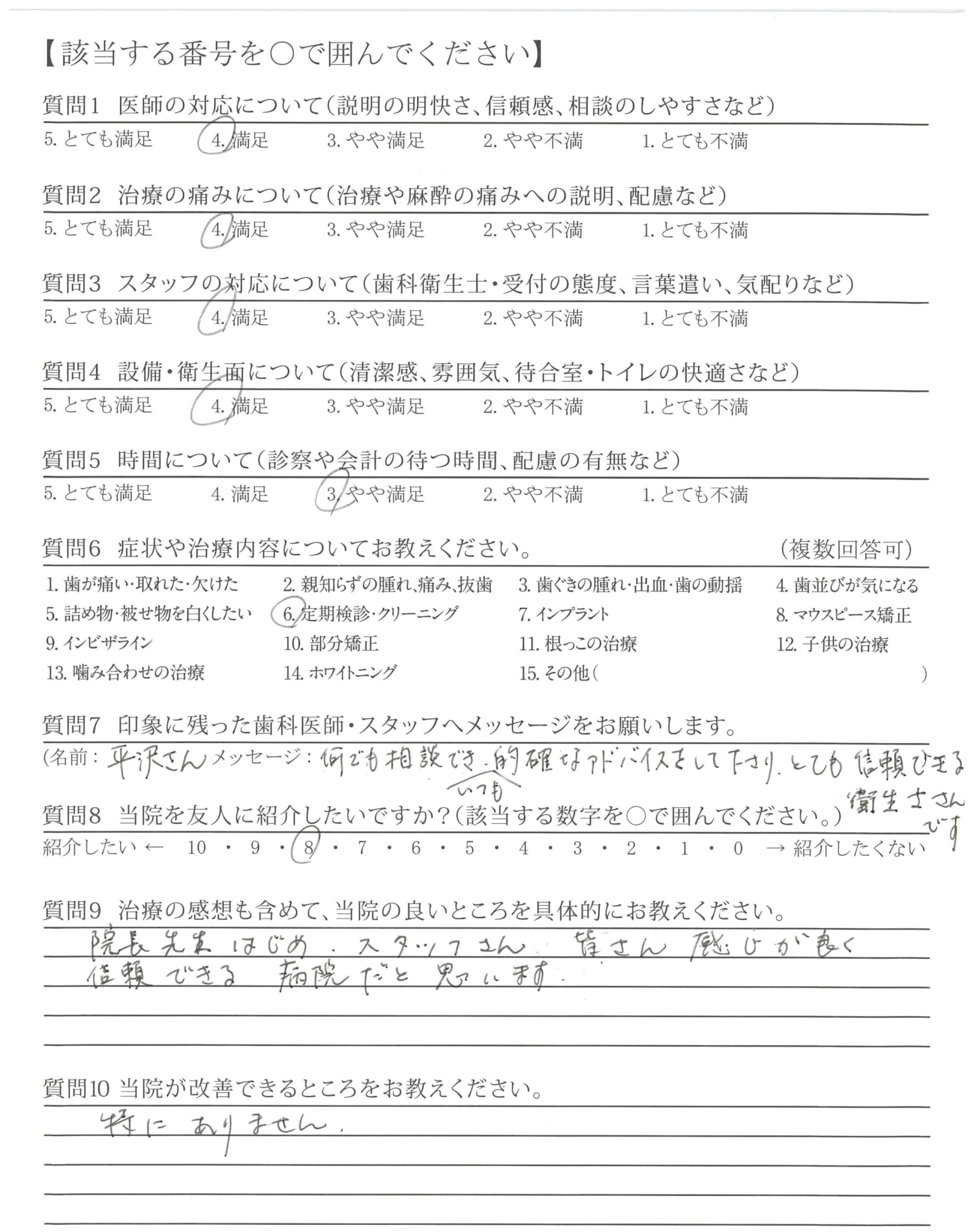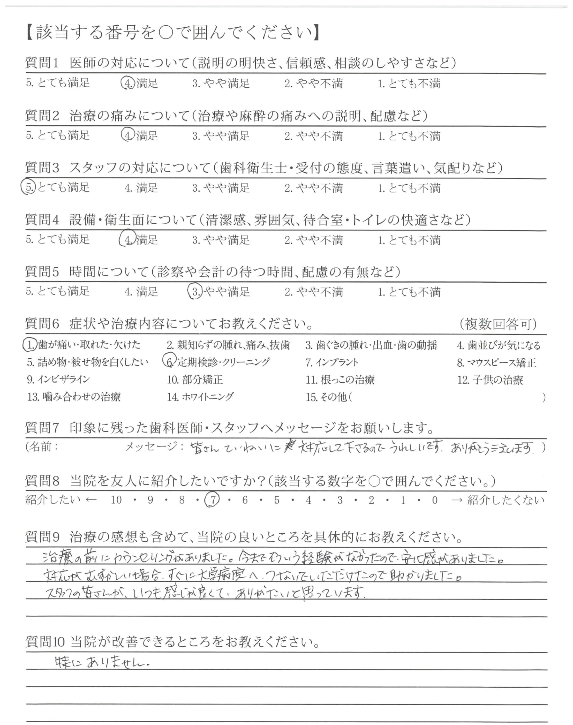 なるべく、自分の歯を残す方向で常に治療してくださるので、ありがたいですが、予定が説明不十分なところを改善してほしい。
