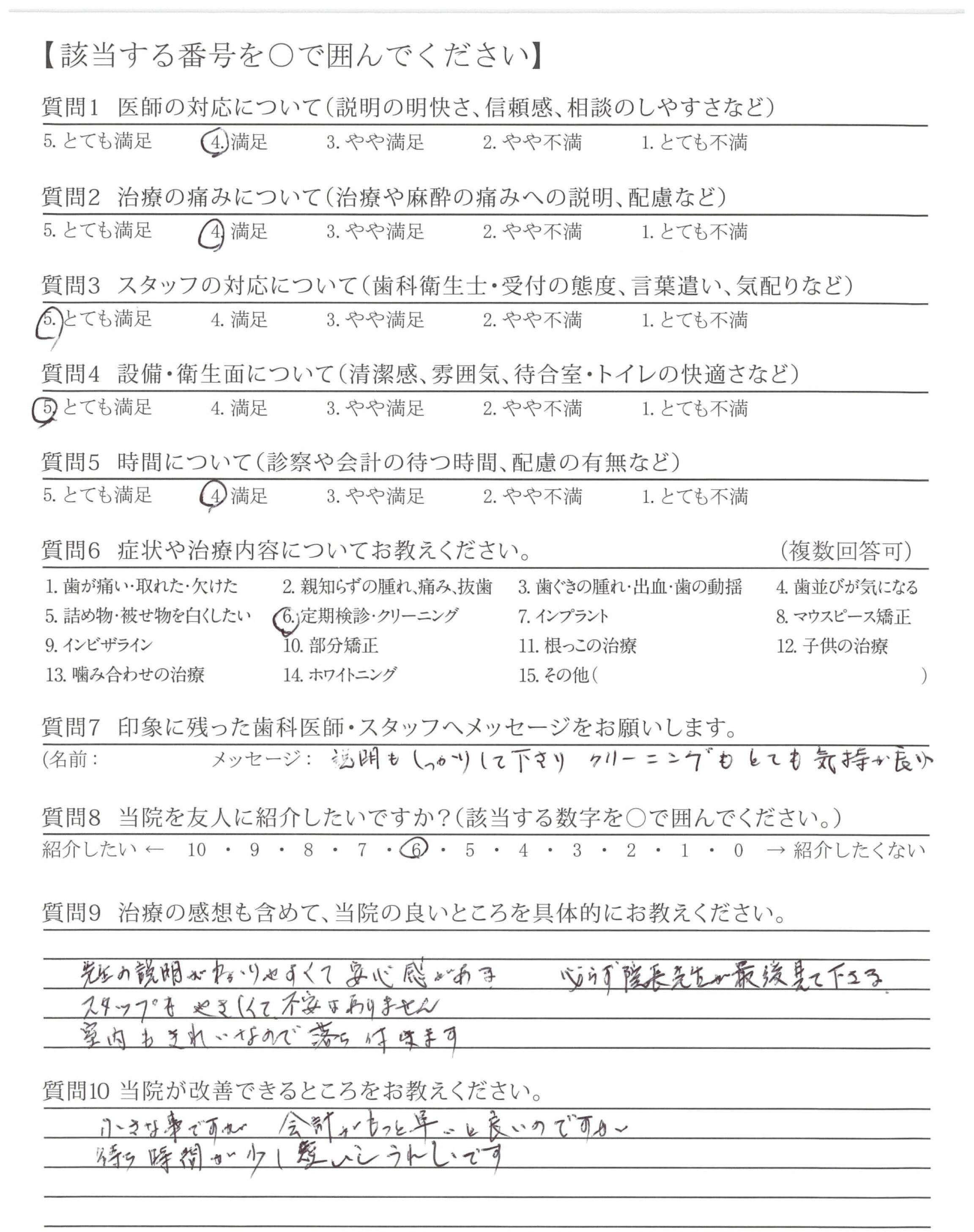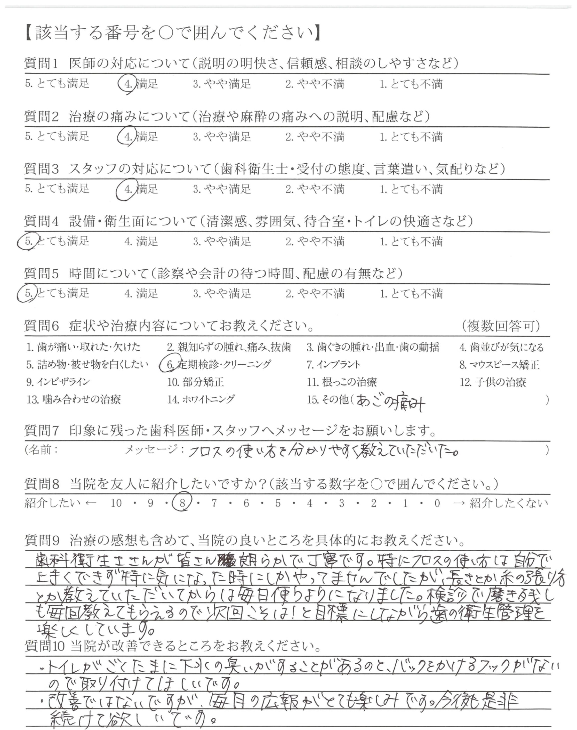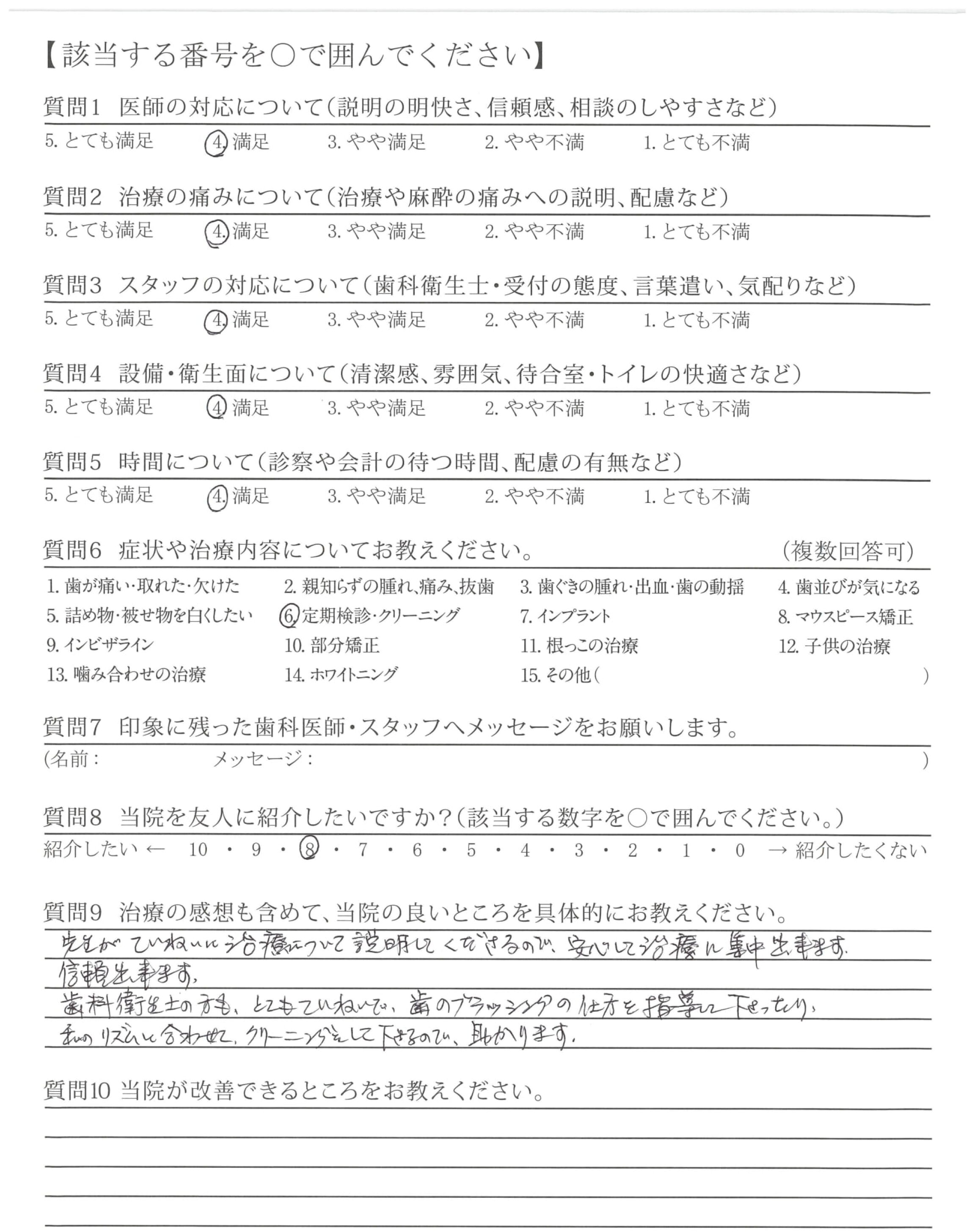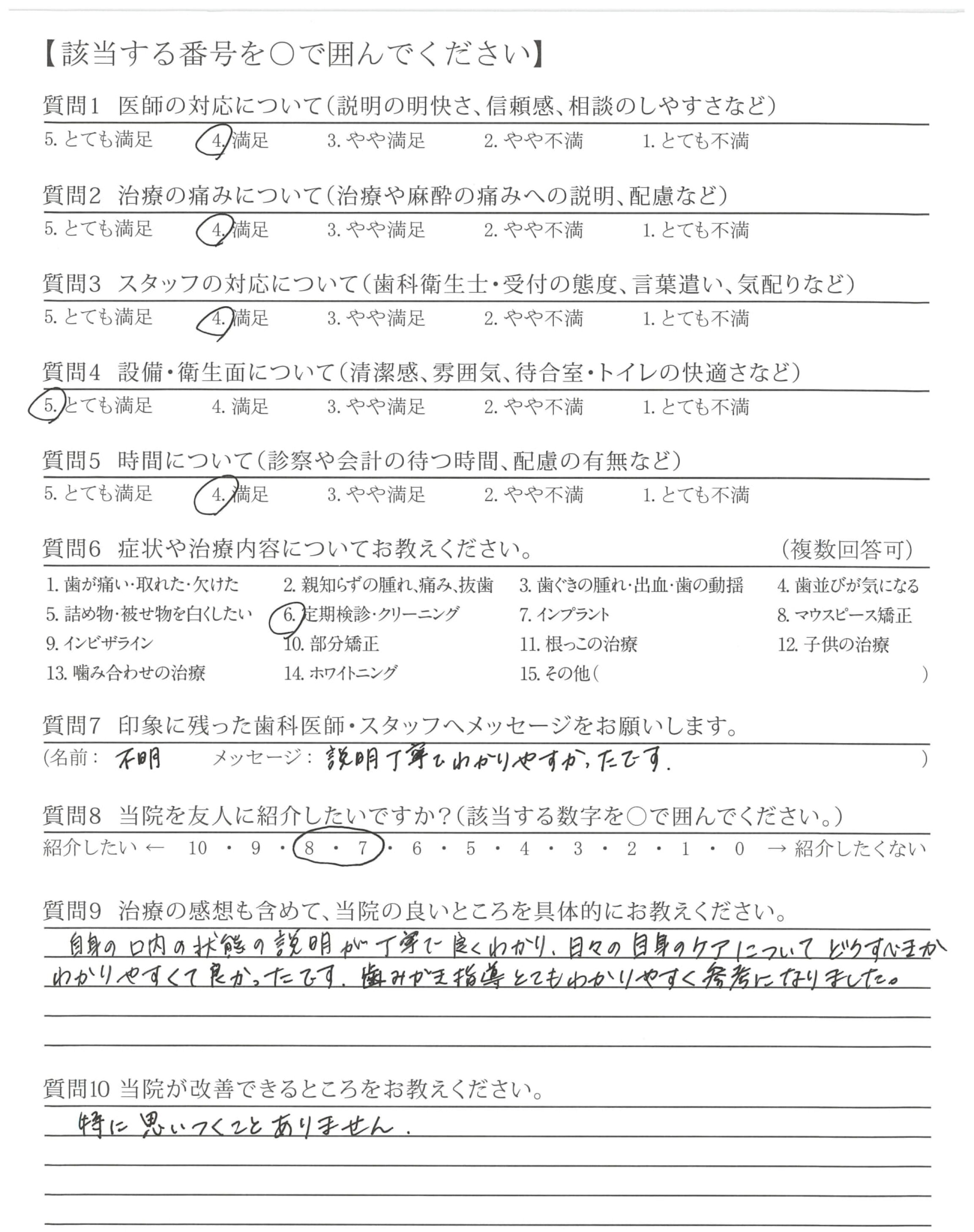 自身の口内の状態の説明が丁寧で良くわかり、日々の自身のケアについてどうすべきかわかりやすくて良かったです。歯みがき指導とてもわかりやすく参考になりました。