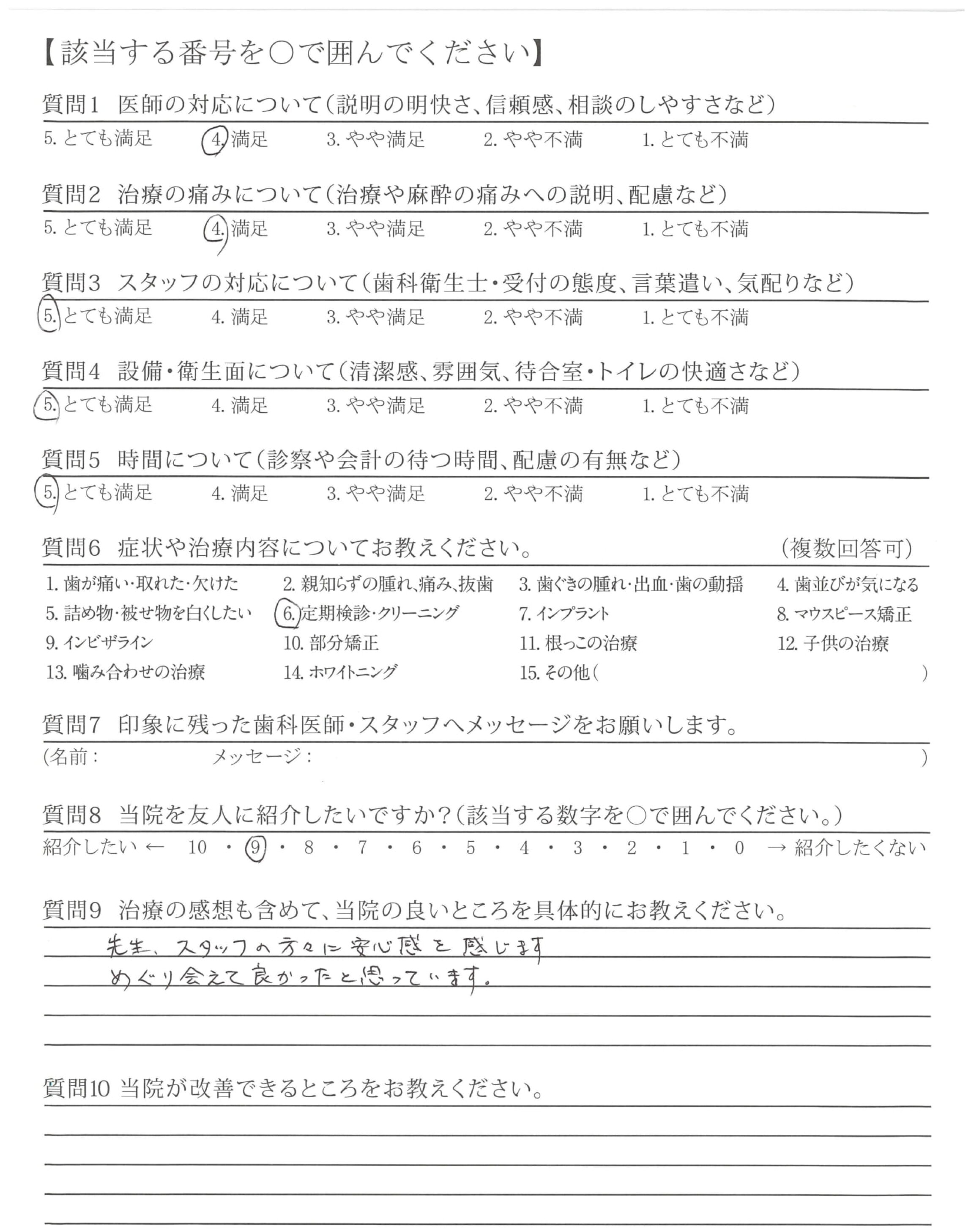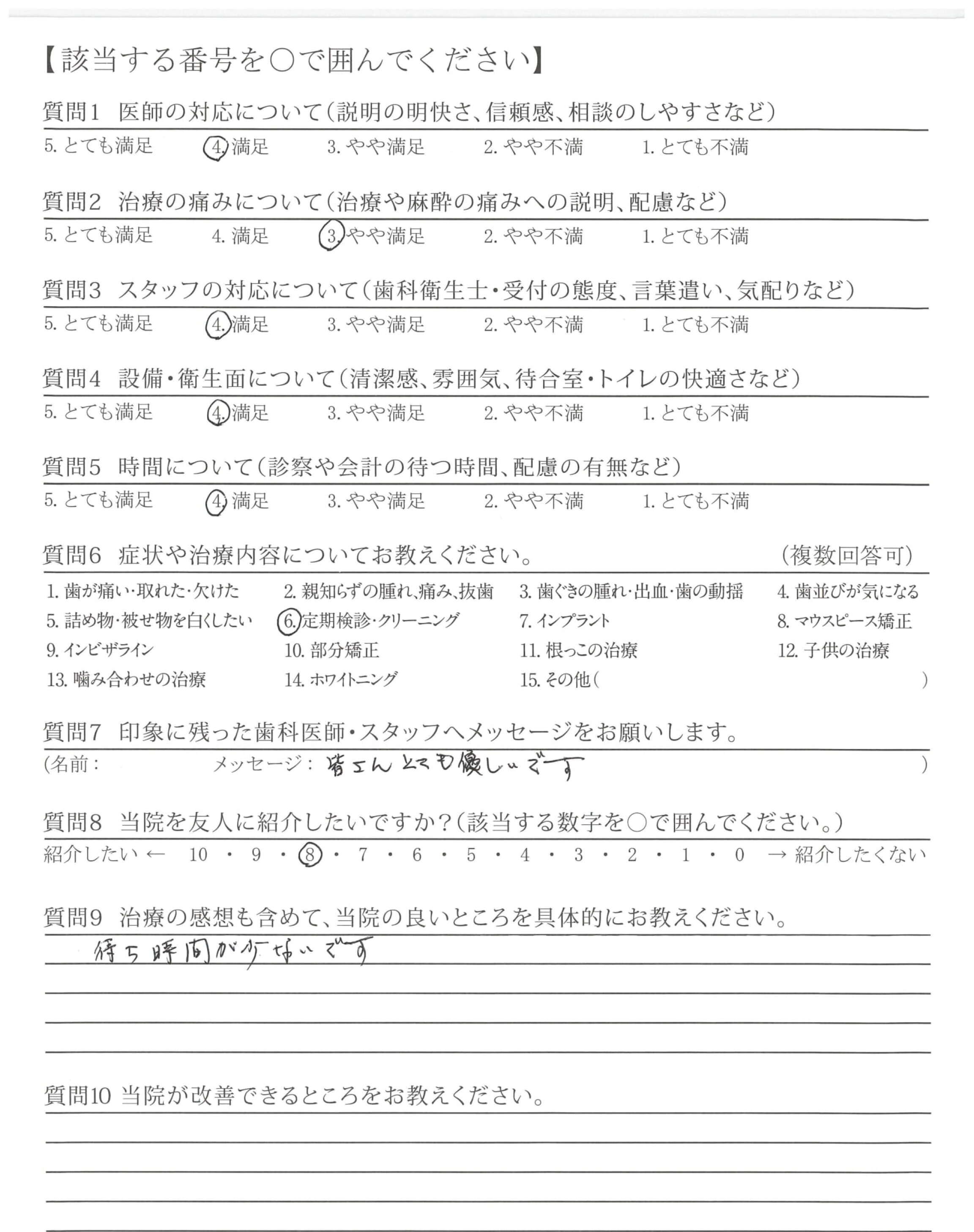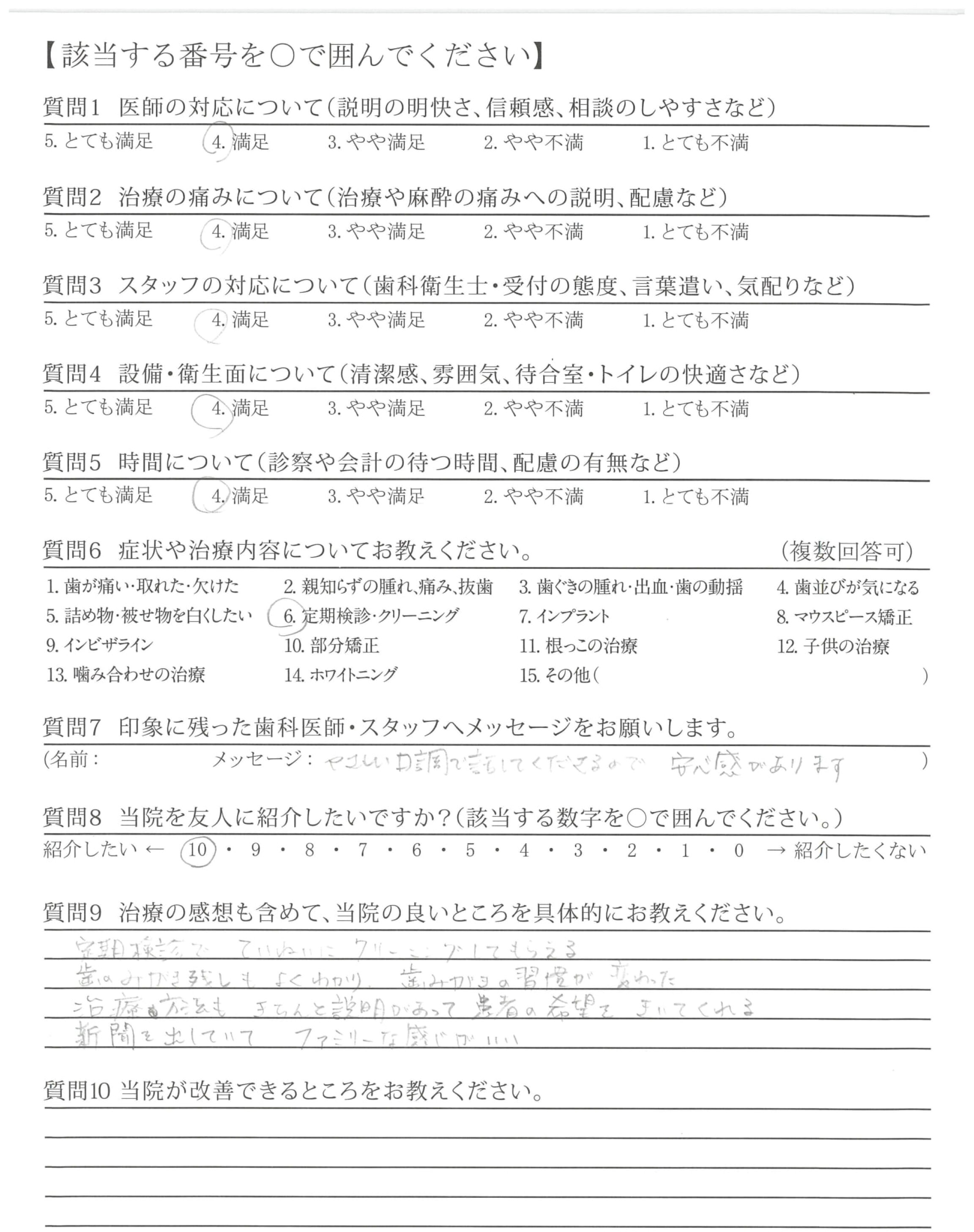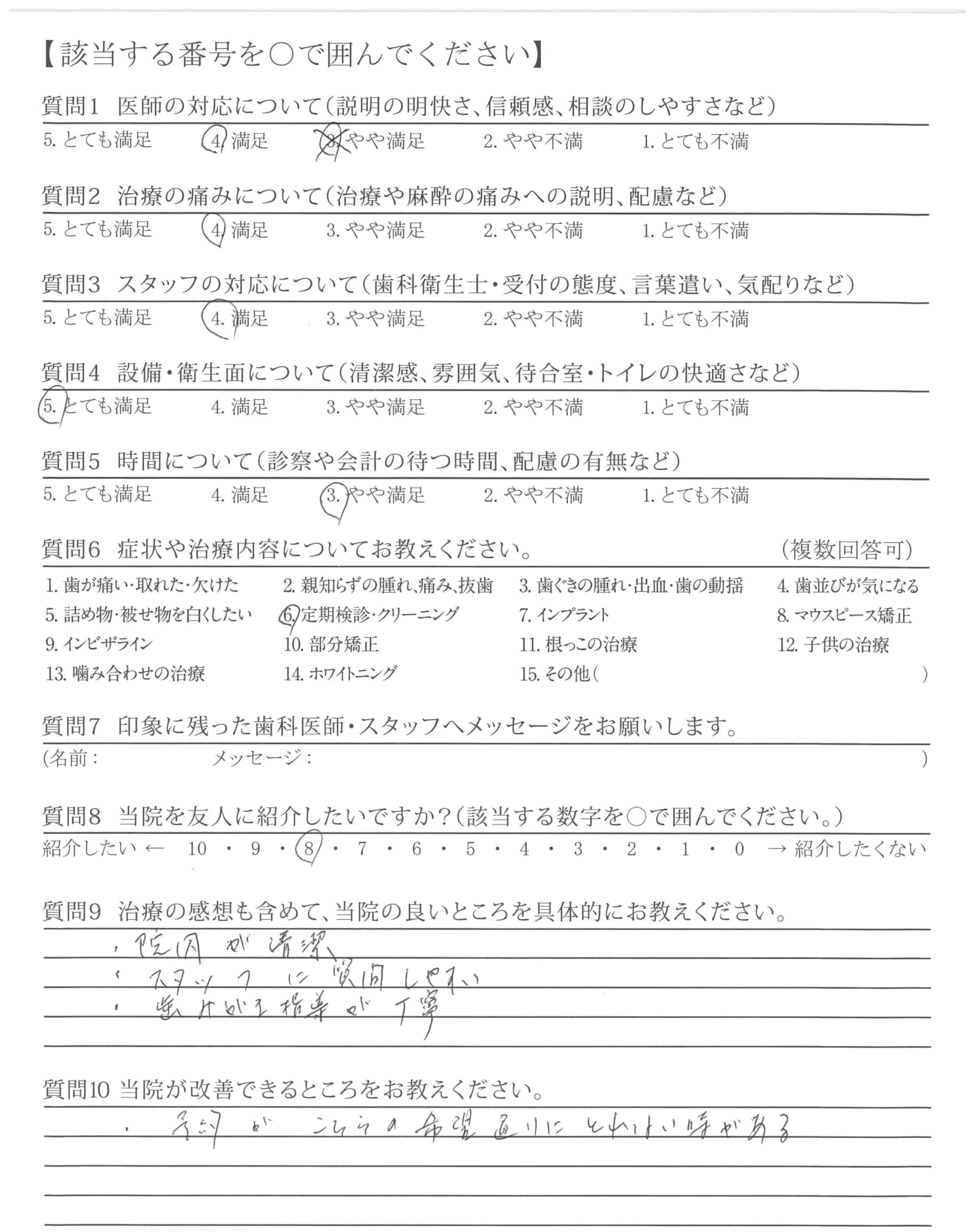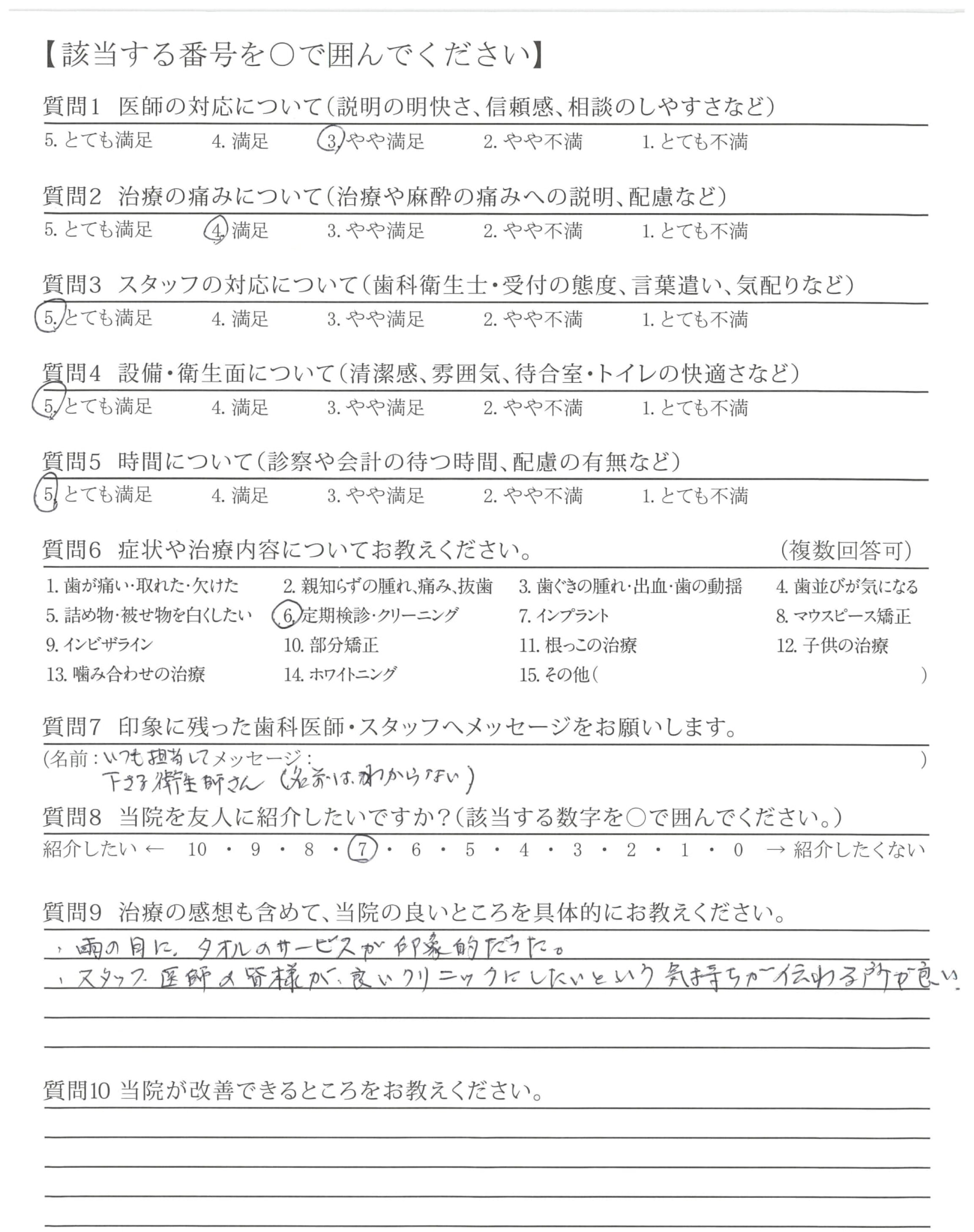自身の口内の状態の説明が丁寧で良くわかり、日々の自身のケアについてどうすべきかわかりやすくて良かったです。歯みがき指導とてもわかりやすく参考になりました。