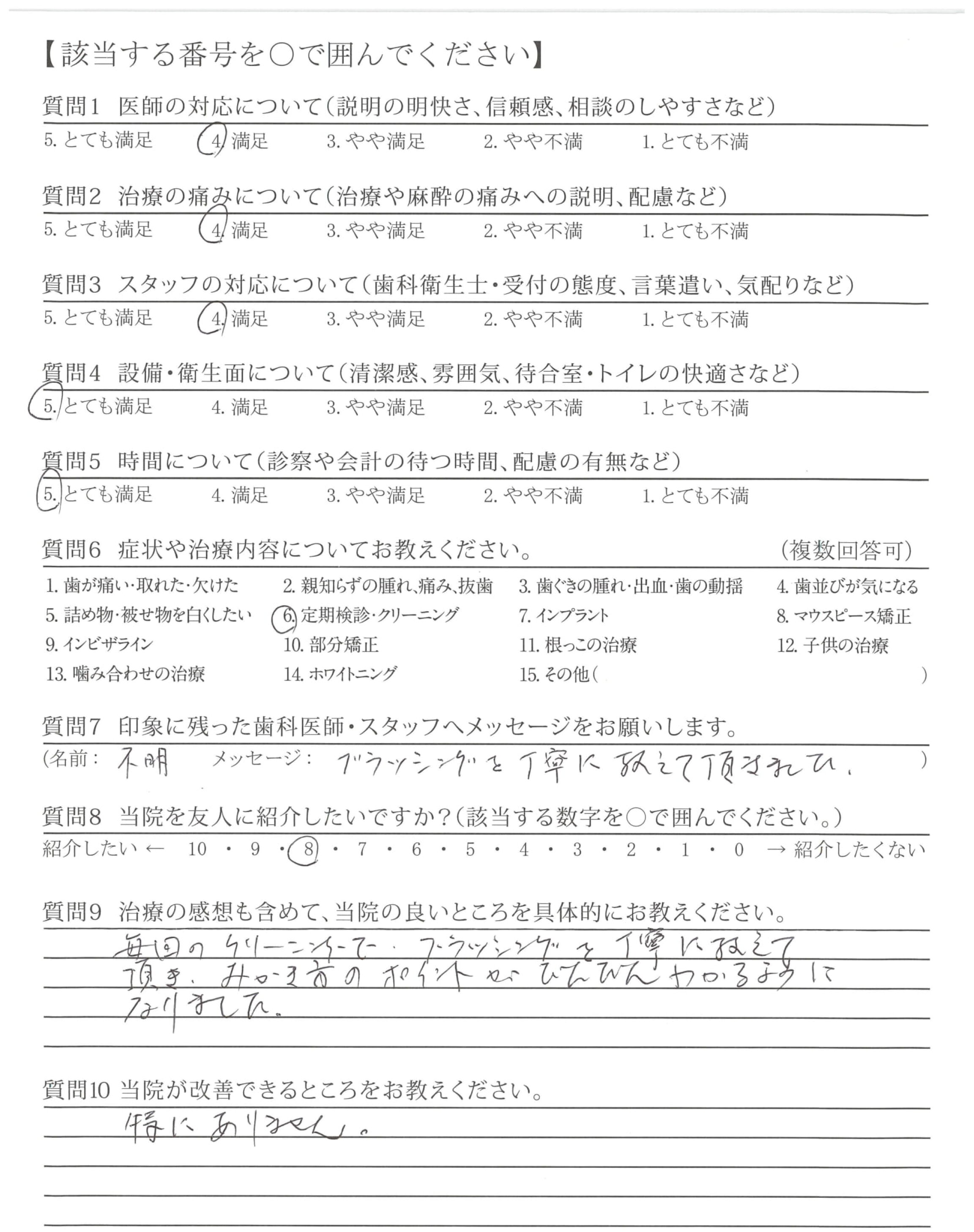 毎回のクリーニングで、ブラッシングを丁寧に教えて頂き、みがき方のポイントがだんだんわかるようになりました。