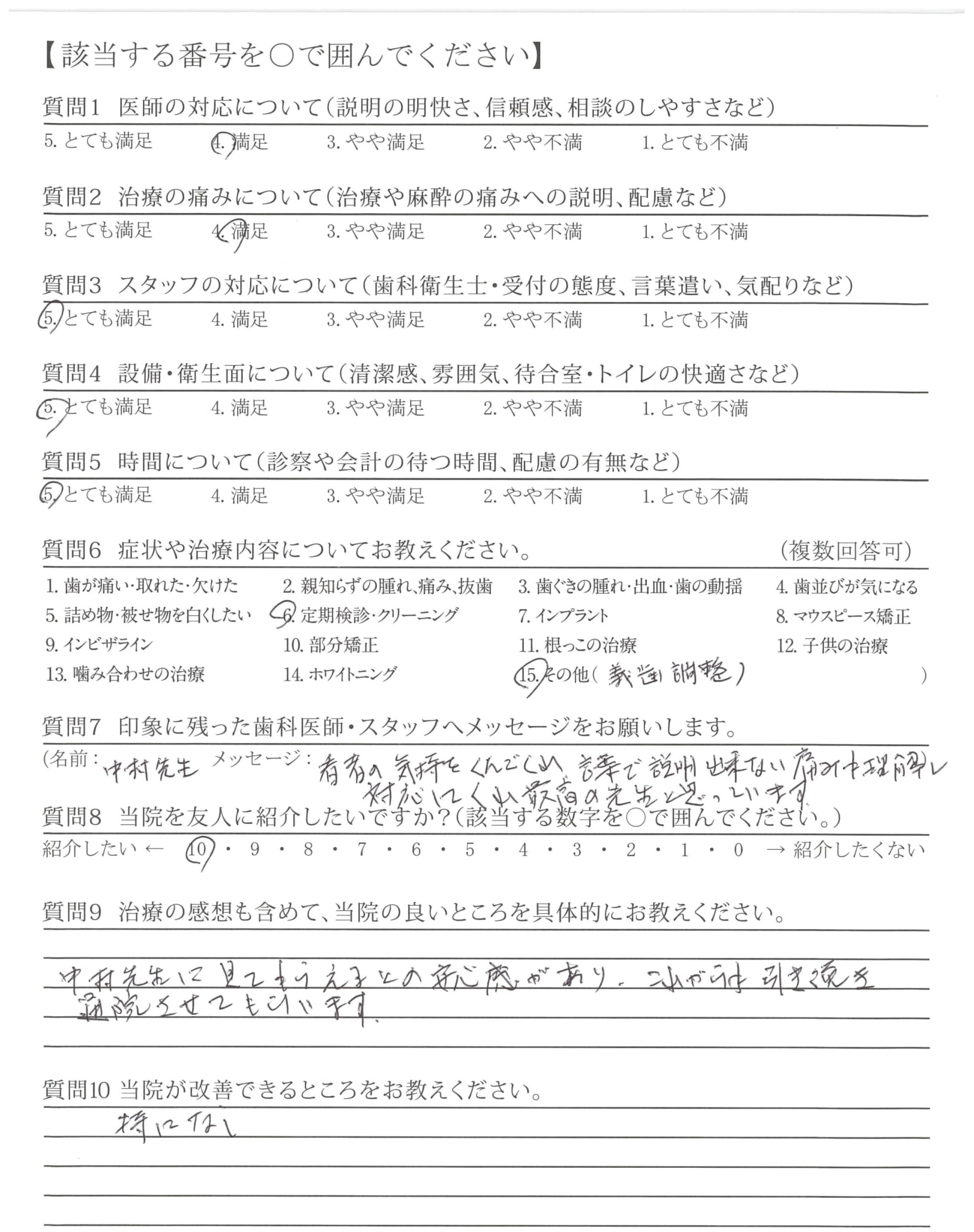 中村先生に見てもらえるとの安心感があり、これからも引き続き通院させてもらいます。