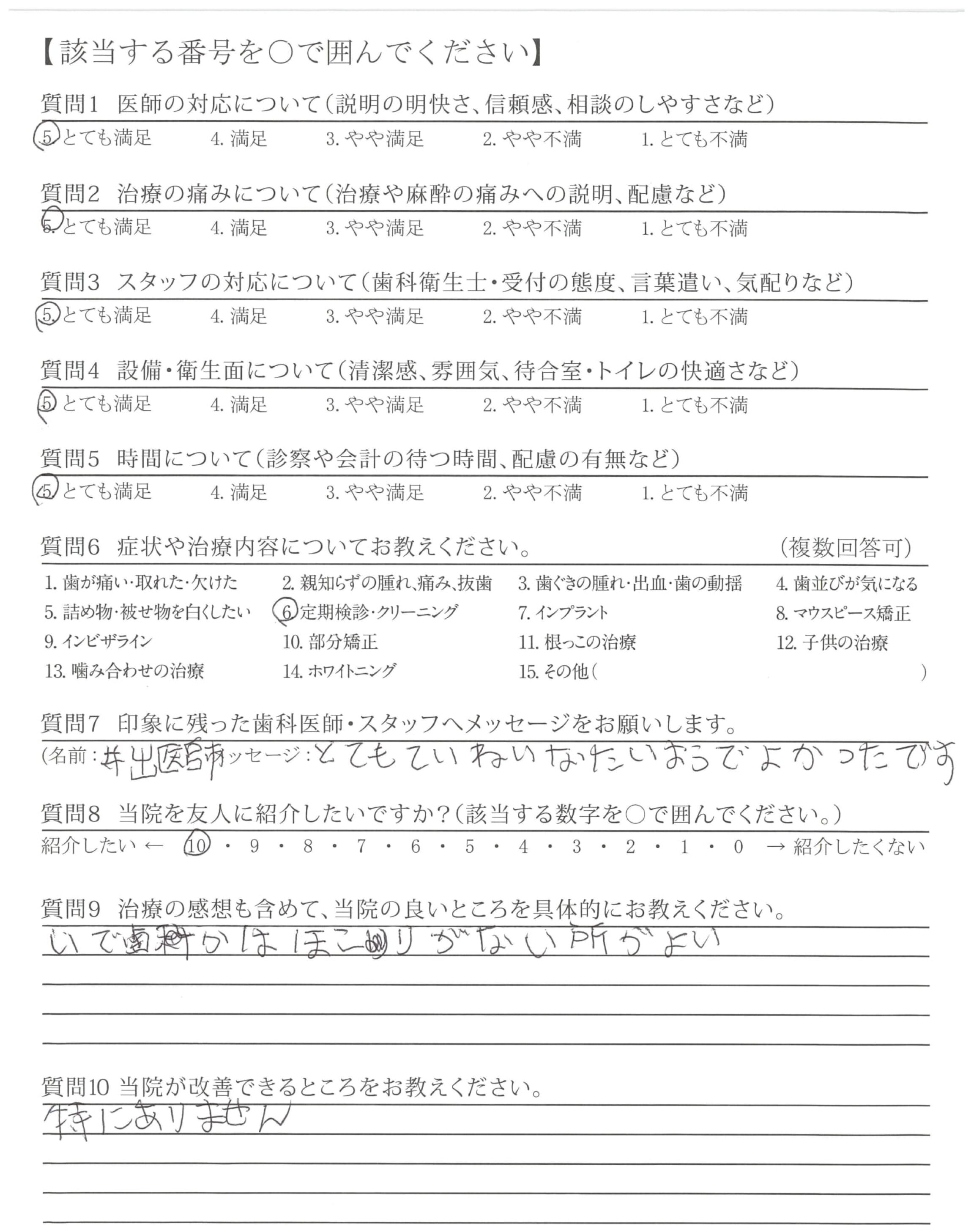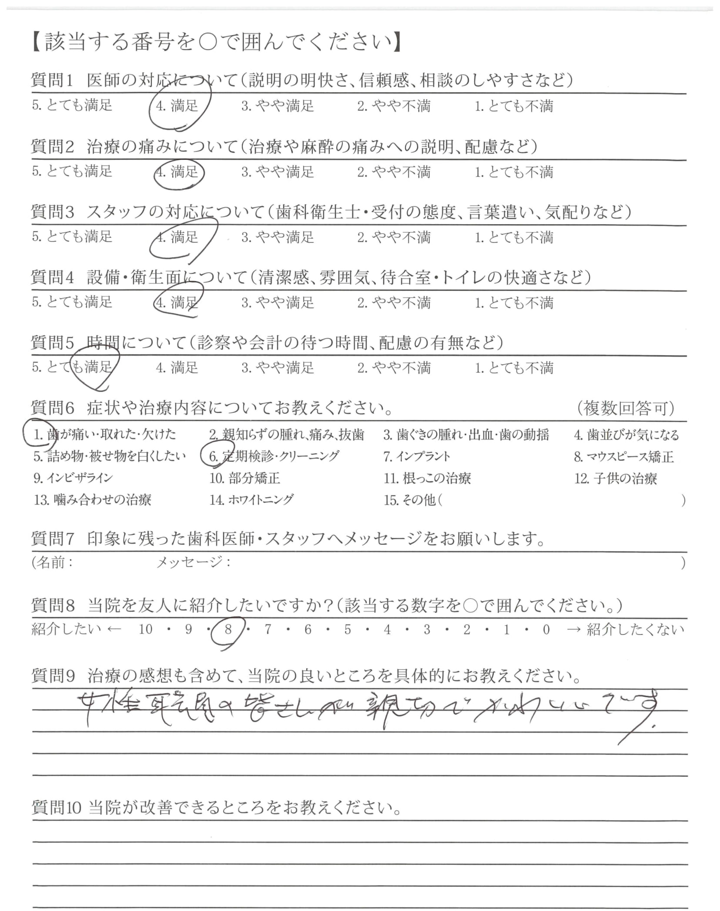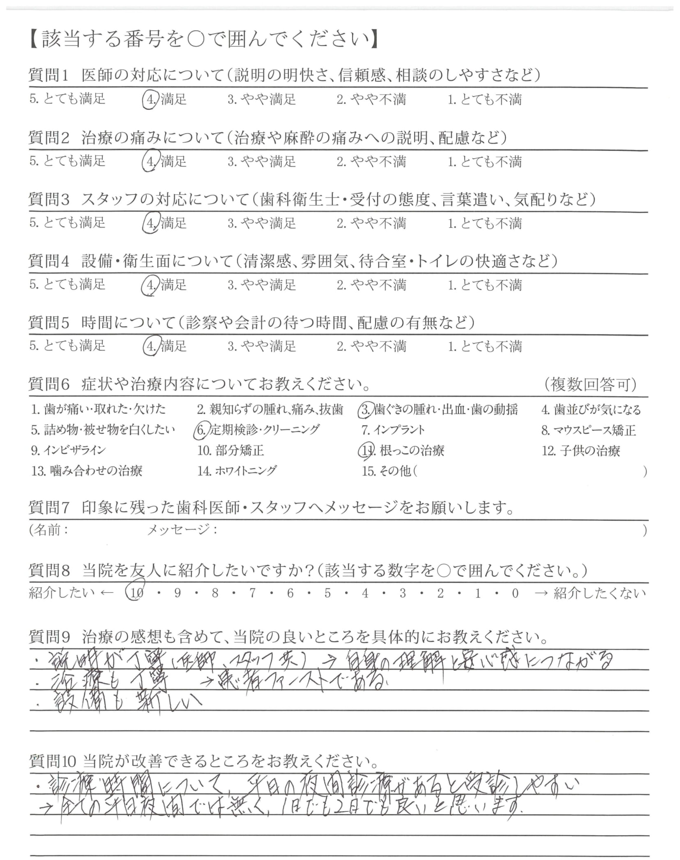 治療がとても丁寧な上に定期的に診察していただき自分では気が付かない状況を指摘いただき、とても助かっておりますし感謝しております。今後ともどうかよろしくお願い申し上げます。