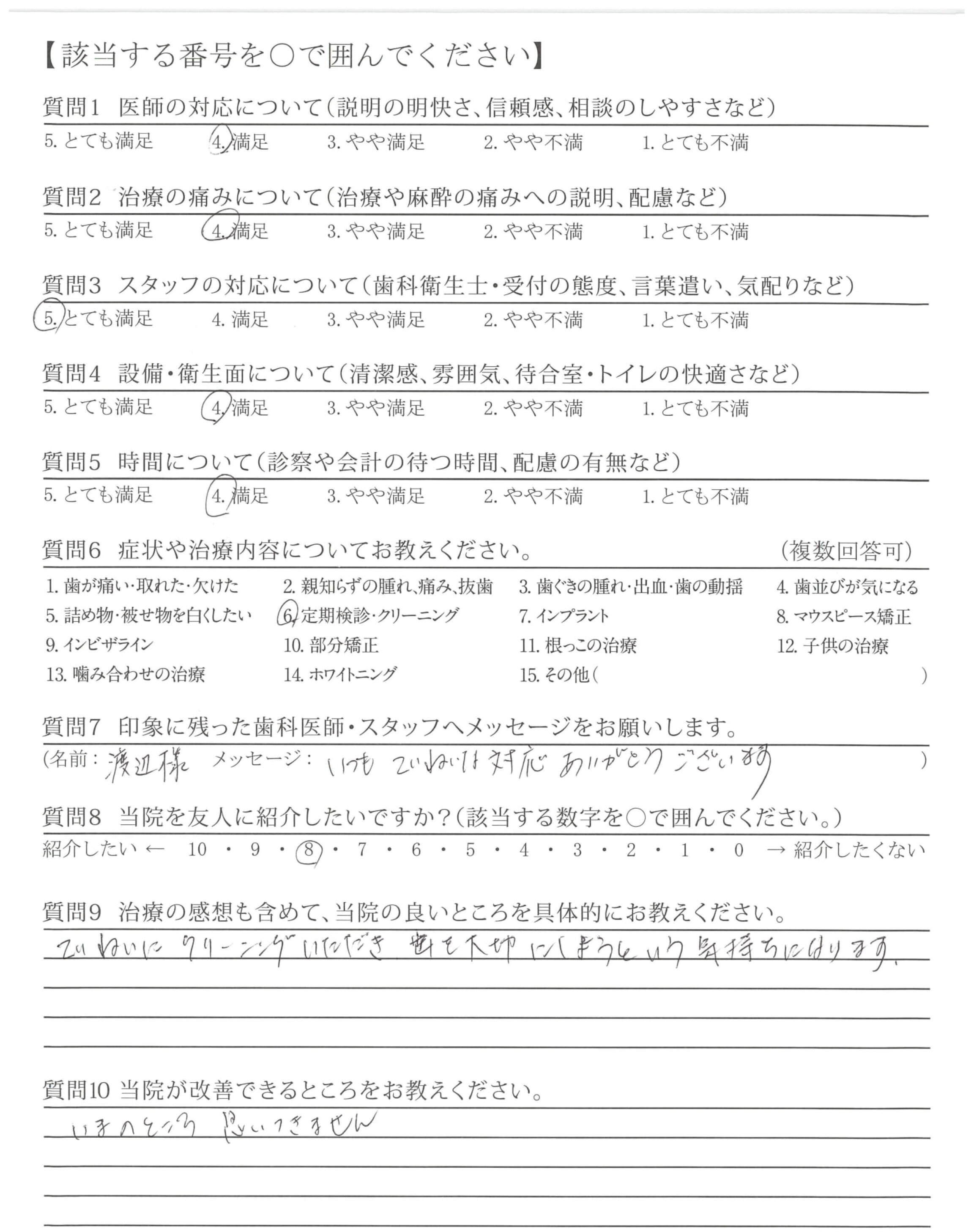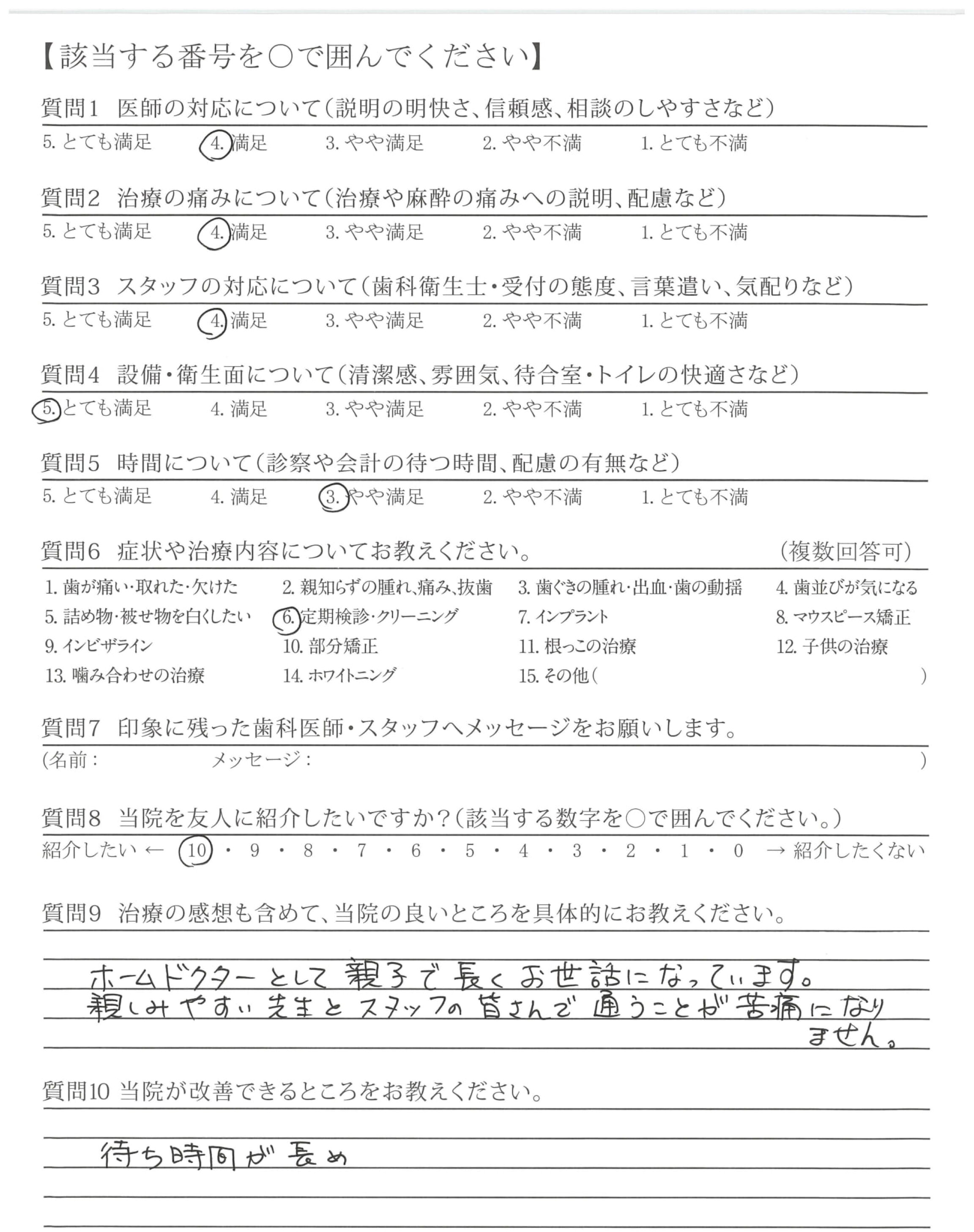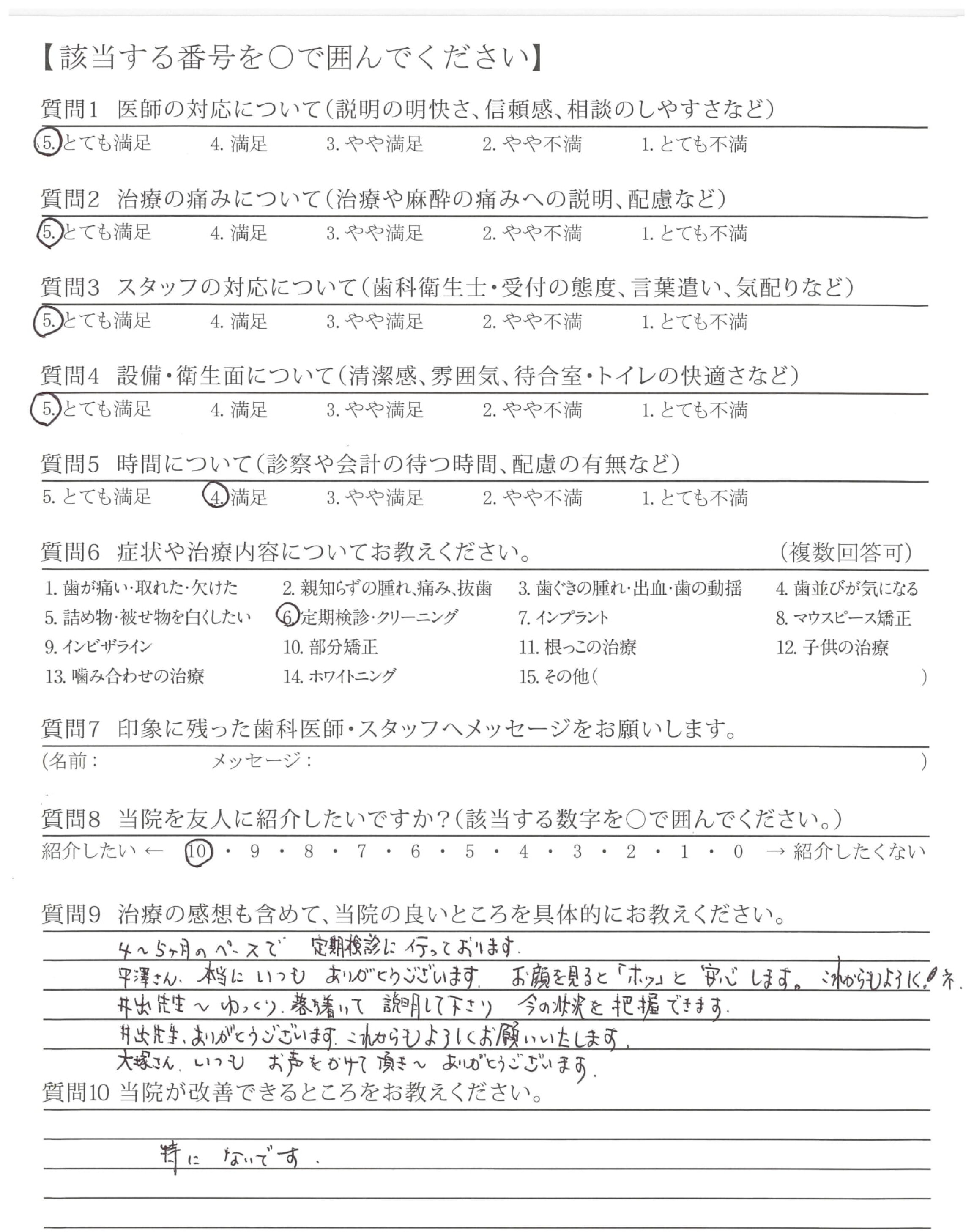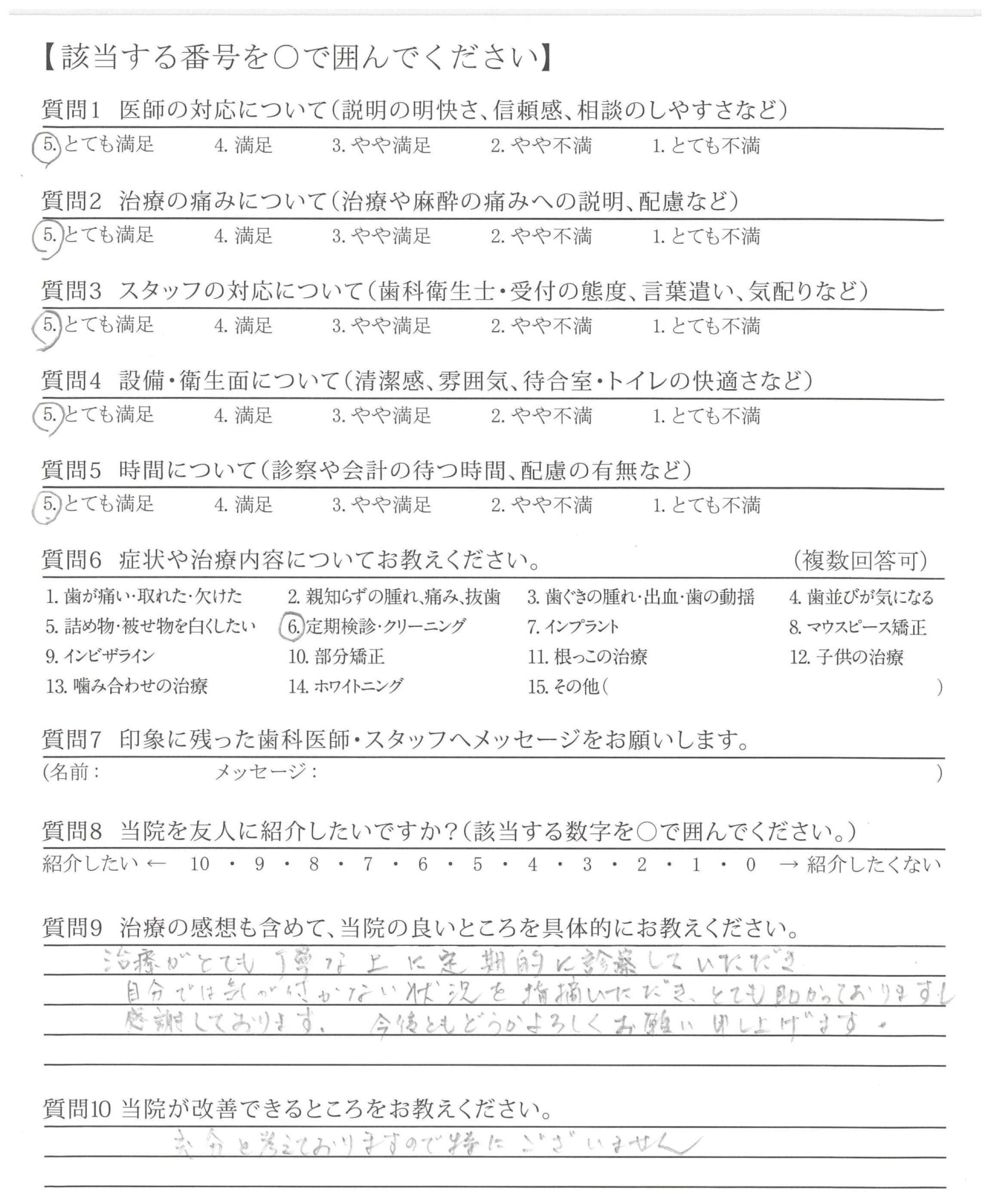 治療がとても丁寧な上に定期的に診察していただき自分では気が付かない状況を指摘いただき、とても助かっておりますし感謝しております。今後ともどうかよろしくお願い申し上げます。