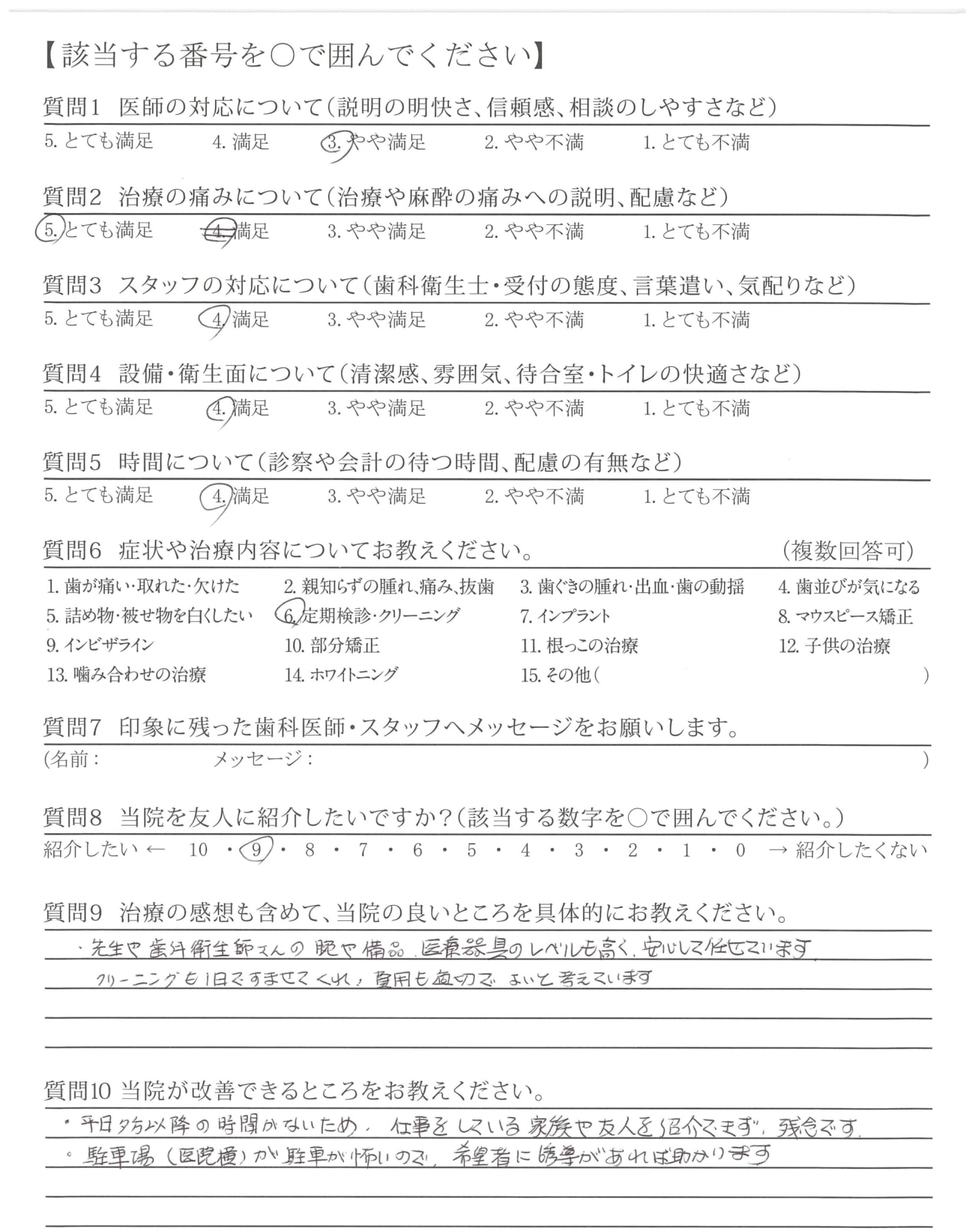 ・先生や歯科衛生師さんの腕や備品、医療器具のレベルも高く、安心して任せています。