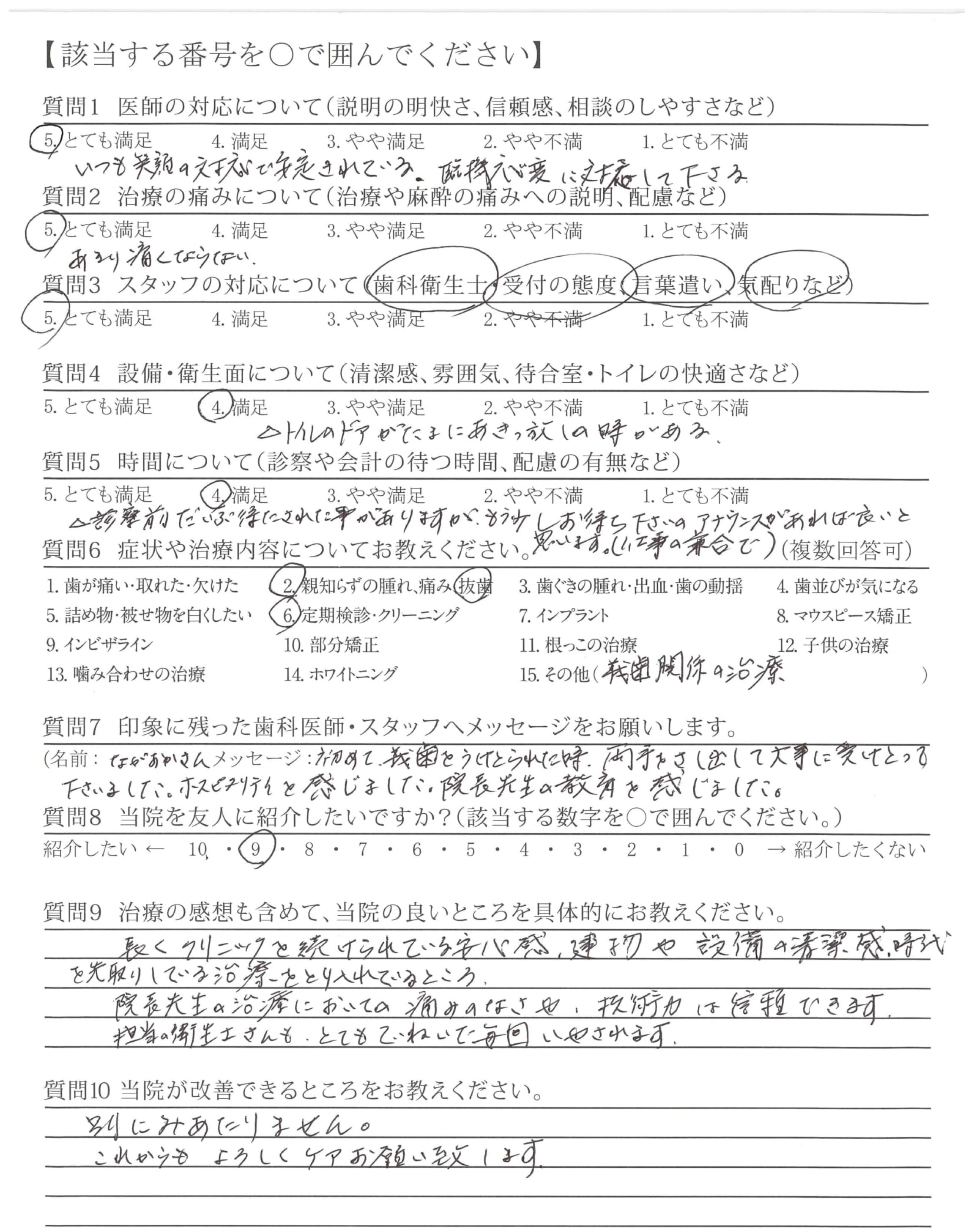 初めて、義歯をうけとられた時、両手をさし出して大事に受けとって下さいました。ホスピタリティを感じました。院長先生の教育を感じました。