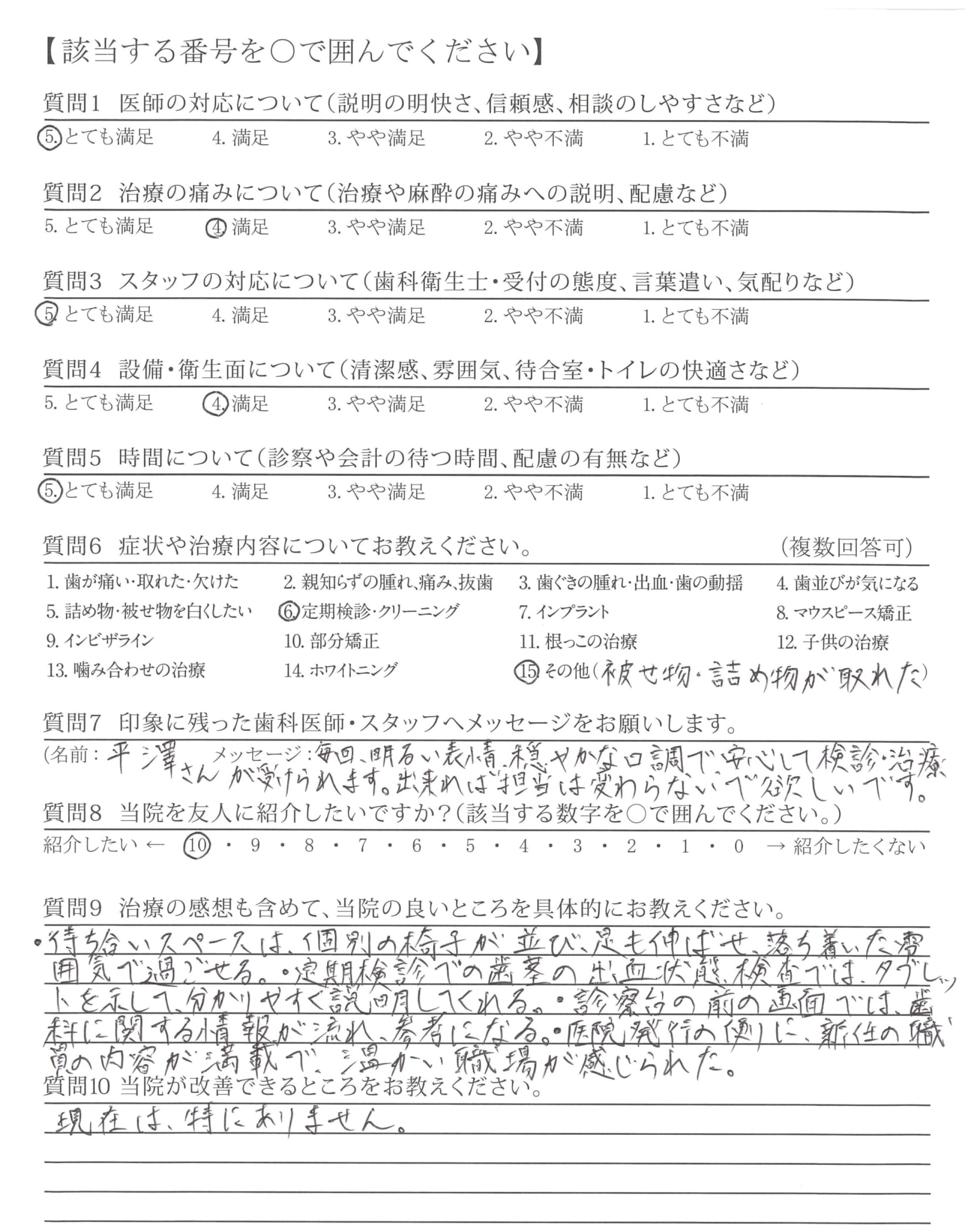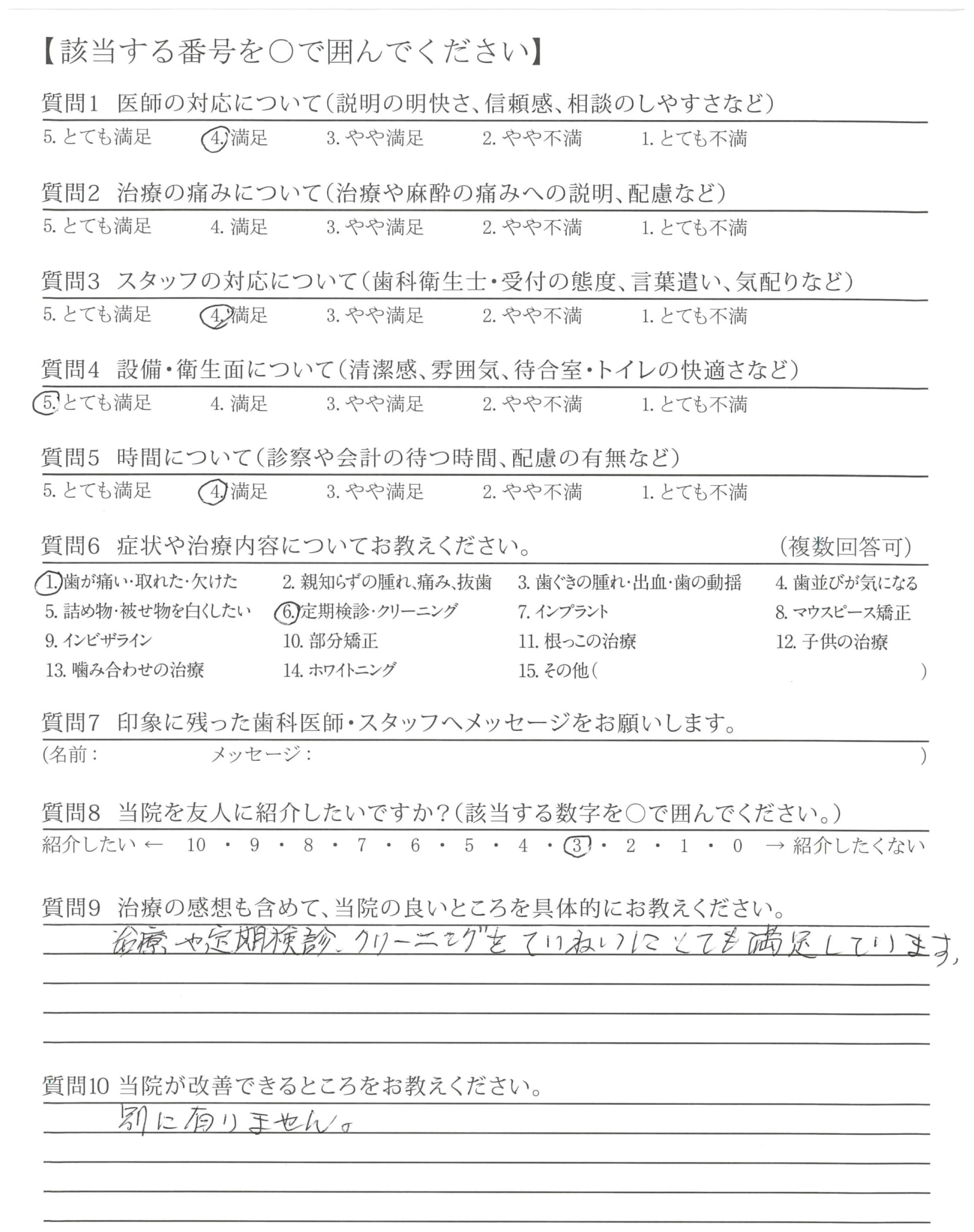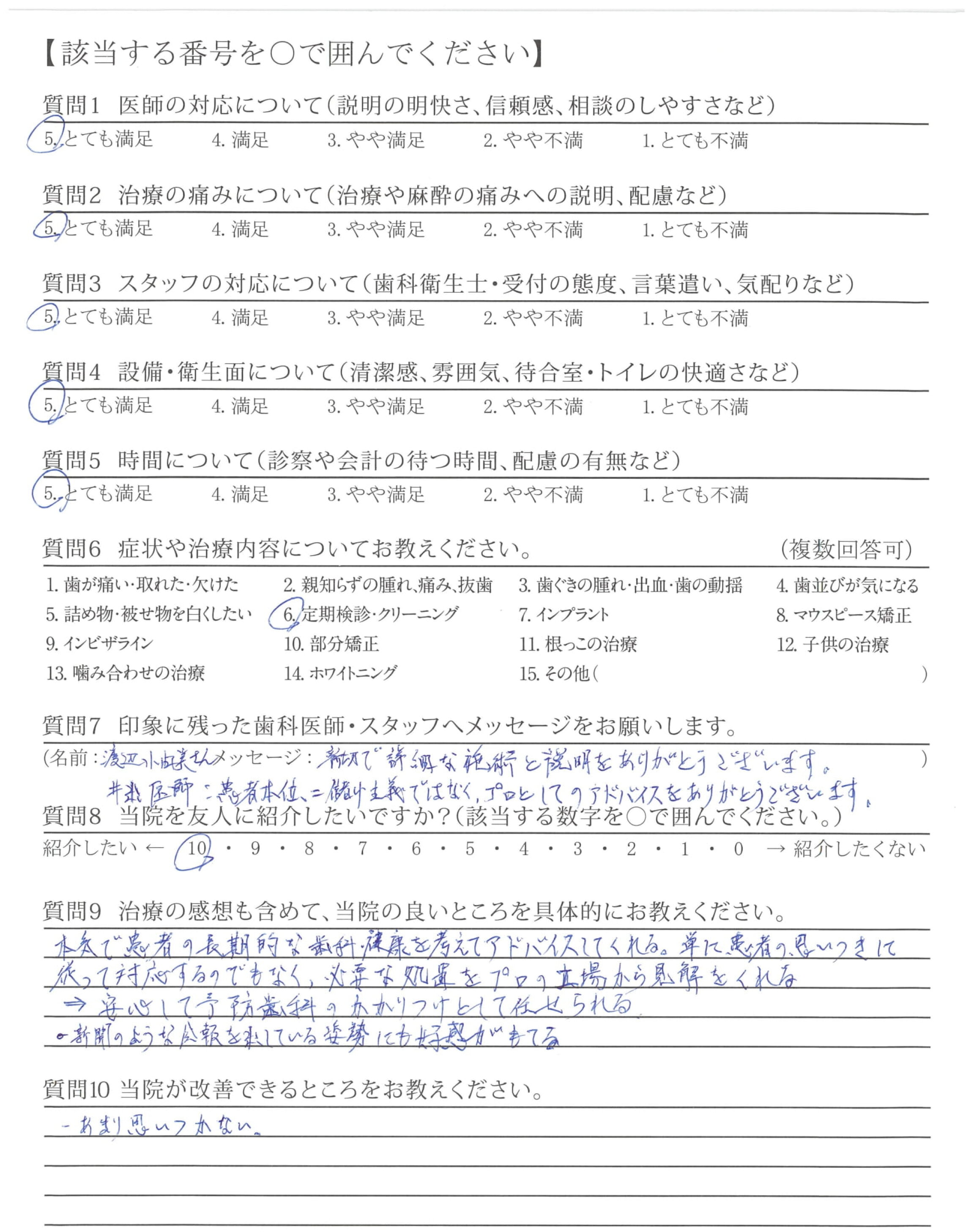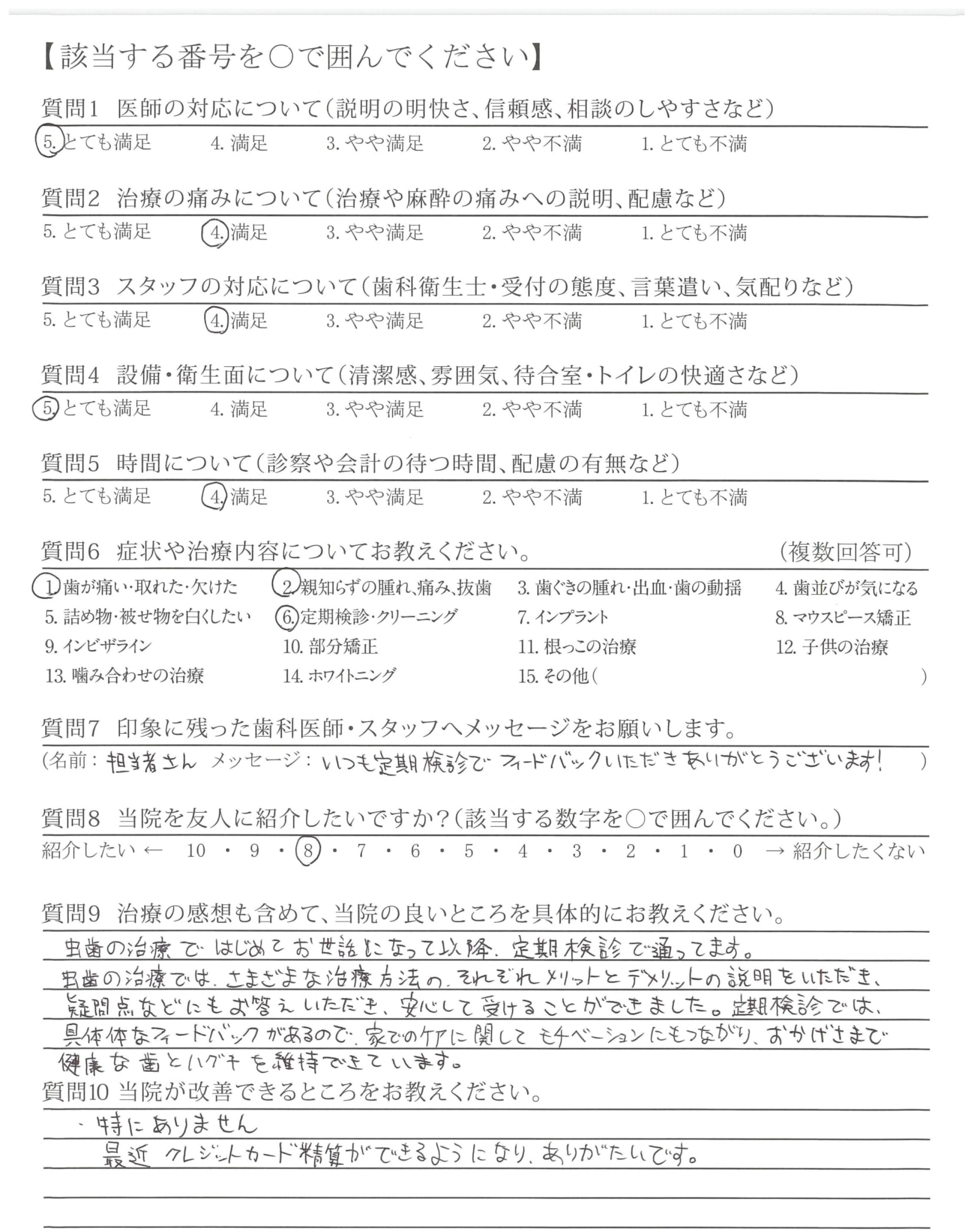 定期検診で前回のデータを見ながらのアドバイス(奥歯のみがき方やフロスの使い方等)がとても良かったです。お陰様で歯ぐきの状態がとても良くなりました。