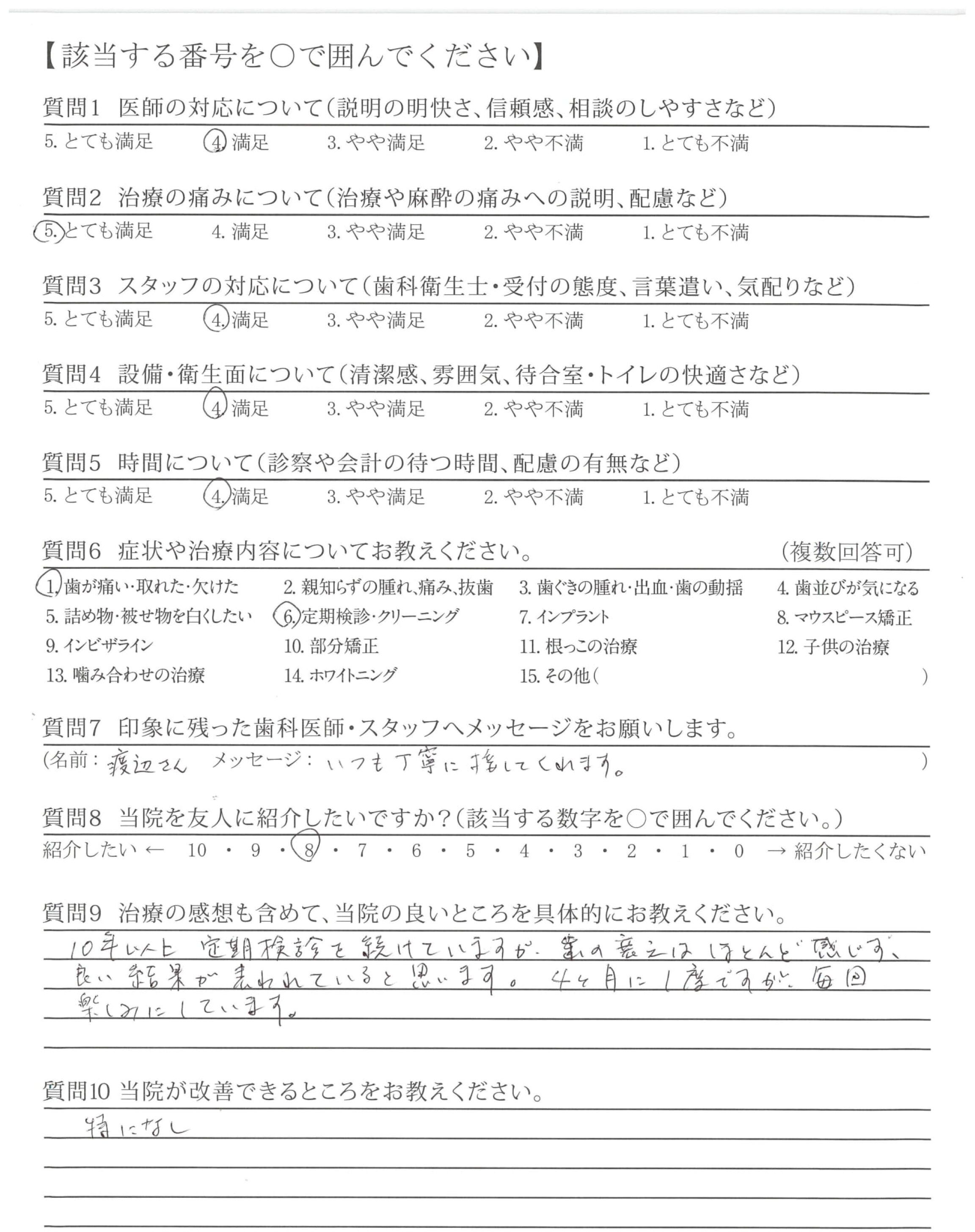 10年以上、定期検診を続けていますが、歯の衰えはほとんど感じず、良い結果が表われていると思います。4ヶ月に1度ですが、毎回楽しみにしています。