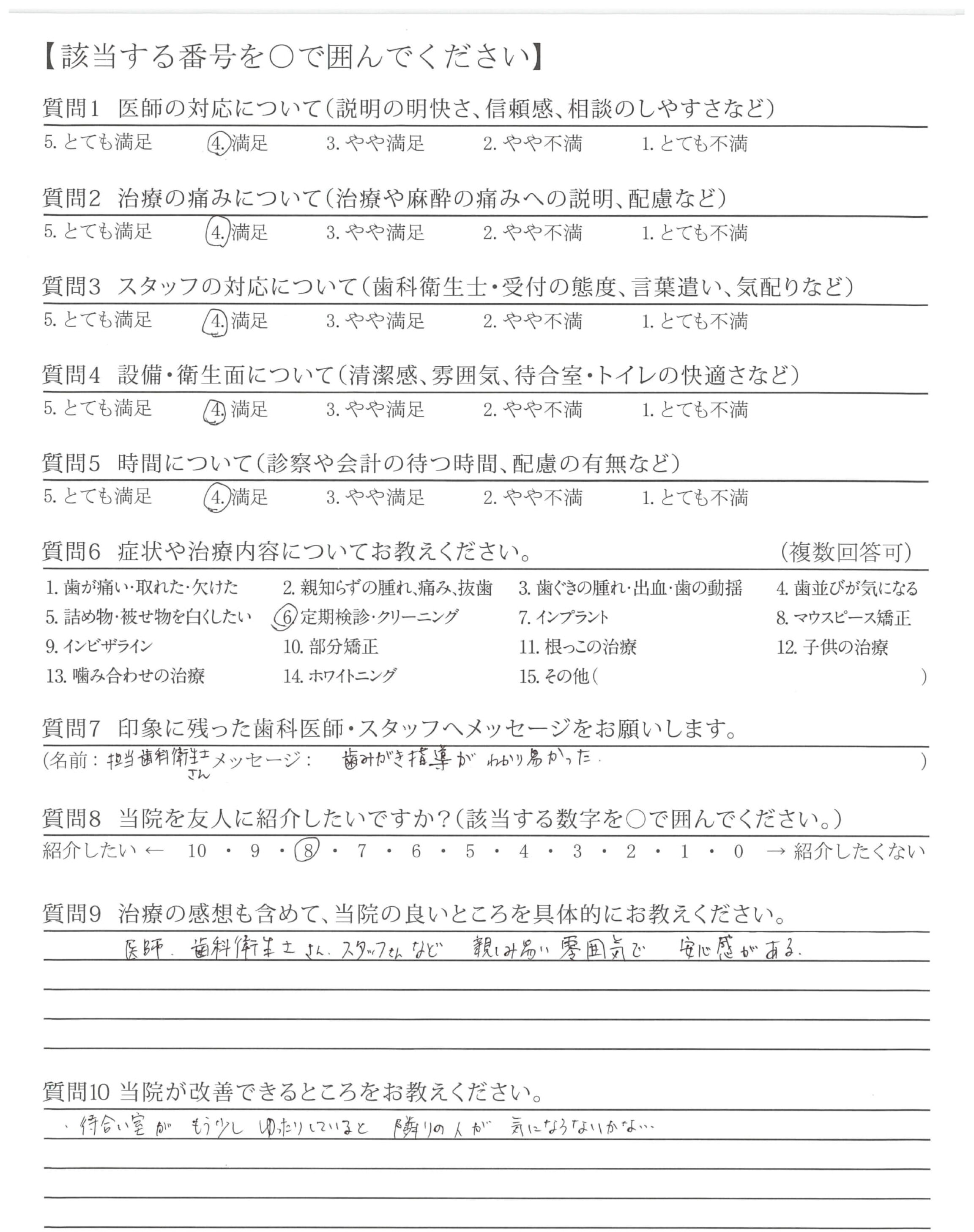 いつもお口の中の状態を詳しく教えて頂き、話しやすいため安心して通えています。
