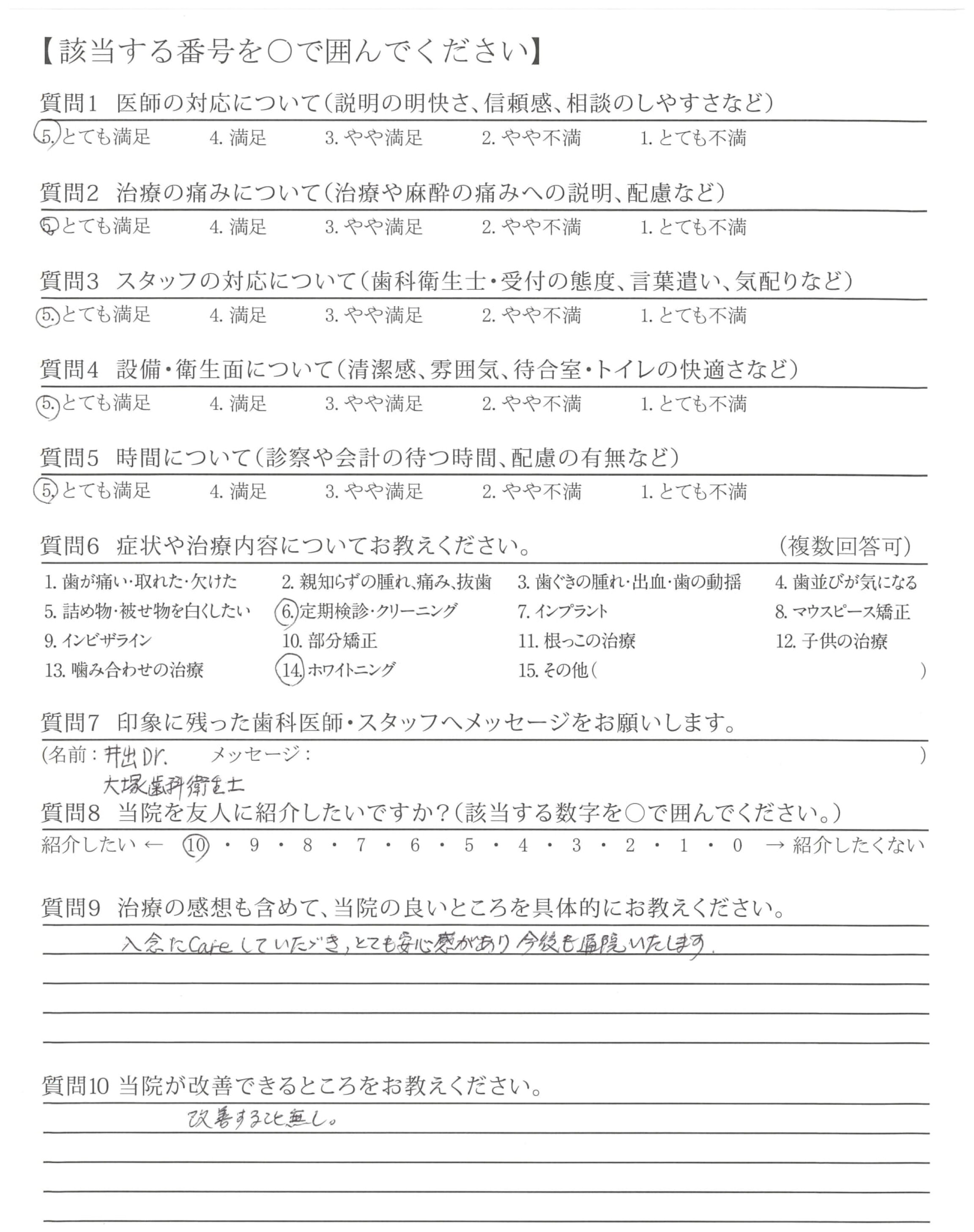 毎回、明るい表情、穏やかな口調で、安心して検診・治療が受けられます。出来れば担当は変わらないで欲しいです。