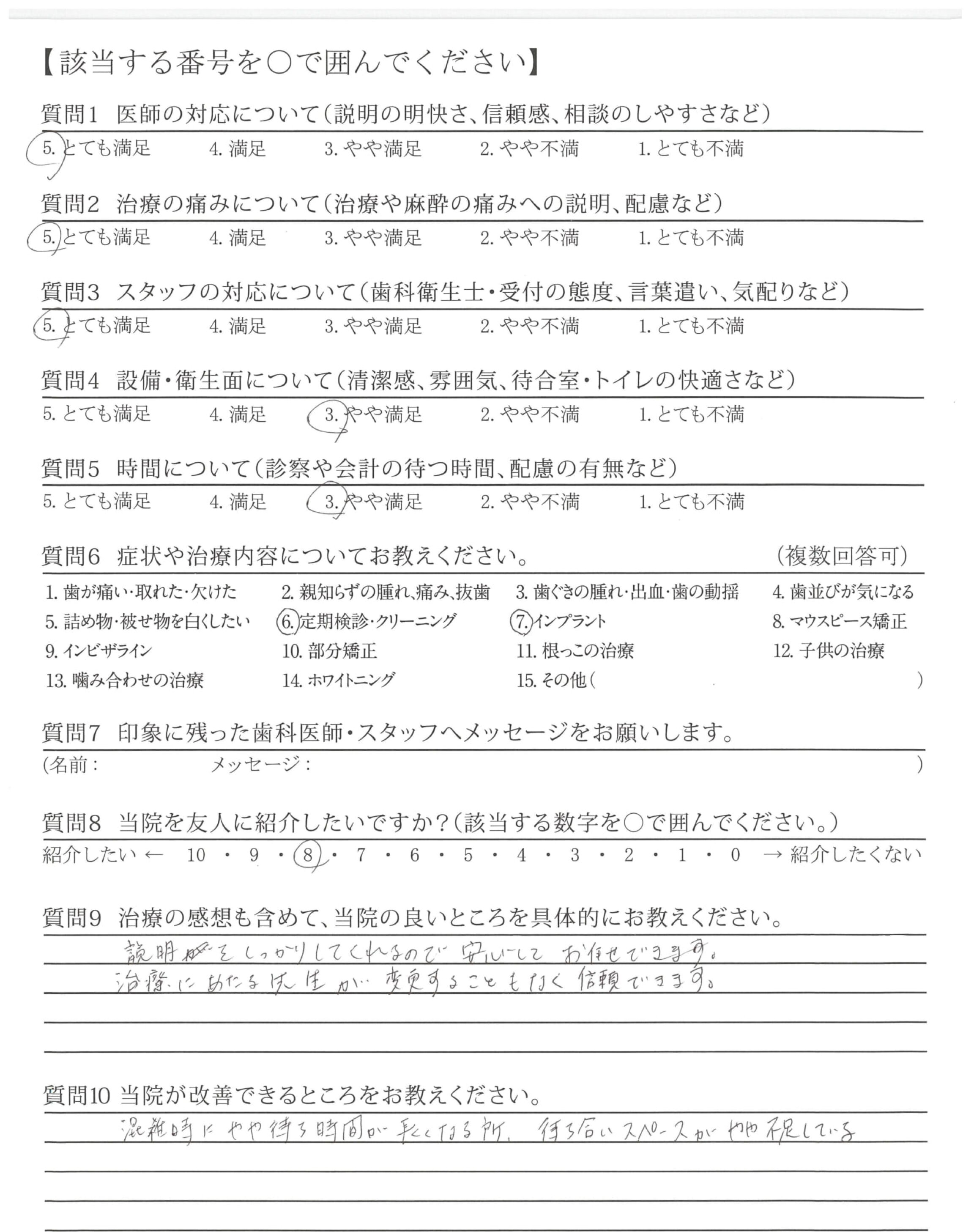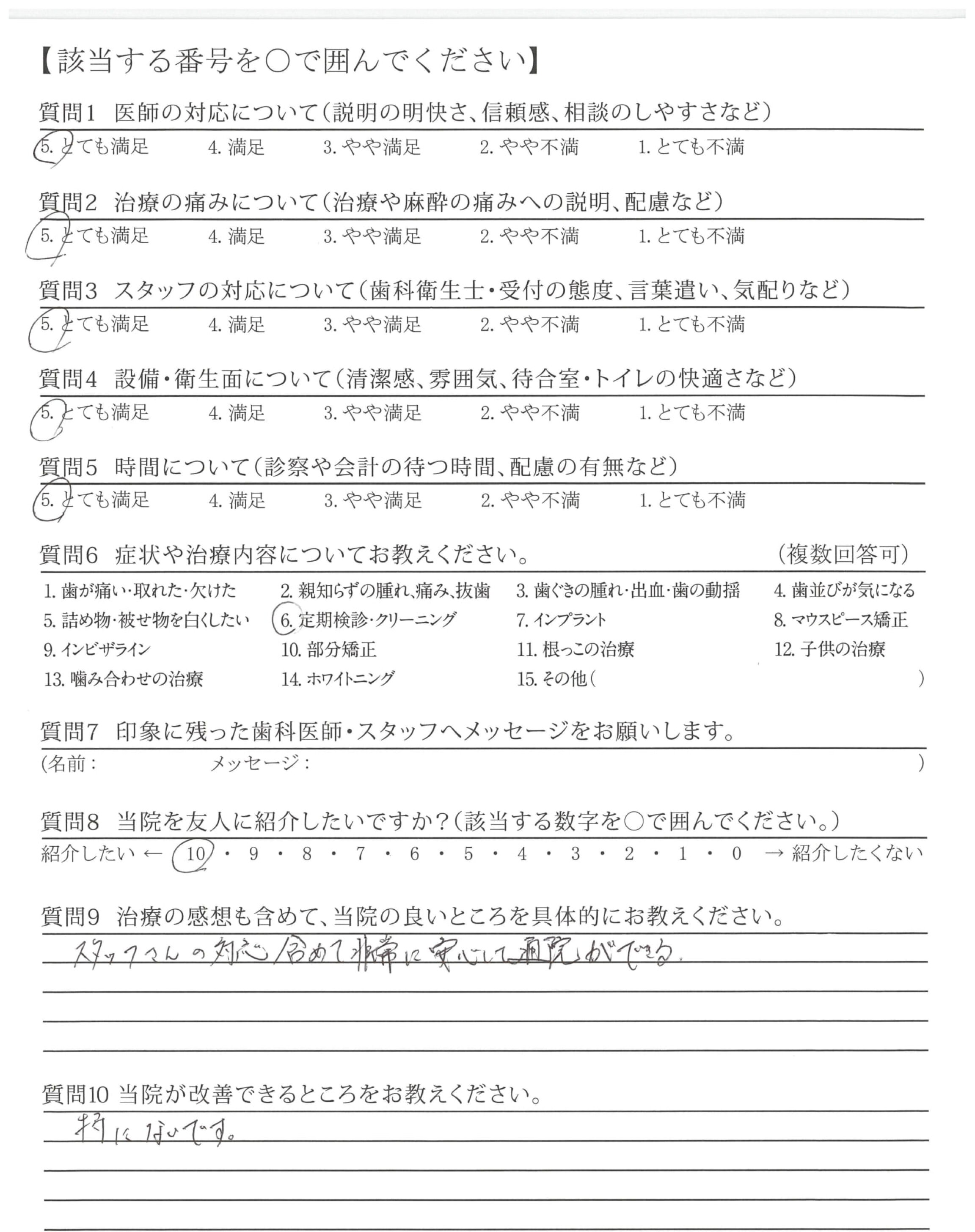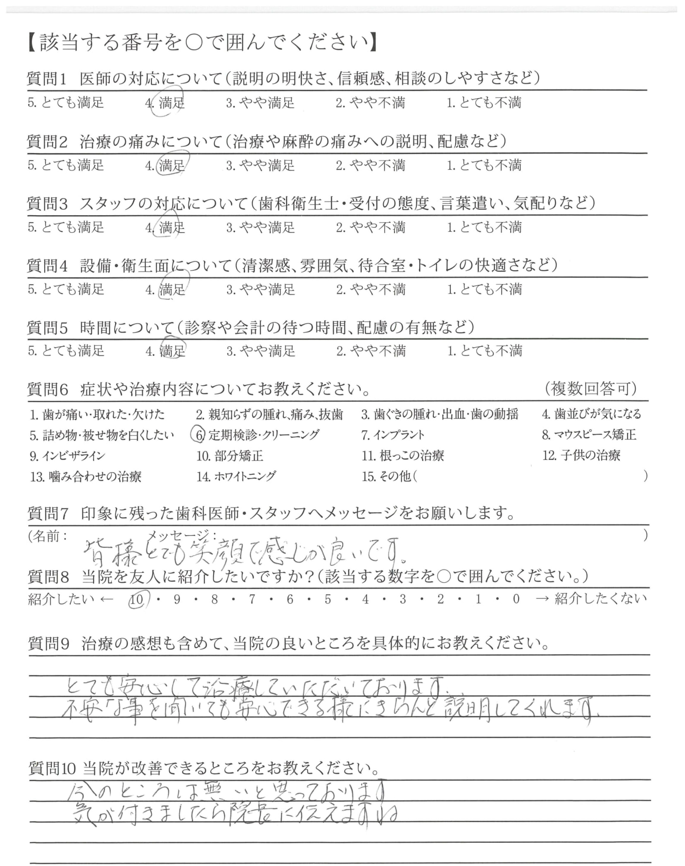今は治療も終わり、定期検診のみですが、その際も丁寧なクリーニングとしっかり磨けていない部分の歯ブラシの当て方、磨き方の提案などとても助かっています。