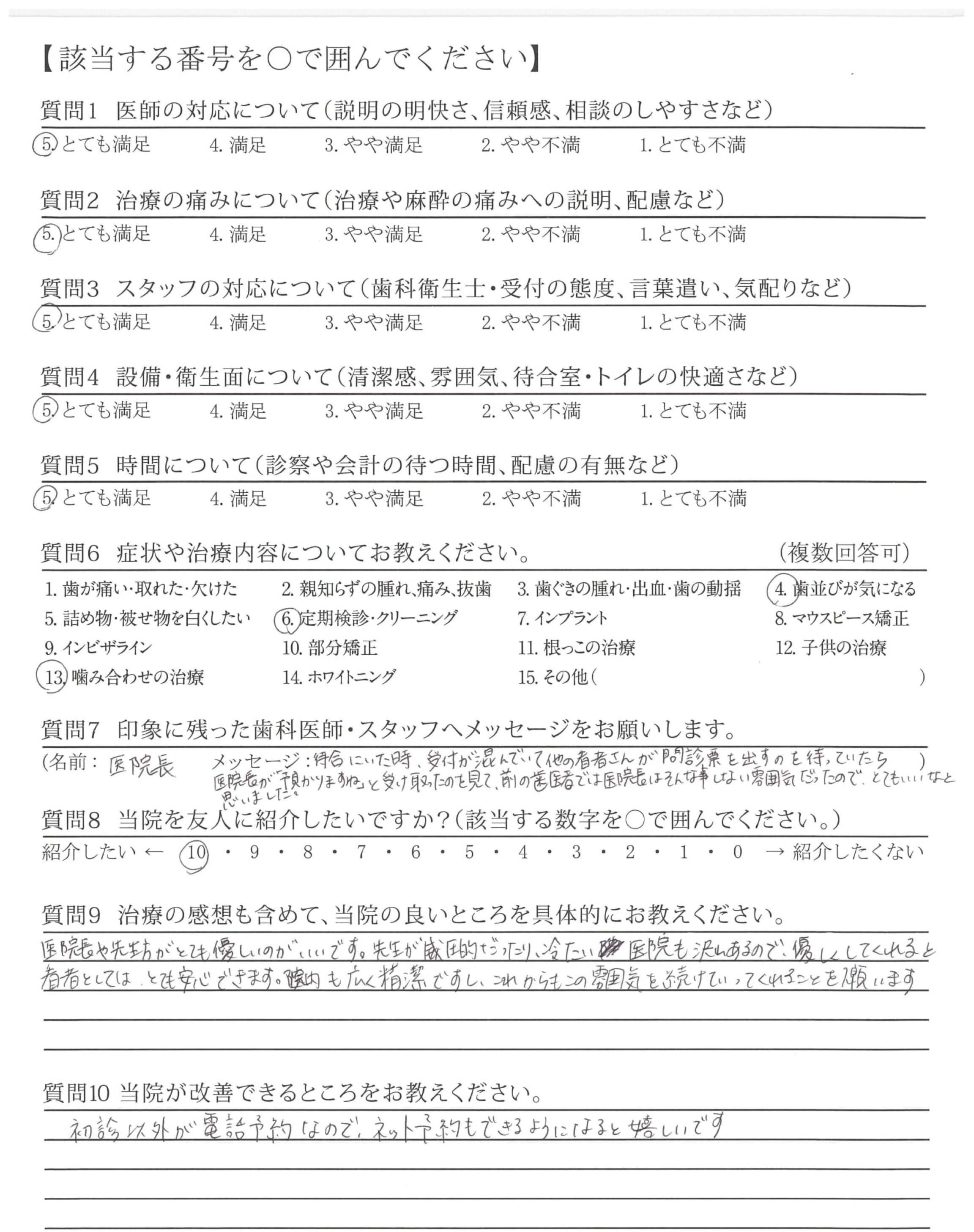 待合にいた時、受付が混んでいて他の看者さんが問診票を出すを待っていたら医院長が「預かりますね」と受け取ったのを見て、前の歯医者では医院長はそんな事しない雰囲気だったので、とてもいいなと思いました。