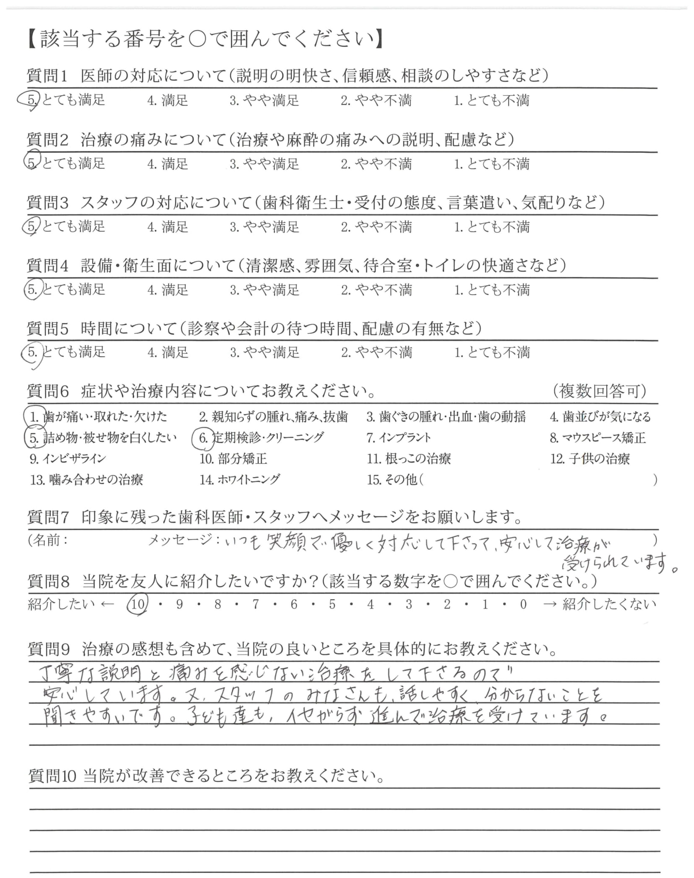 丁寧な説明と痛みを感じない治療をして下さるので安心しています。又、スタッフのみなさんも、話しやすく、分からないことを聞きやすいです。子ども達も、イヤがらず進んで治療を受けています。