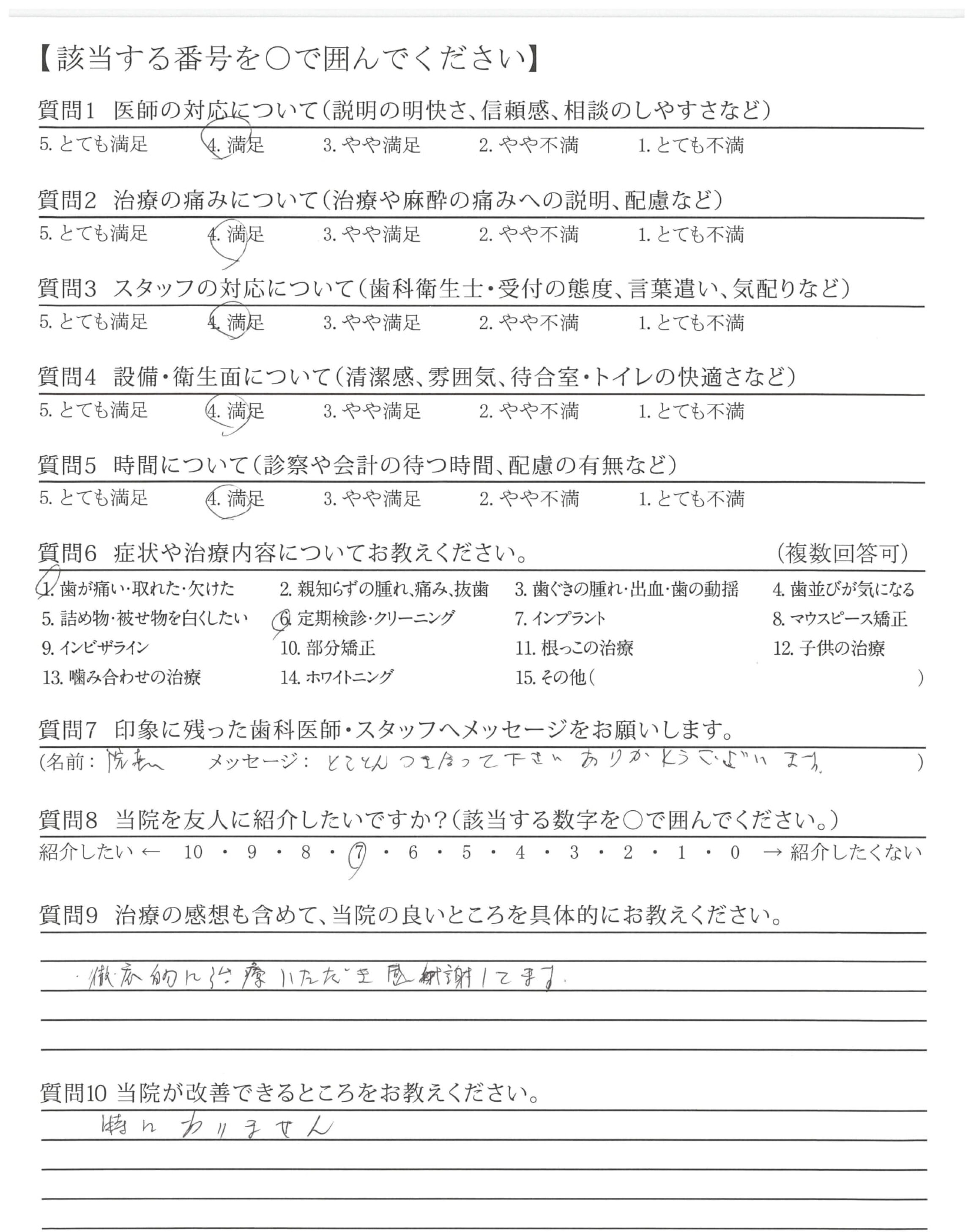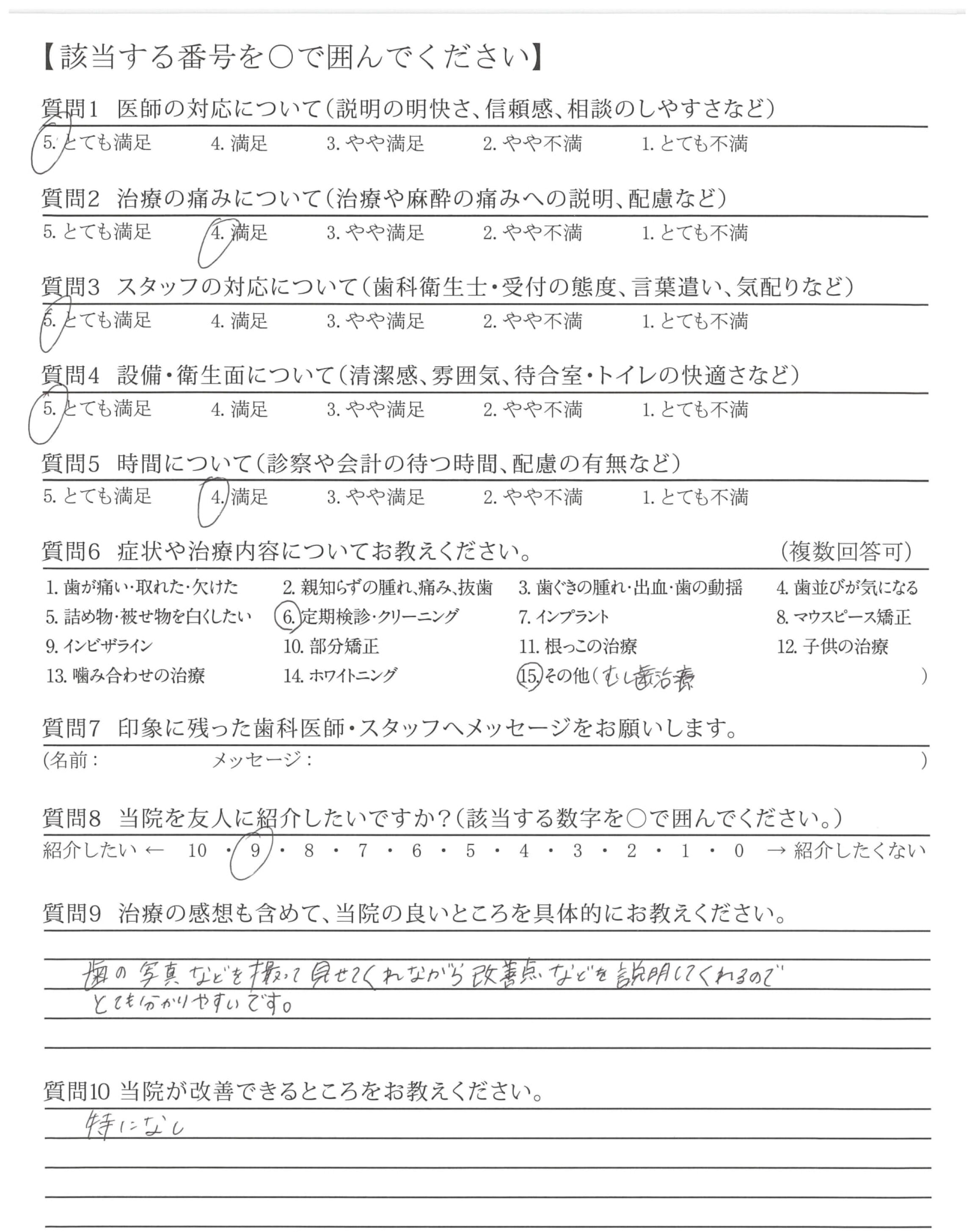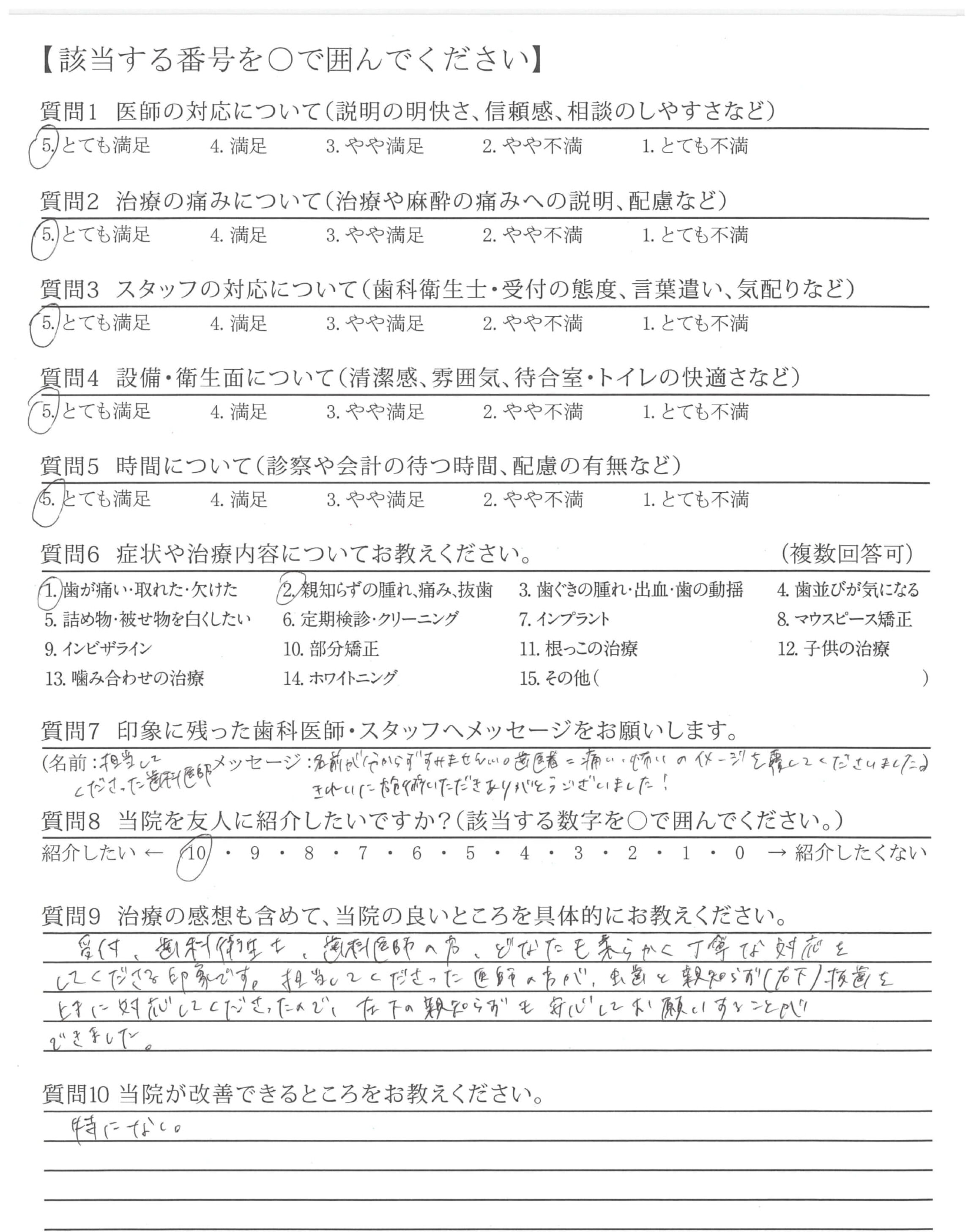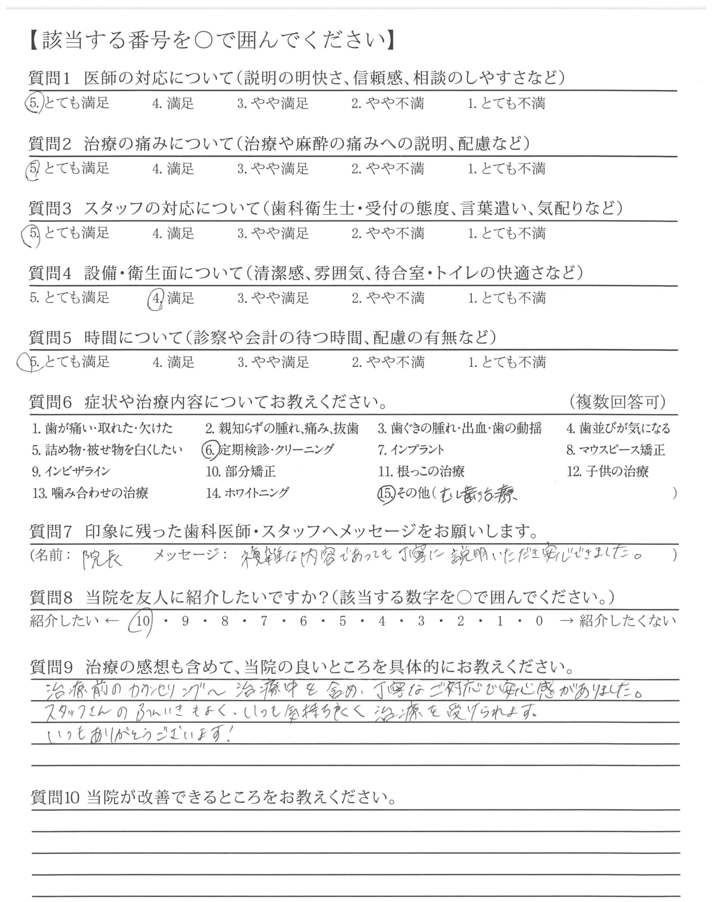 治療やその他ご対応において全て丁寧にしていただきありがとうございました。