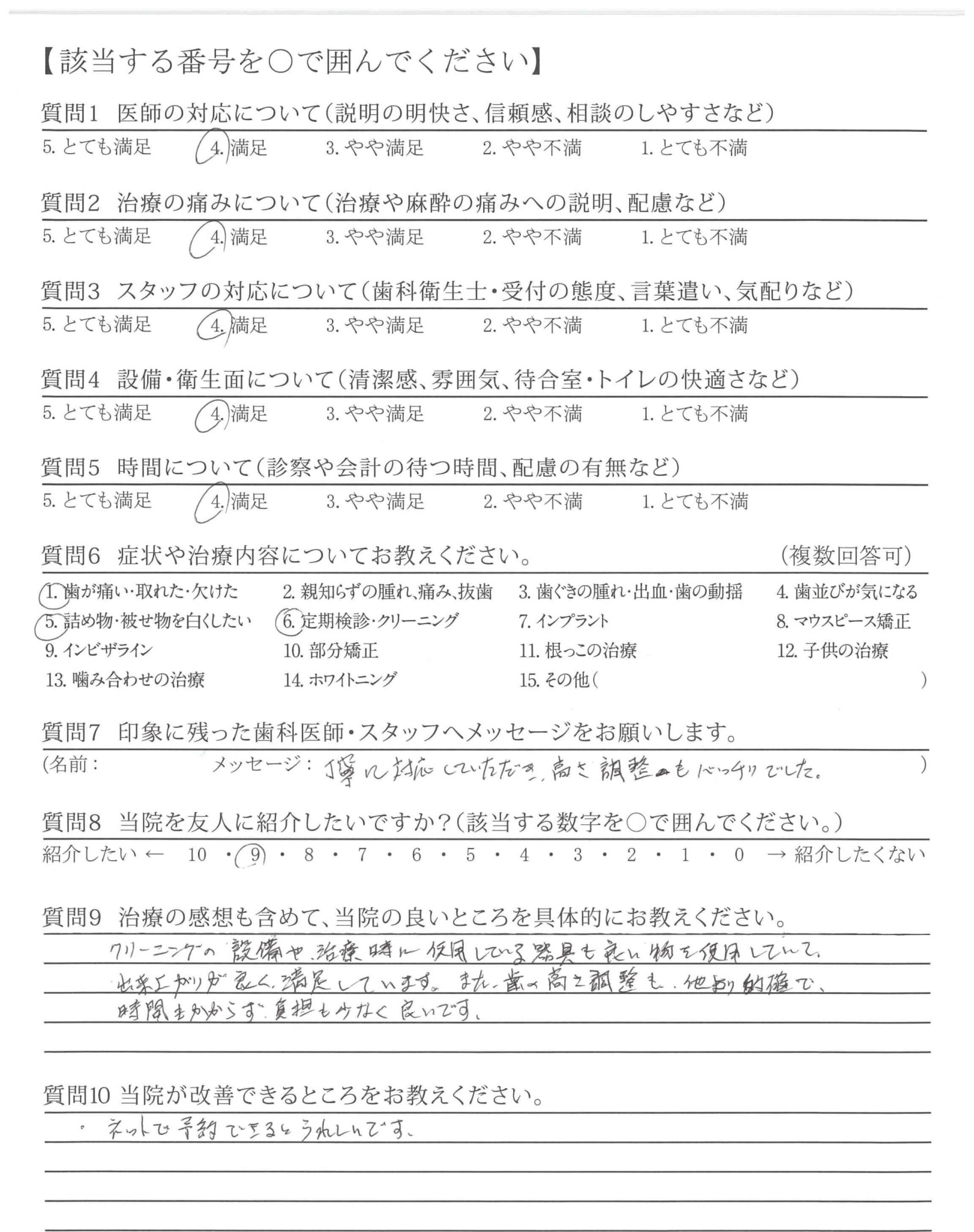 クリーニングの設備や、治療時に使用している器具も良い物を使用していて、出来上がりが良く、満足しています。また、歯の高さ調整も、他より的確で、時間もかからず負担も少なく良いです。