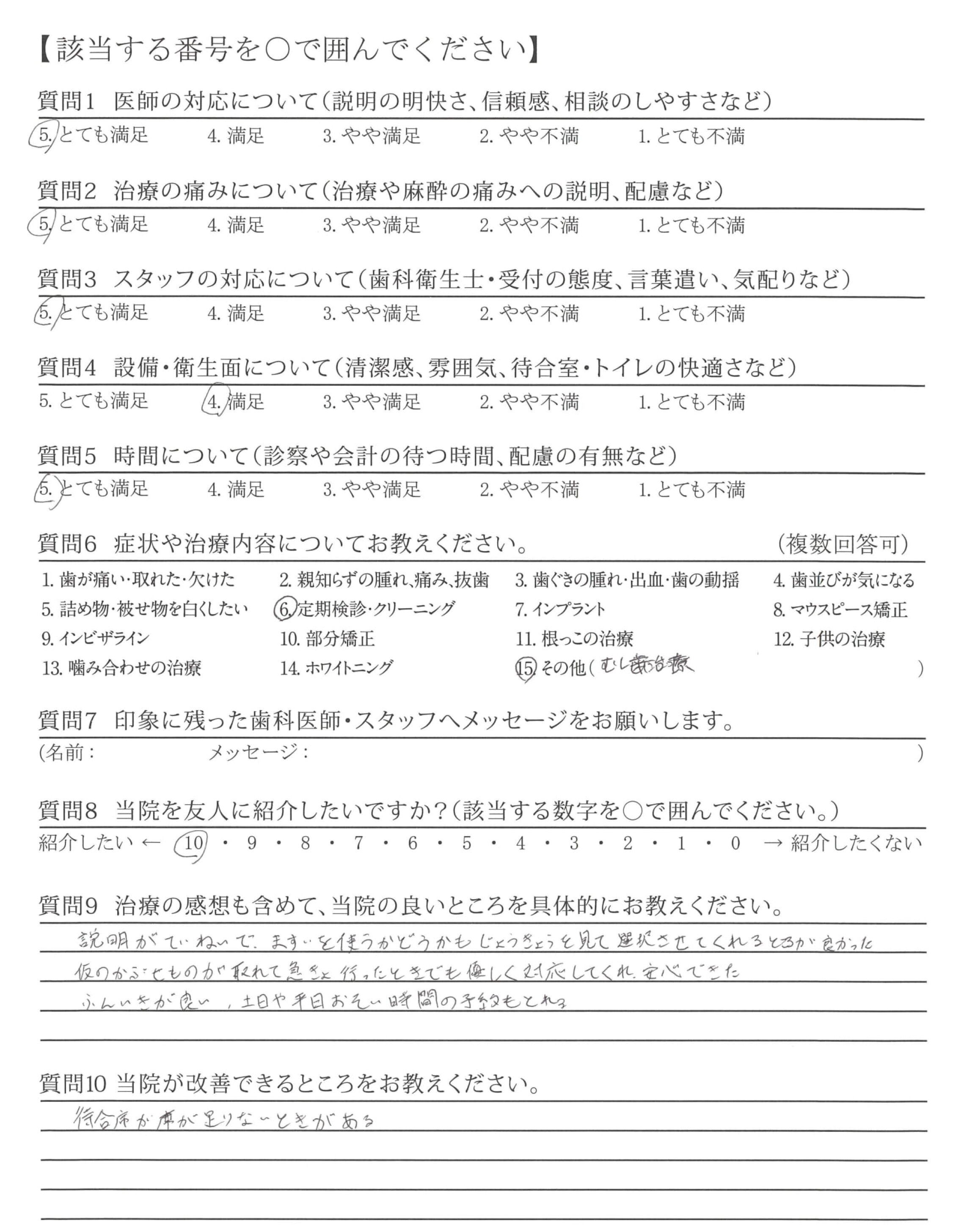 なるべく痛みや不安を感じさせないように治療して下さり、安心出来ました。いつもありがとうございます。