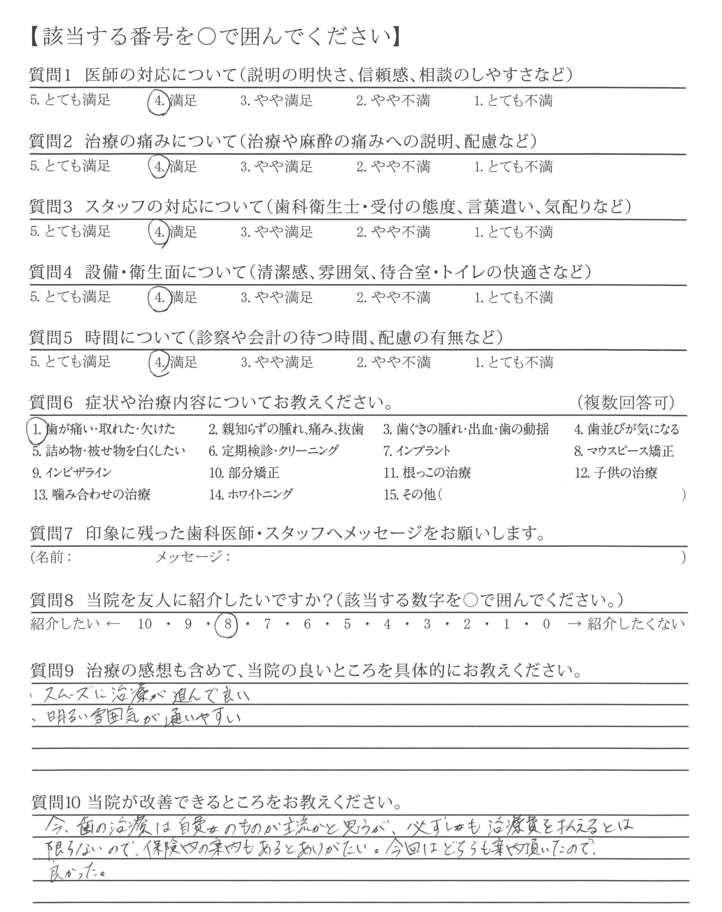 映像やレントゲンで治療の経過が明確に説明いただけたので進捗や悪いところが良くわかり判断がし易かった。また私の都合で数本まとめて治療していただいたり要望も良く聞いていただき、早く治療が進んだのがありがたかった。
