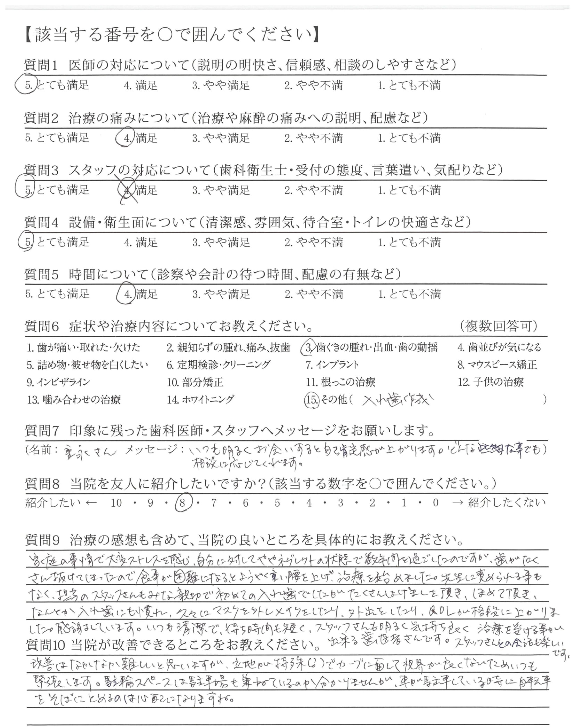 家庭の事情で大変ストレスを感じ、自分に対してややネグレクトの状態で数年間を過ごしたのですが、歯がたくさん抜けてしまったので食事が困難になるとようやく重い腰を上げ、治療を始めました。先生に責められる事もなく、担当のスタッフさんもみな親切で初めての入れ歯でしたがたくさんはげましを頂き、ほめて頂き、なんとか入れ歯にも慣れ、久々にマスクを外しメイクをしたり、外出をしたり、QOLが格段に上がりました。感謝しています。いつも清潔で、待ち時間も短く、スタッフさんも明るく気持ち良く治療を受ける事が出来る歯医者さんです。スタッフさんとの会話も楽しいです。