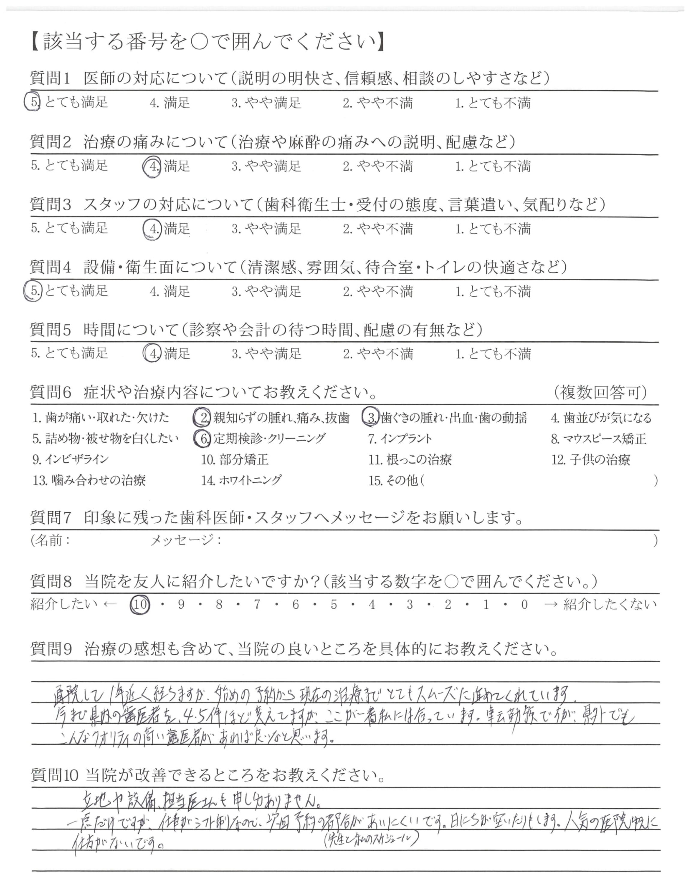 当院は、初めて痛みがすくないと、クチコミに書いてあり、きになった為通院しました。そしたら、クチコミ通りでびっくりして、先生方も、やさしく丁寧で、よかったです。