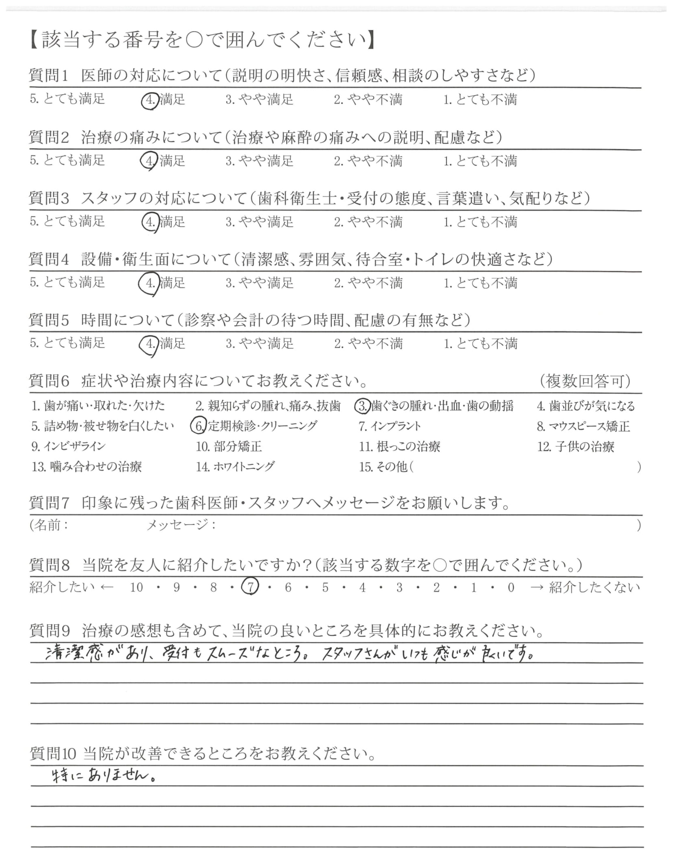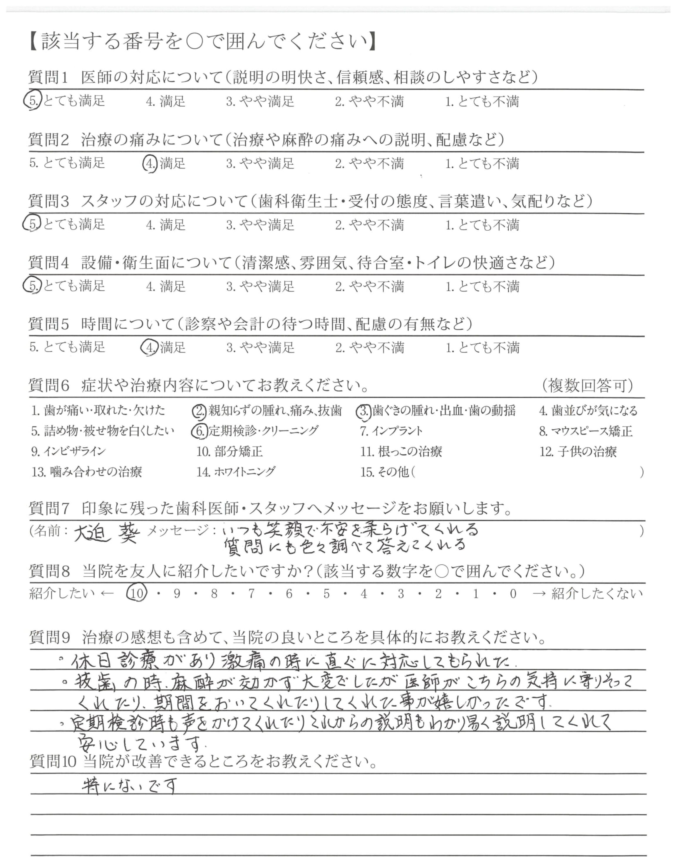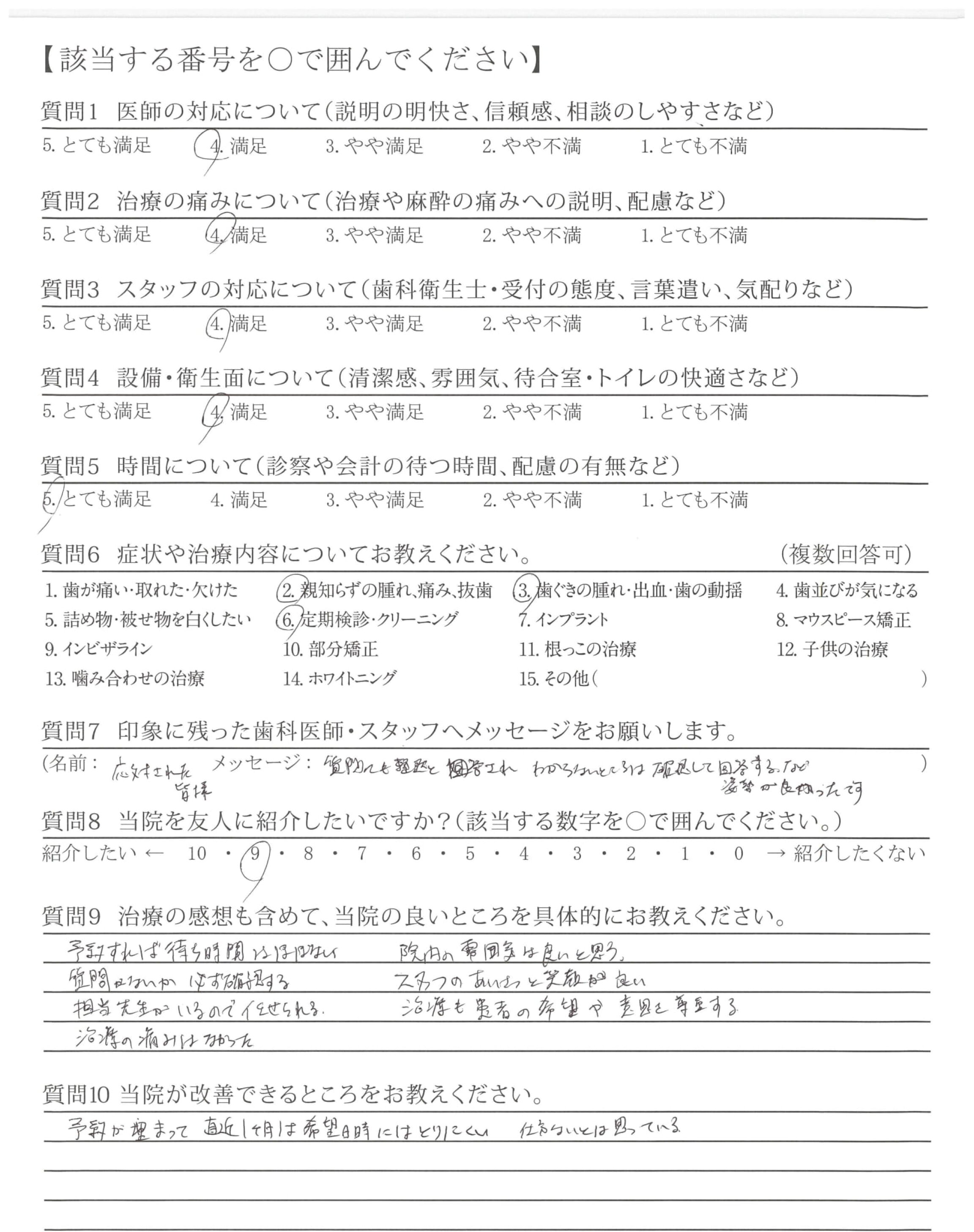 ・抜歯の時、麻酔が効かず大変でしたが医師がこちらの気持に寄りそってくれたり、期間をおいてくれたりしてくれた事が嬉しかったです。