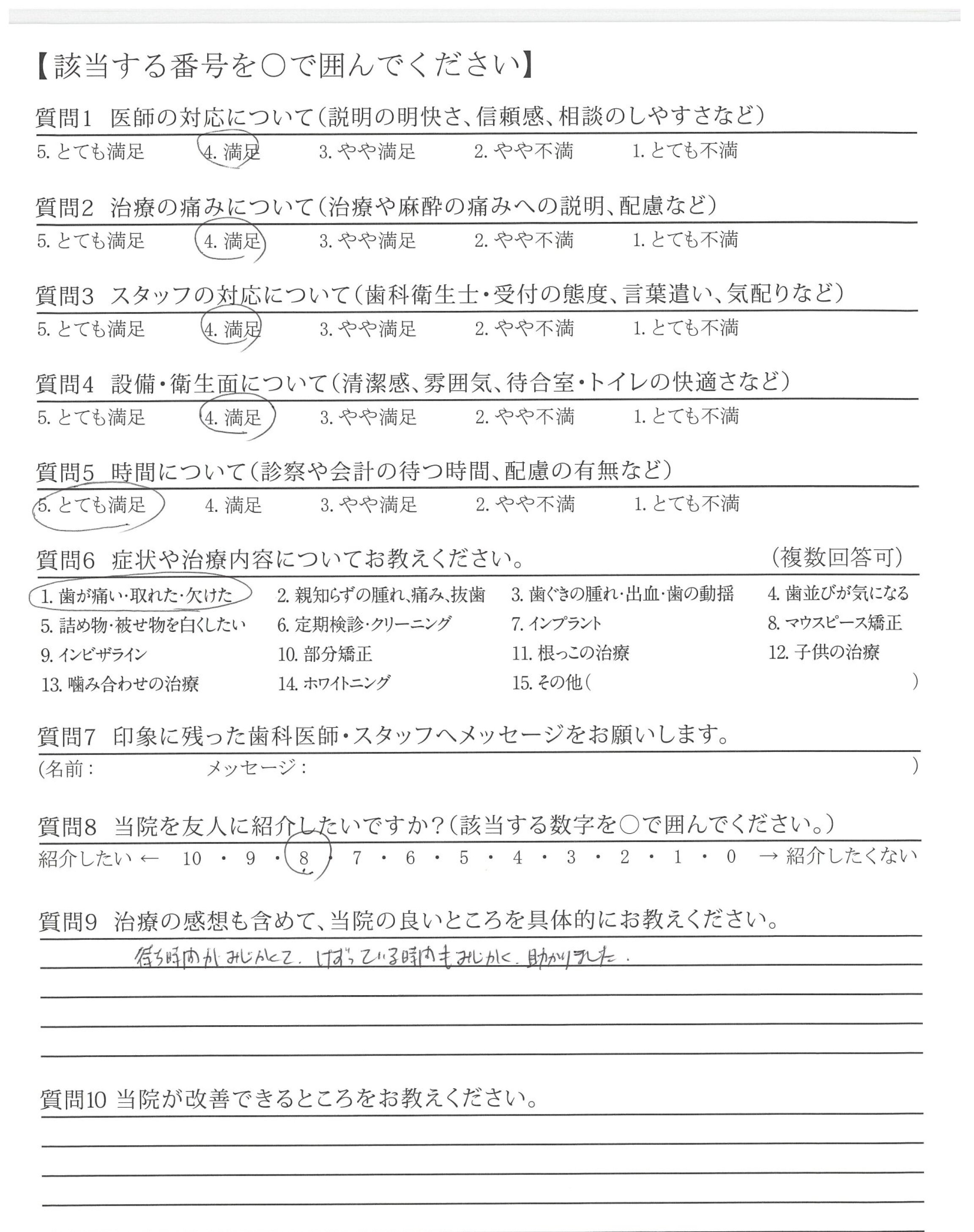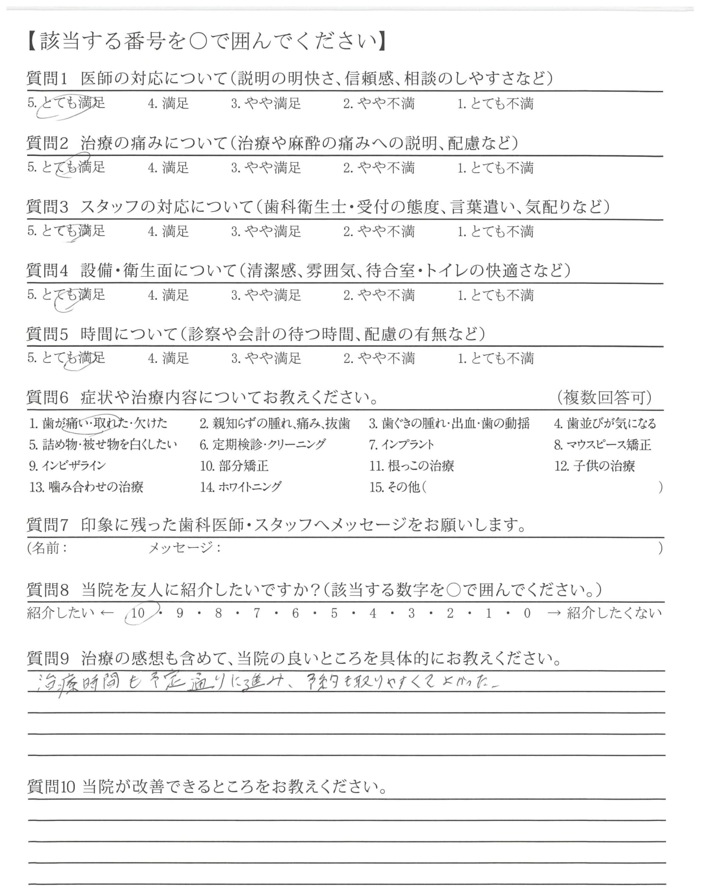 長い間の治療ありがとうございました。快適にすごせるようになり、大変感謝しています。