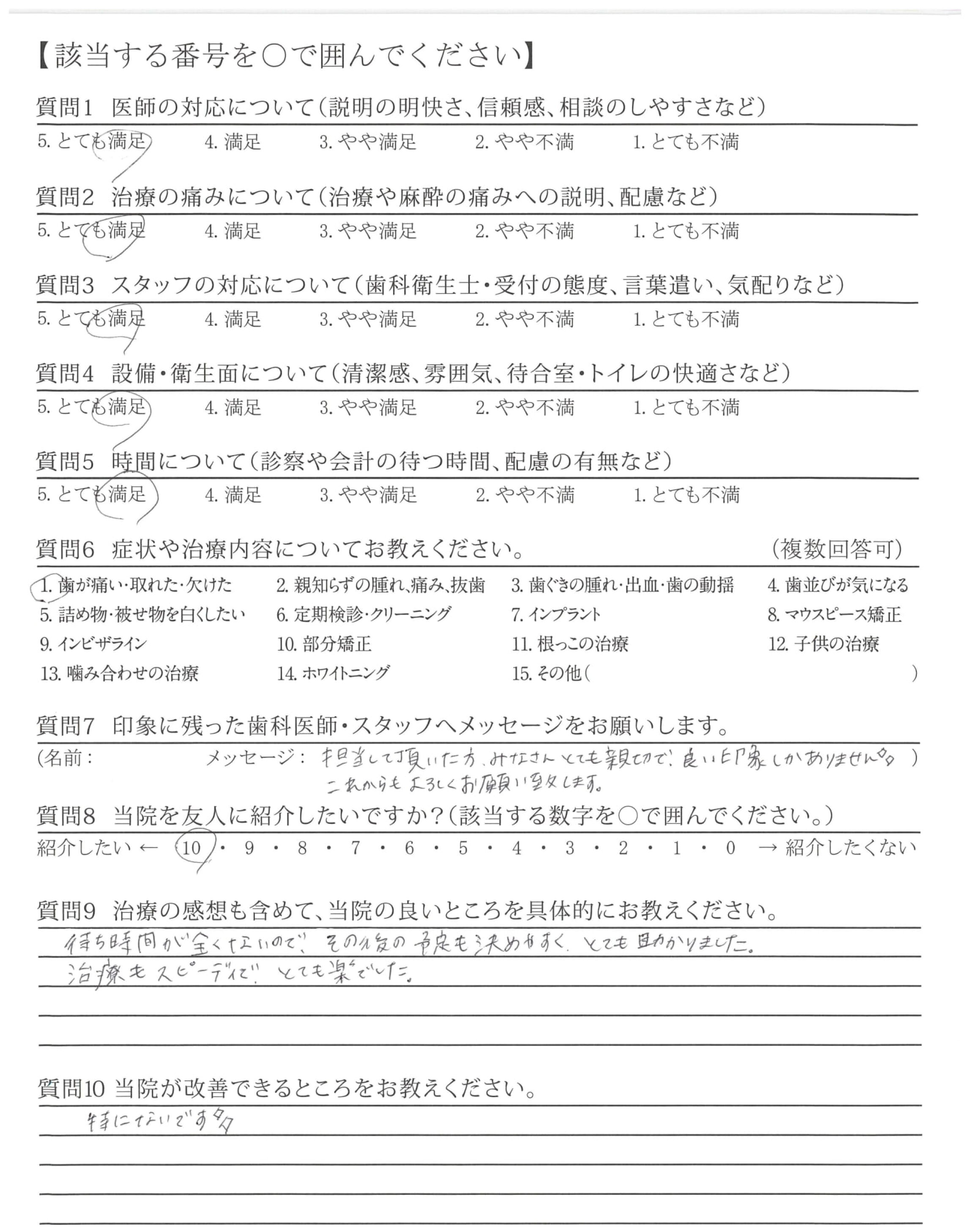 最新の治療で、いい意味で合理的なところが良かったです。また痛みが治療中全然なく、辛い思いをしませんでした。