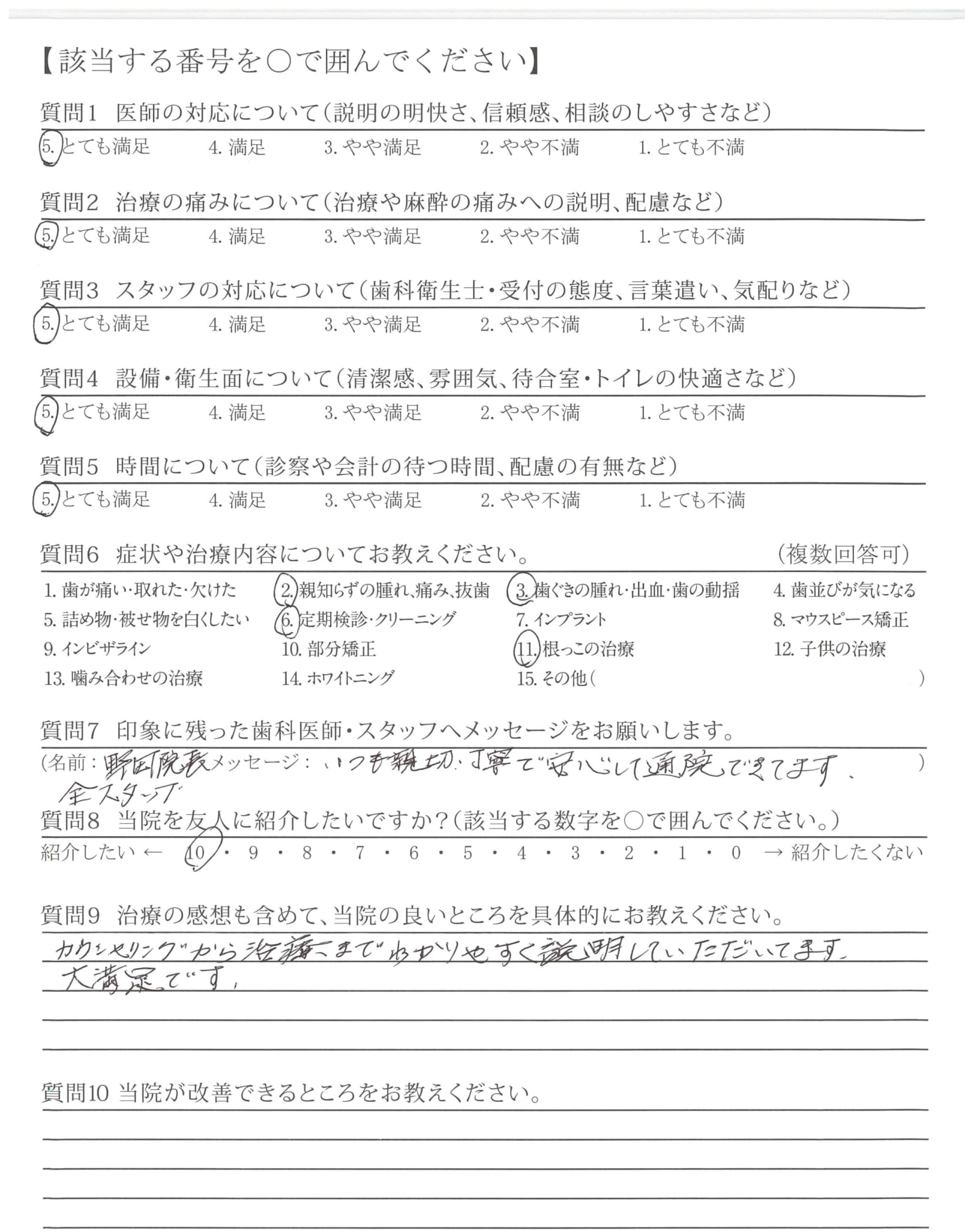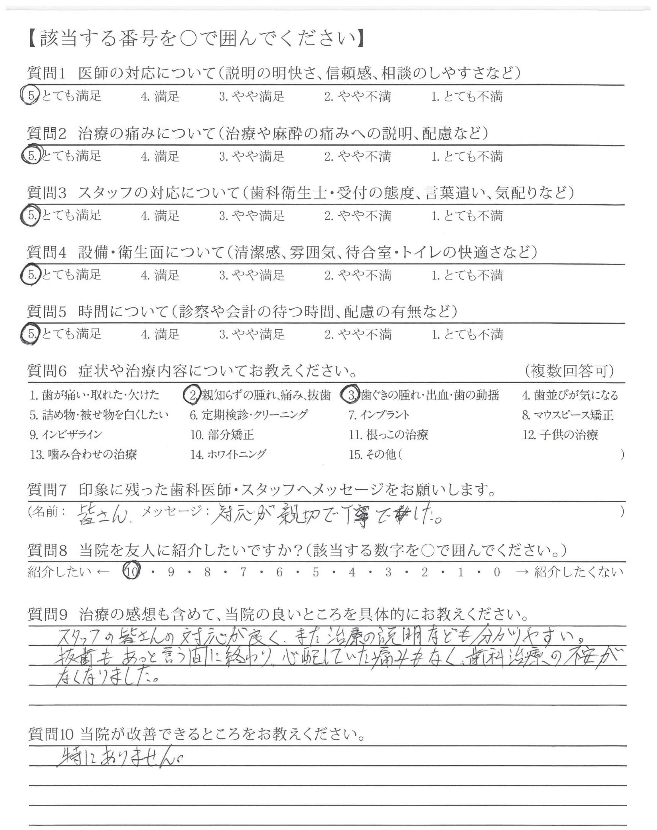抜歯もあっと言う間に終わり、心配していた痛みもなく、歯科治療の不安がなくなりました。