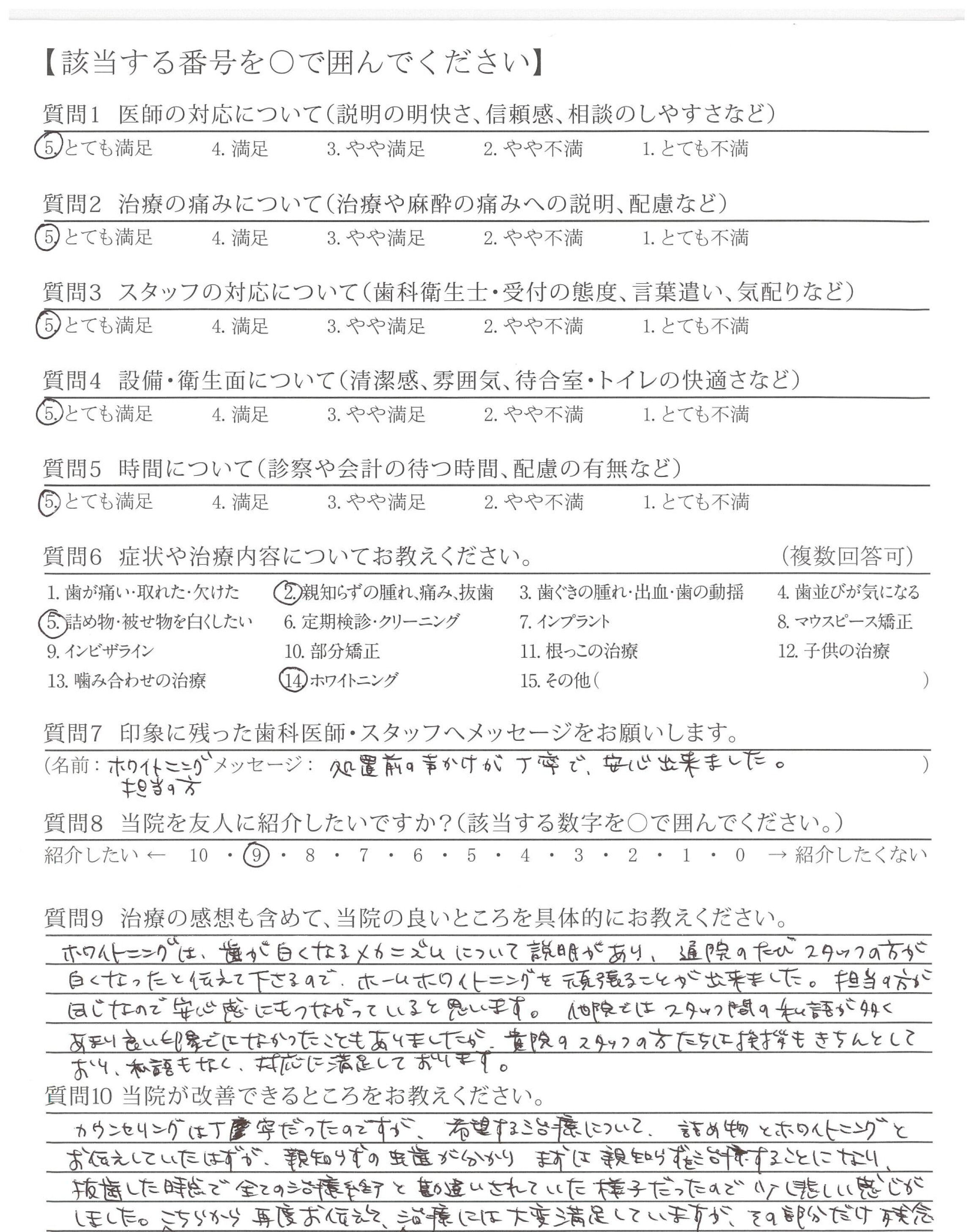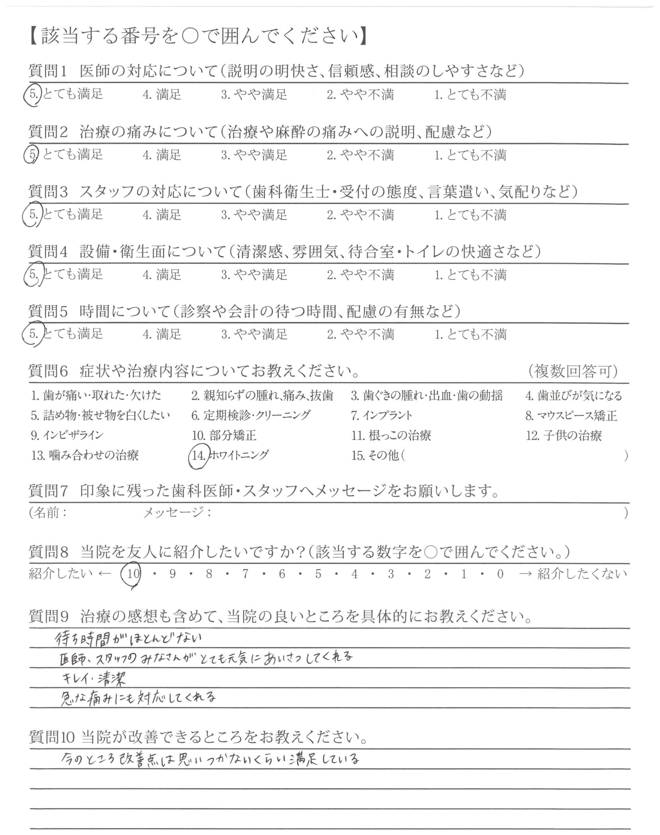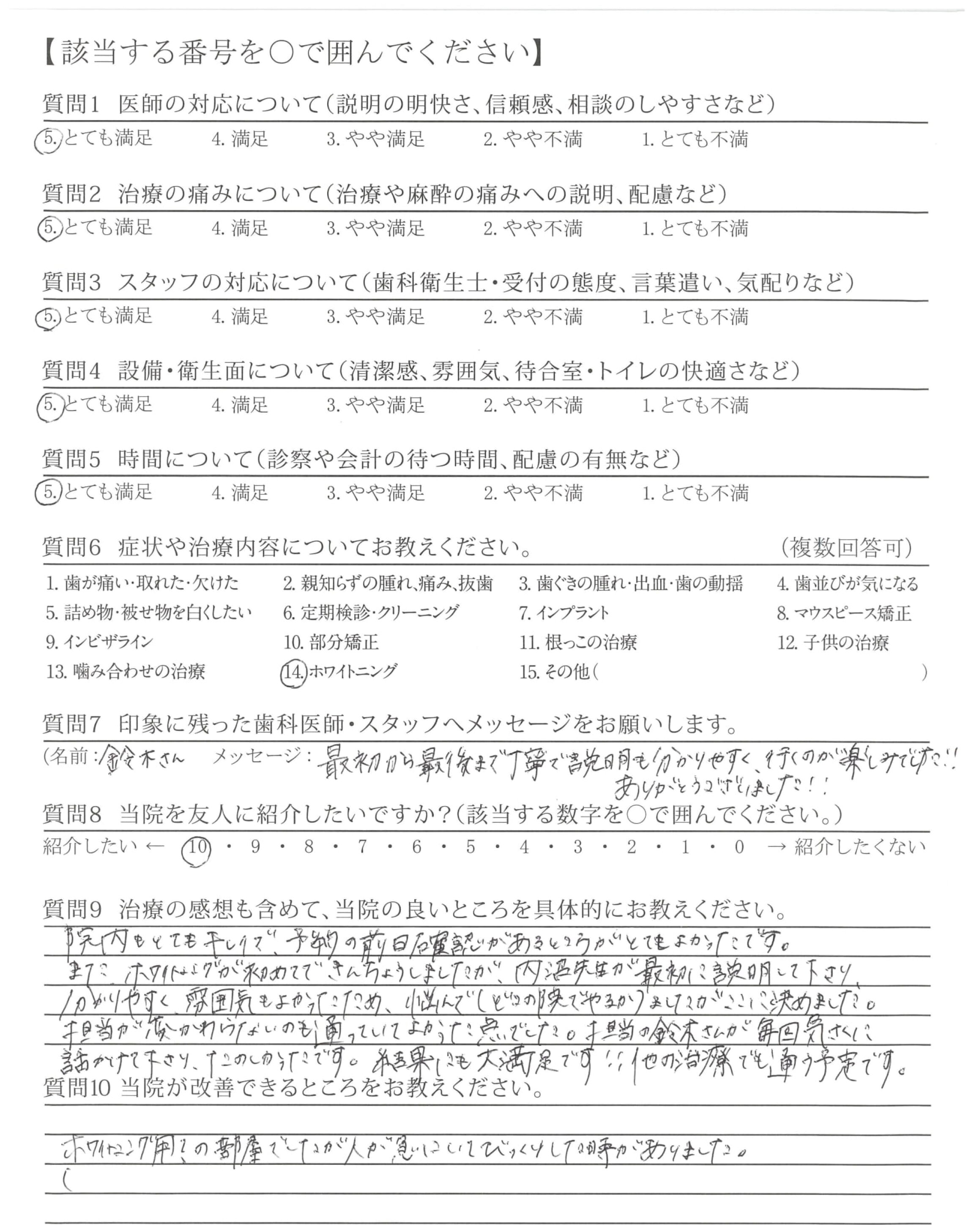 ホワイトニングはしみたりすることがよくありましたが、貴院はまったく不快感なく受けることができたので、とても良かったです。