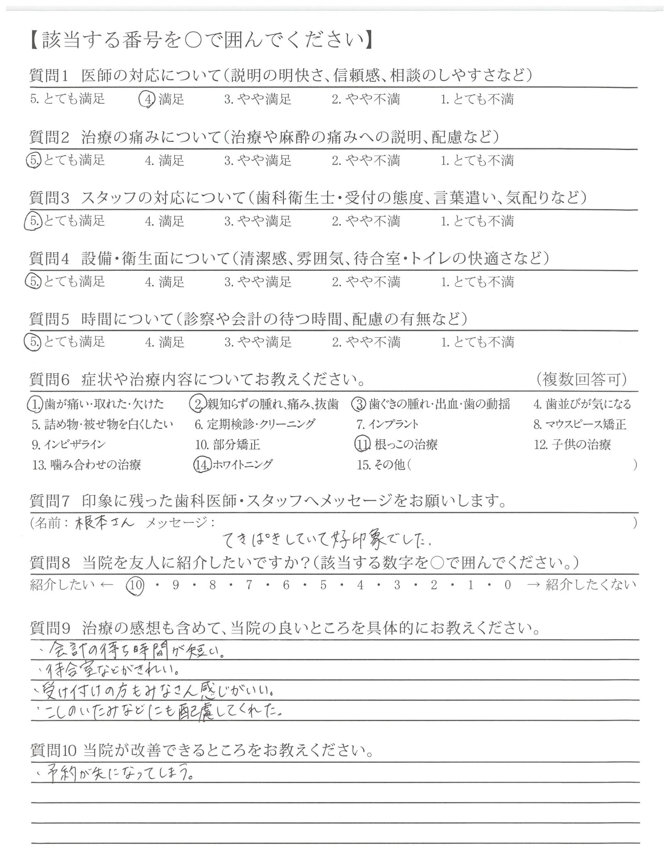 安心できる院との事で娘の紹介で受診しました。他院での先生の対応の悪さやインビザラインの治療で下の左2が前に出ないのに納得がいかないとの相談に親切に対応してくれました。また前歯のセラミックと他の歯との色の違いでホワイトニングもやり、歯科衛生士の経験やアドバイスをしっかり話して下さり、満足でした。