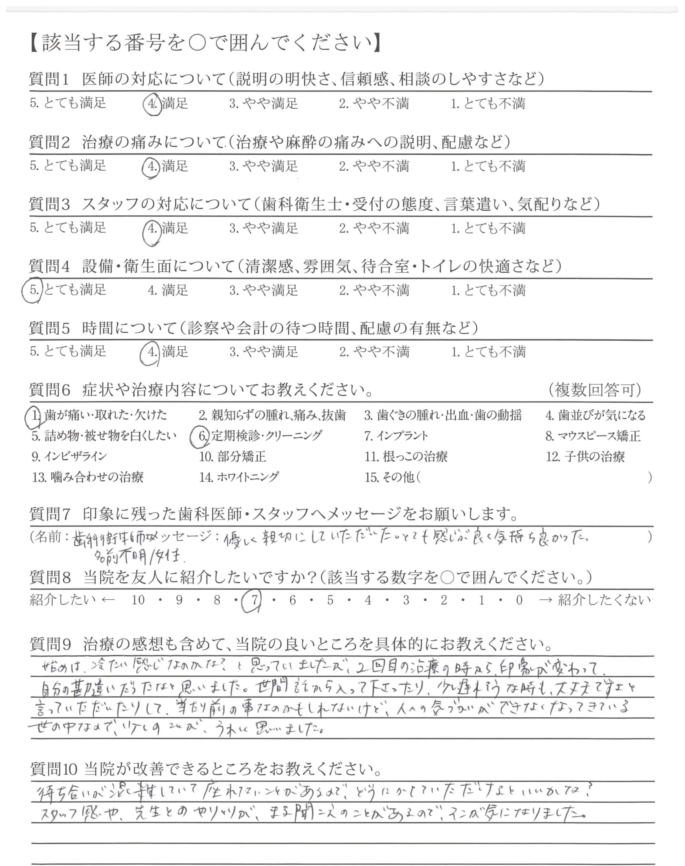 虫歯ができていたのに怖くて来院するのを先延ばしにしていました。ですが、「来て頂いてありがとうございます」と優しく声をかけて下さいました。