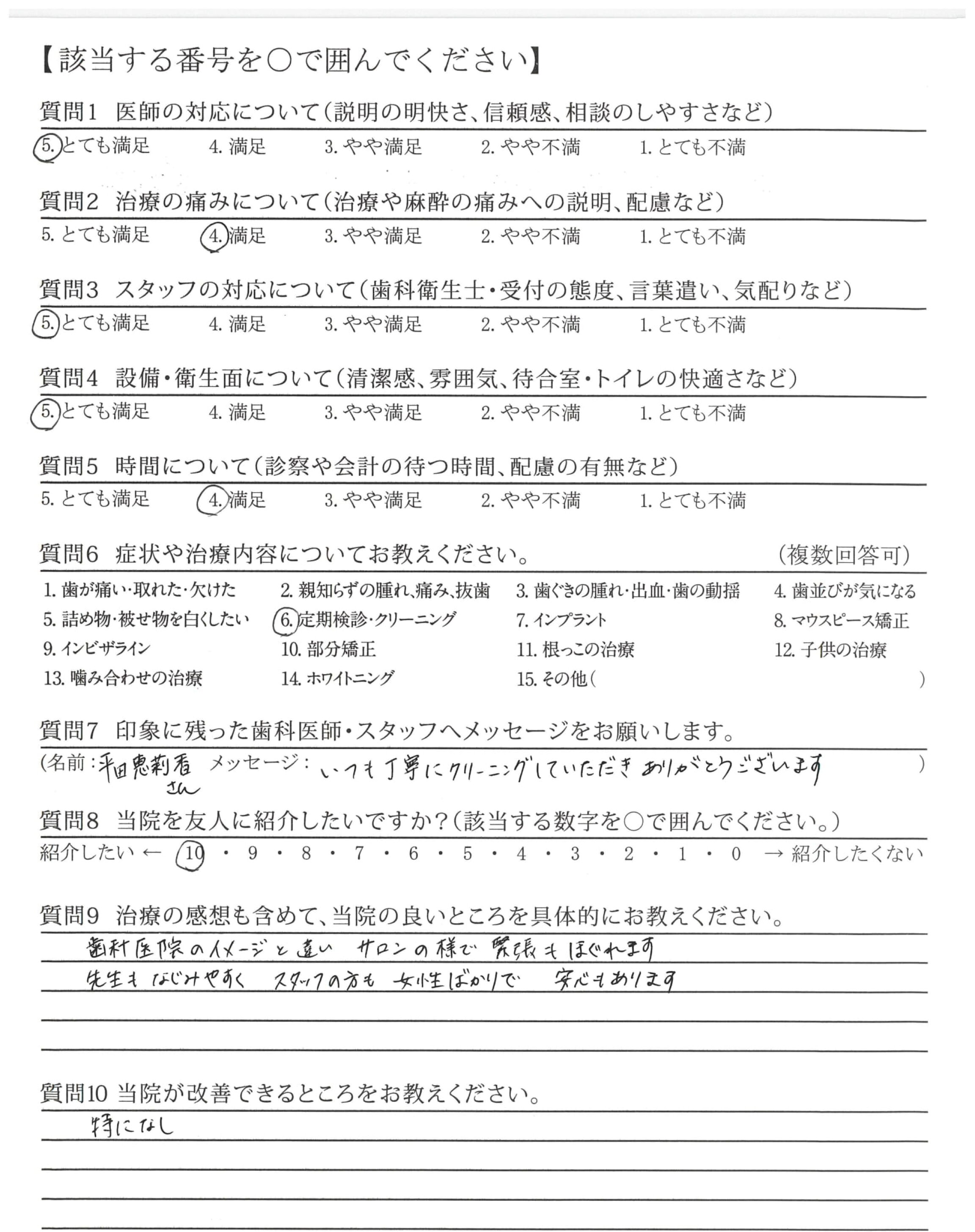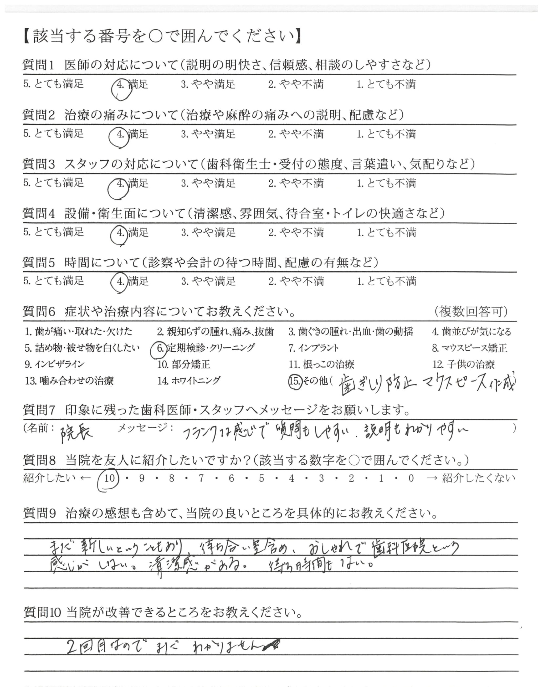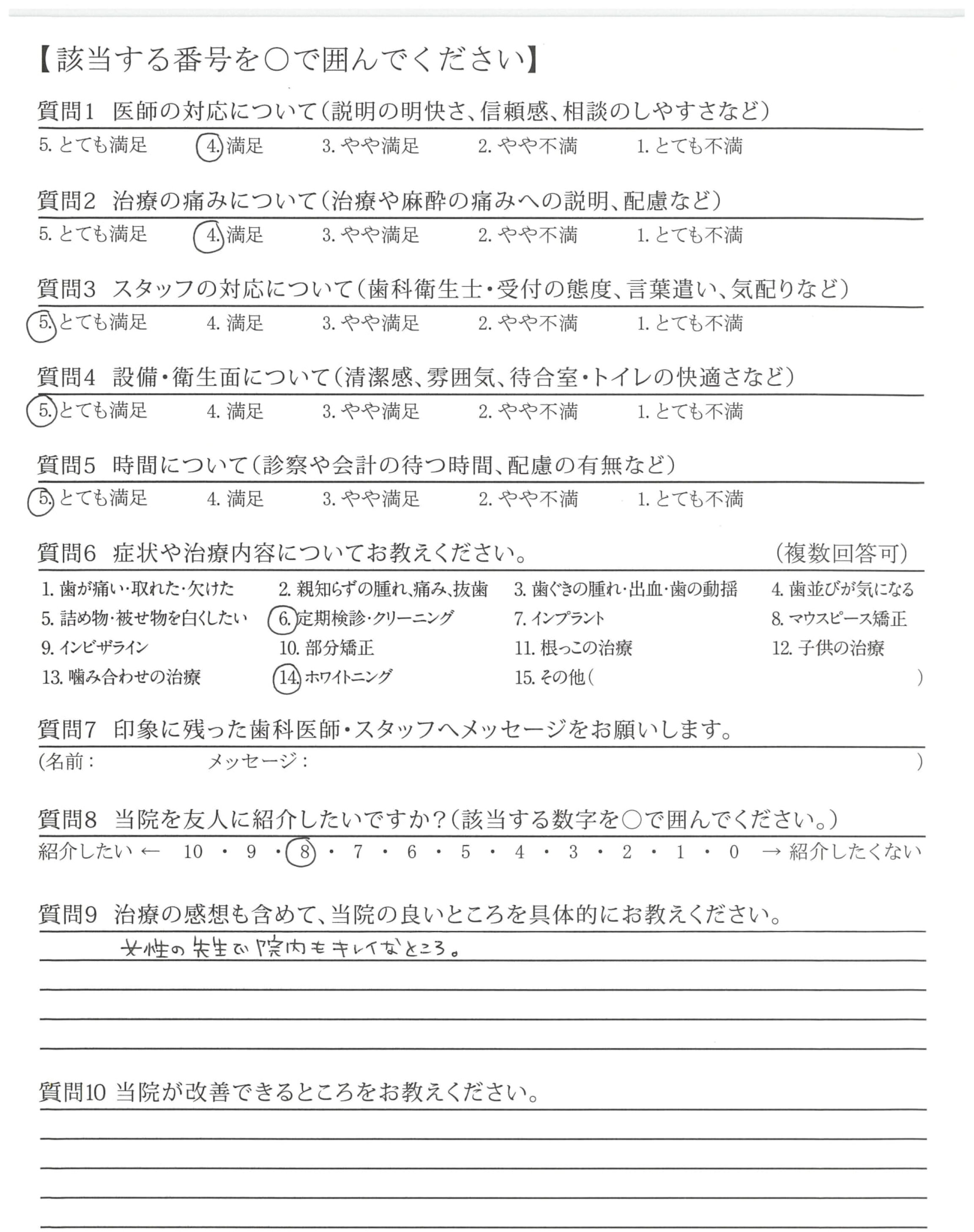 「医師の対応について」は先生とはまだおつきあいが浅いので4としました。(私は痛みには強いのですが、やはり痛くなければリラックスできます。)