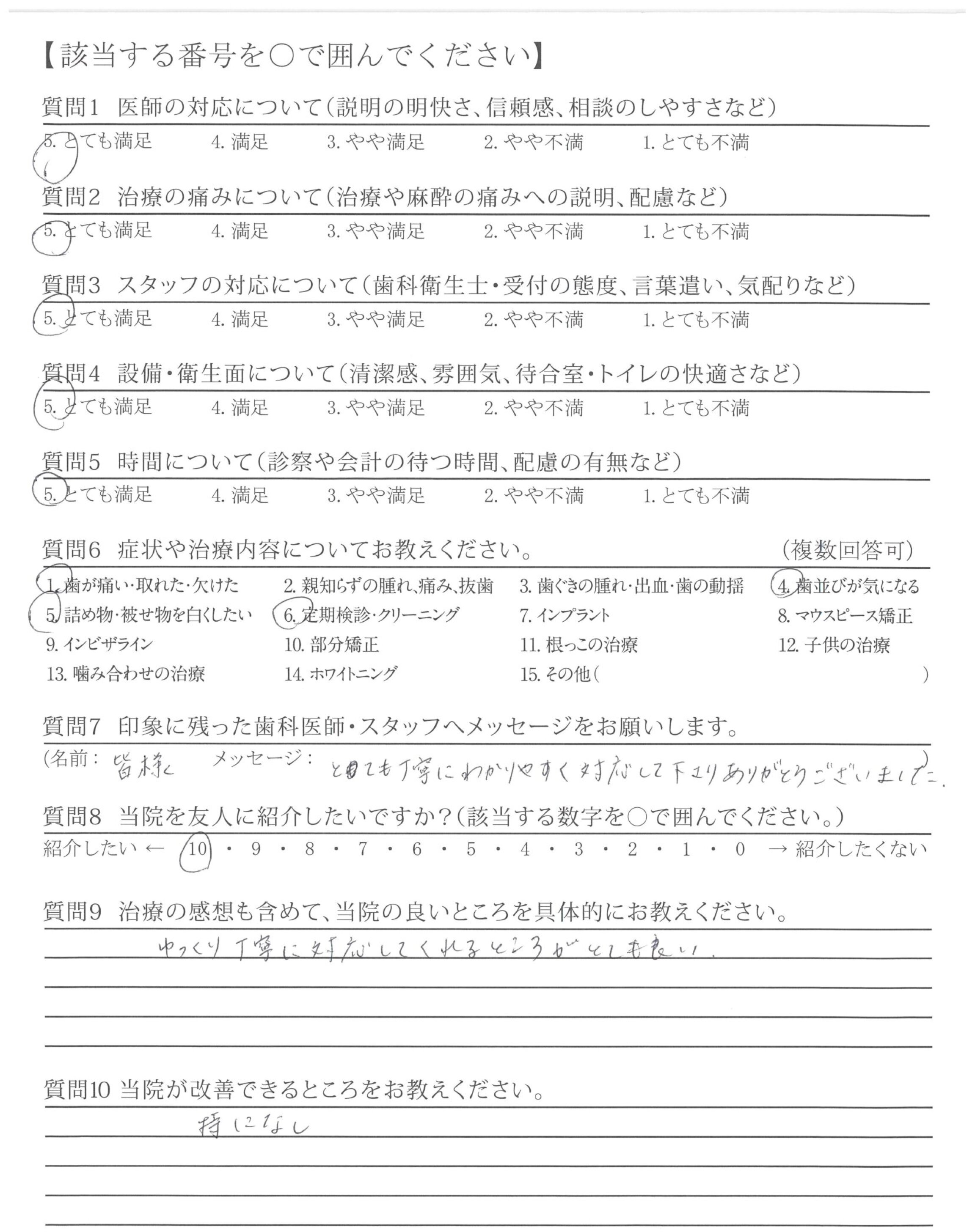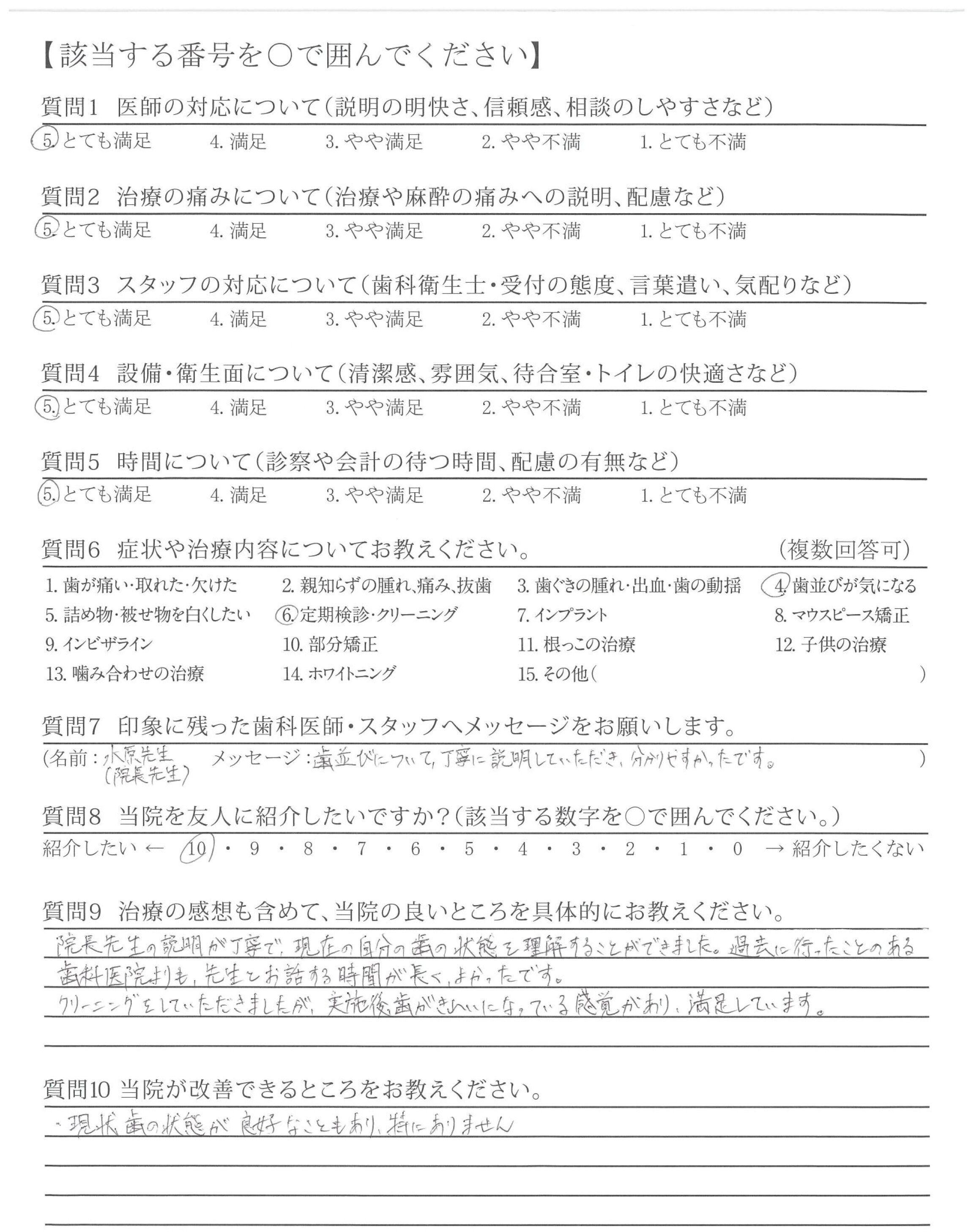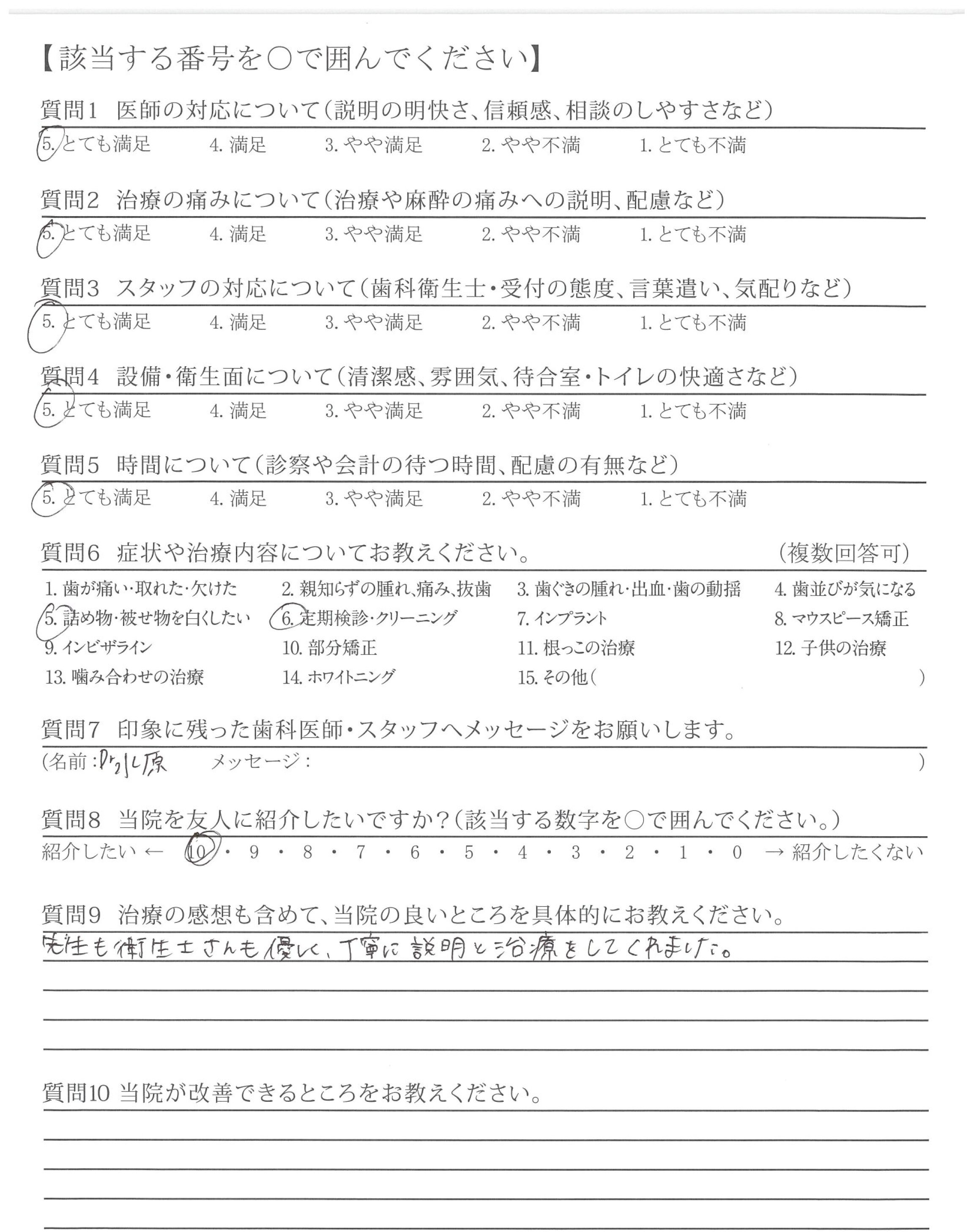 治療の後は、歯に関する質問やホワイトニングについて問い合わせたところ、分かりやすい説明と納得できる提案をいただき、先生に対して親しみを感じることができました。