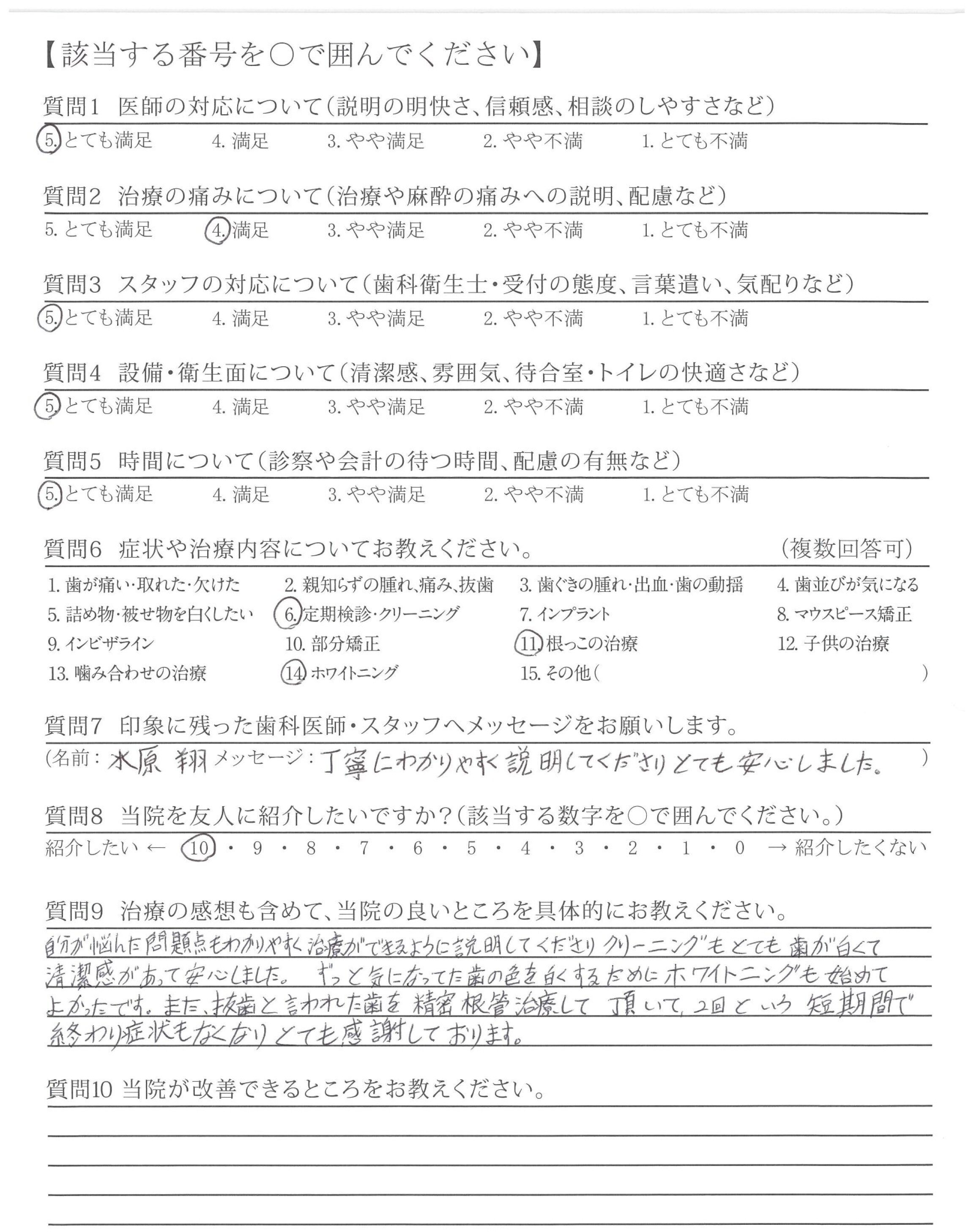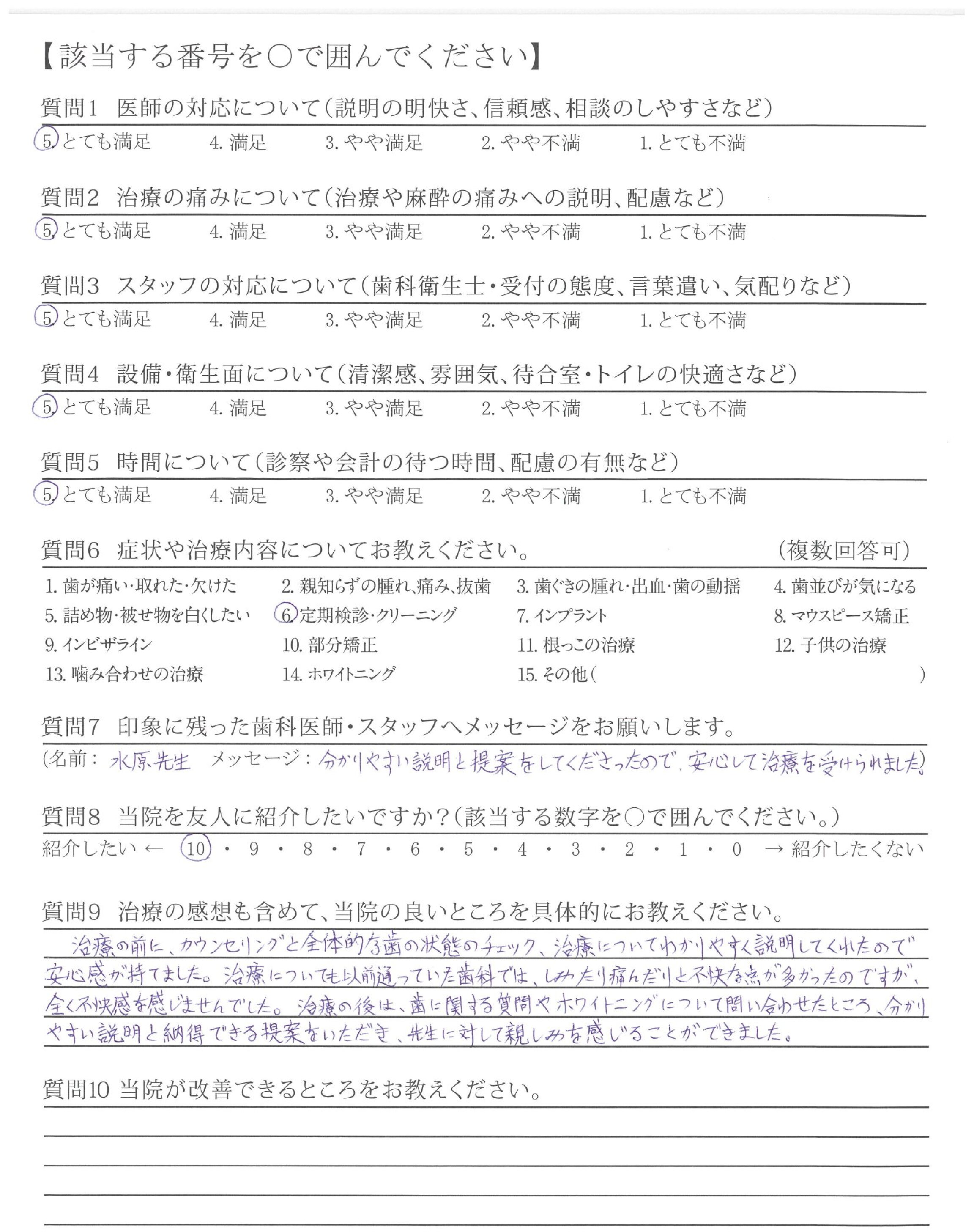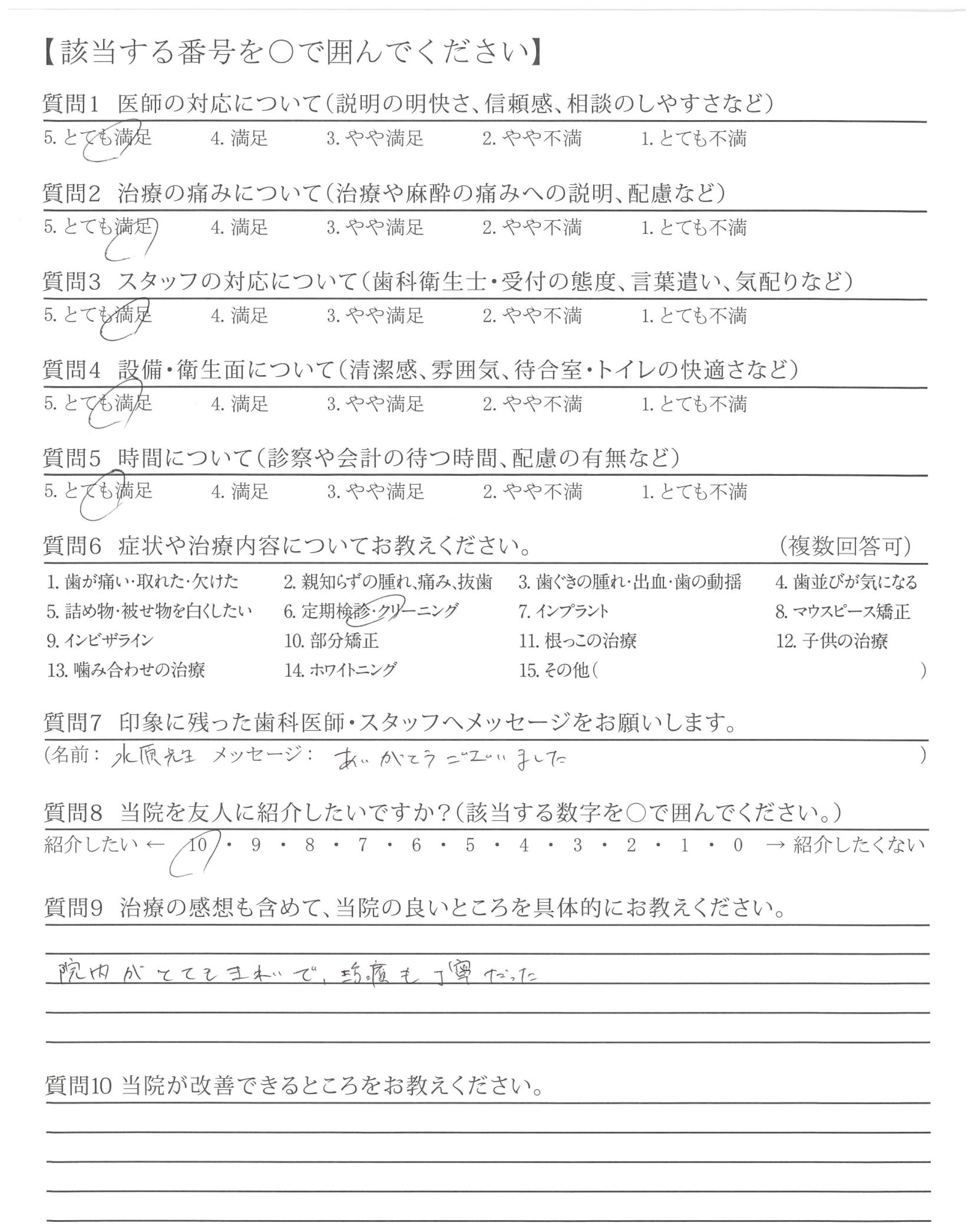 治療の後は、歯に関する質問やホワイトニングについて問い合わせたところ、分かりやすい説明と納得できる提案をいただき、先生に対して親しみを感じることができました。