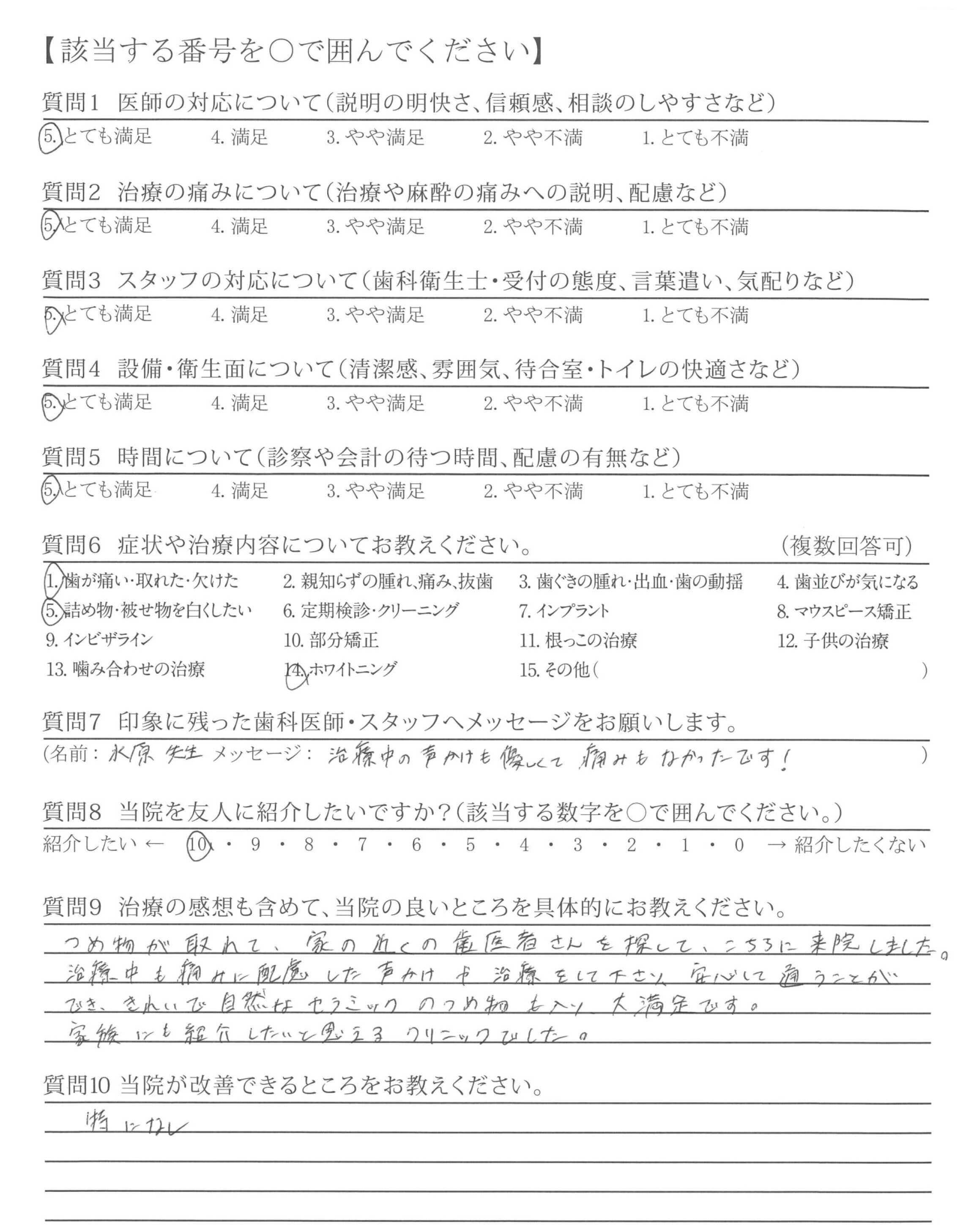 治療中も痛みに配慮した声かけや治療をして下さり、安心して通うことができ、きれいで自然なセラミックのつめ物も入り大満足です。
