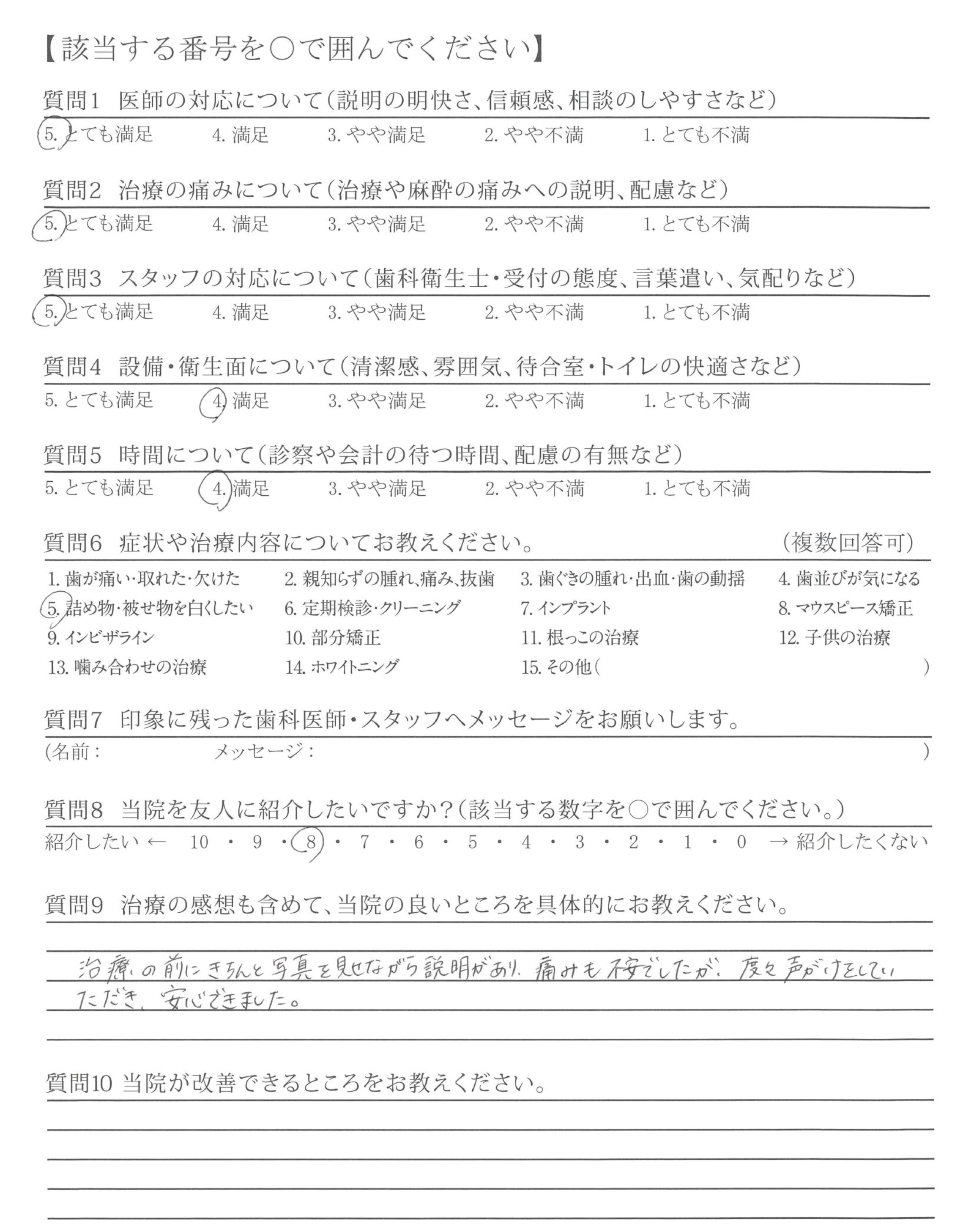 治療の前にきちんと写真を見せながら説明があり、痛みも不安でしたが、度々声がけをしていただき、安心できました。
