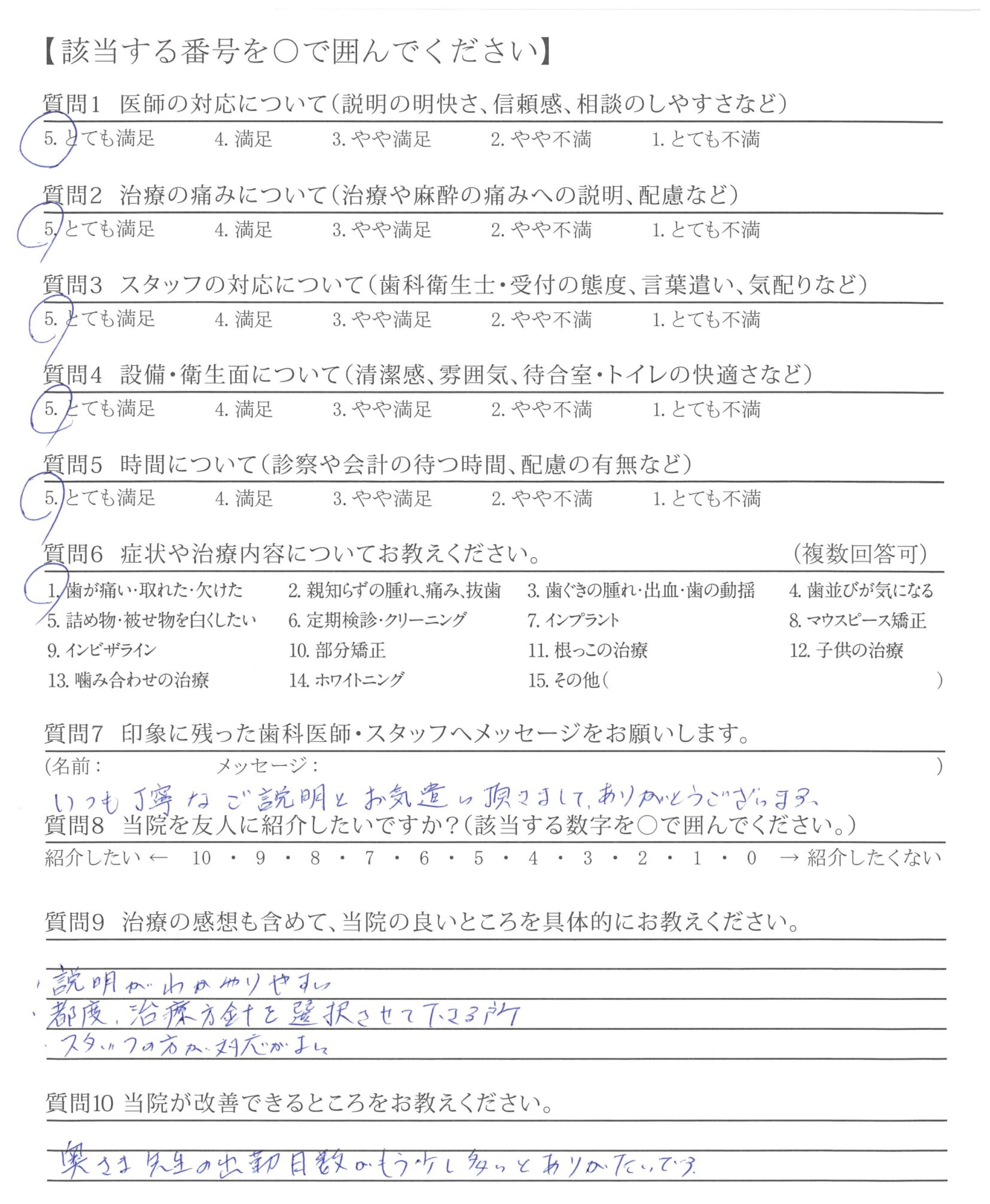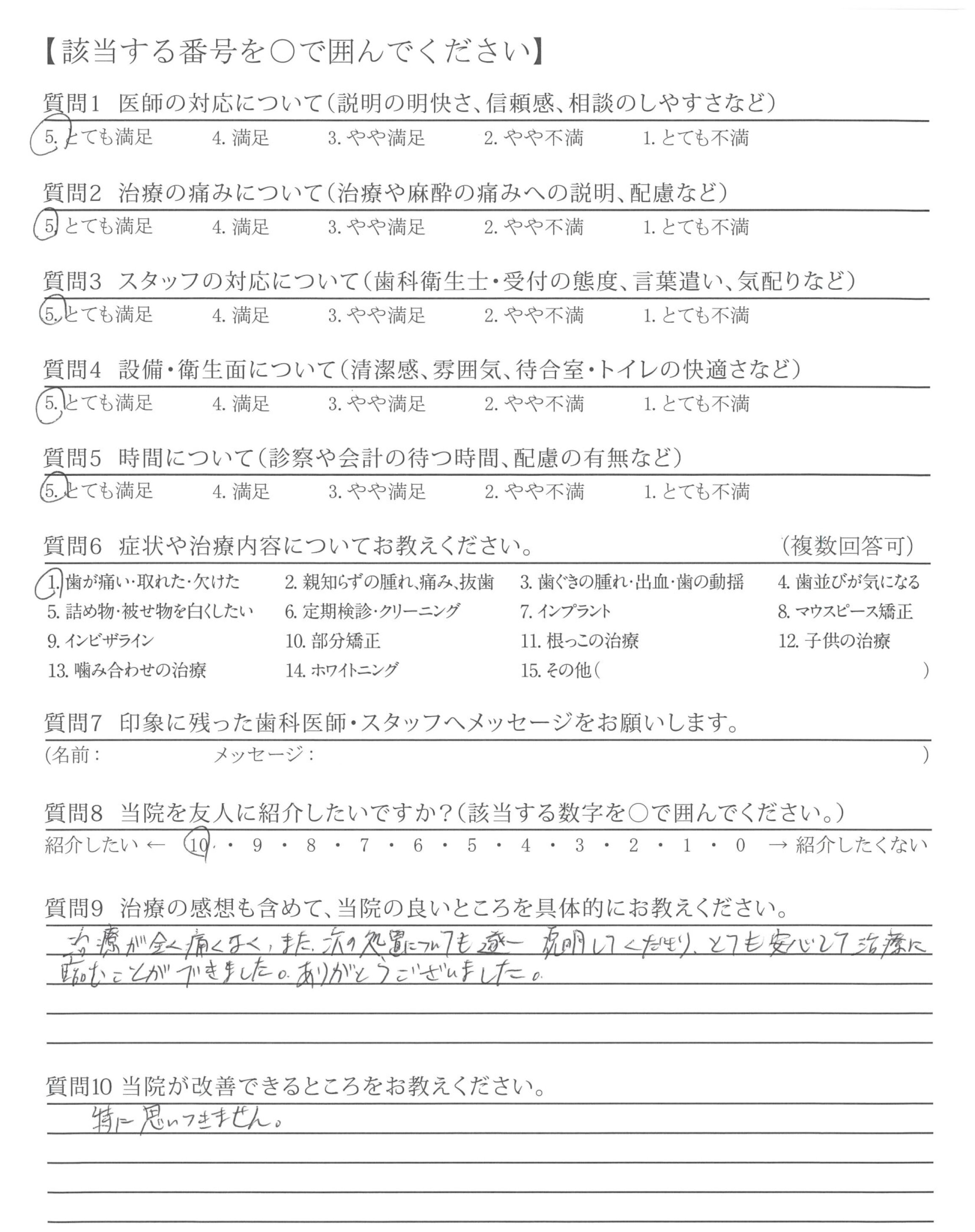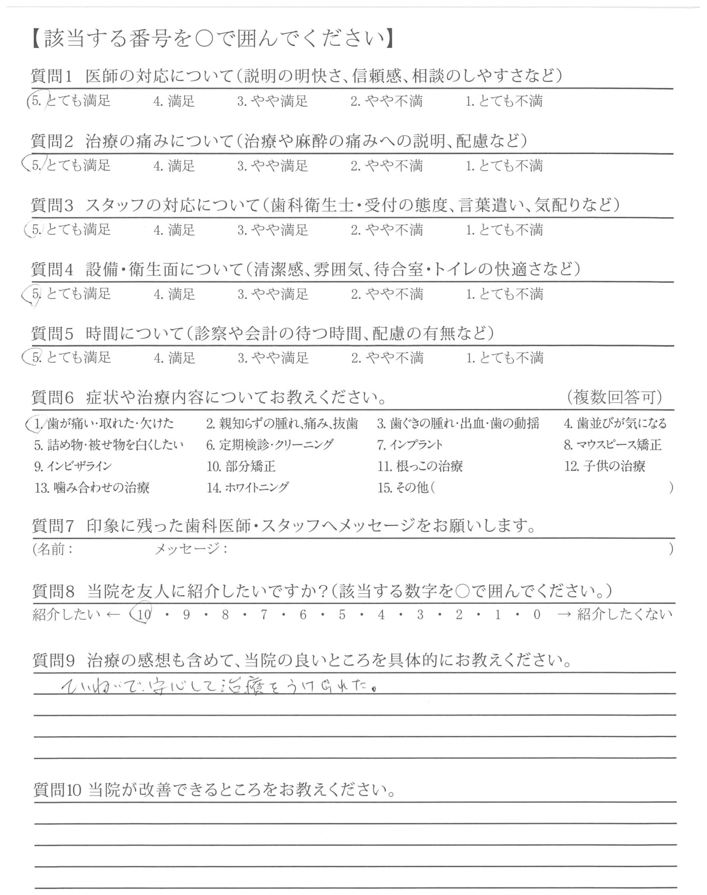 治療が全く痛くなく、また次の処置についても逐一説明してくださり、とても安心して治療に臨むことができました。ありがとうございました。