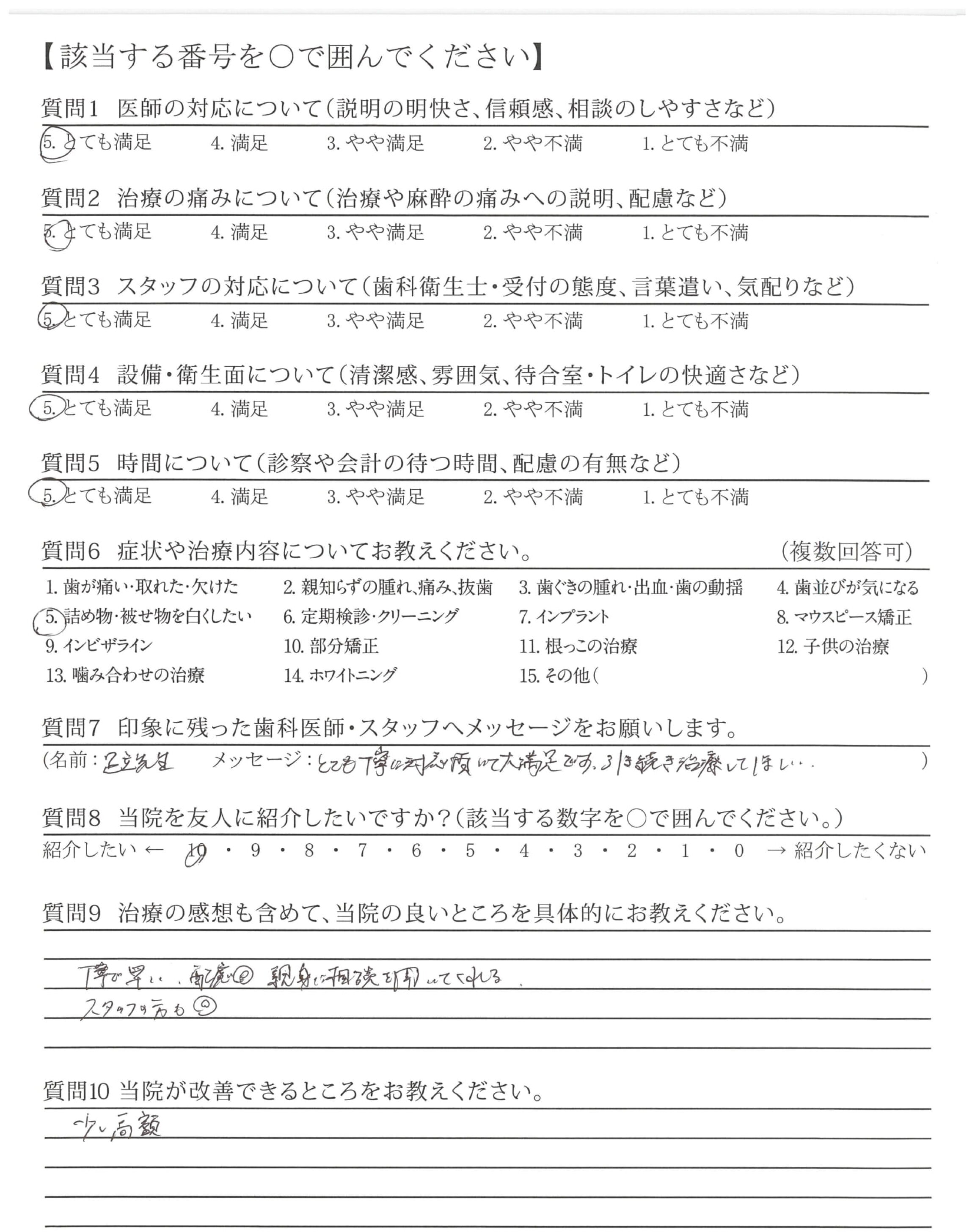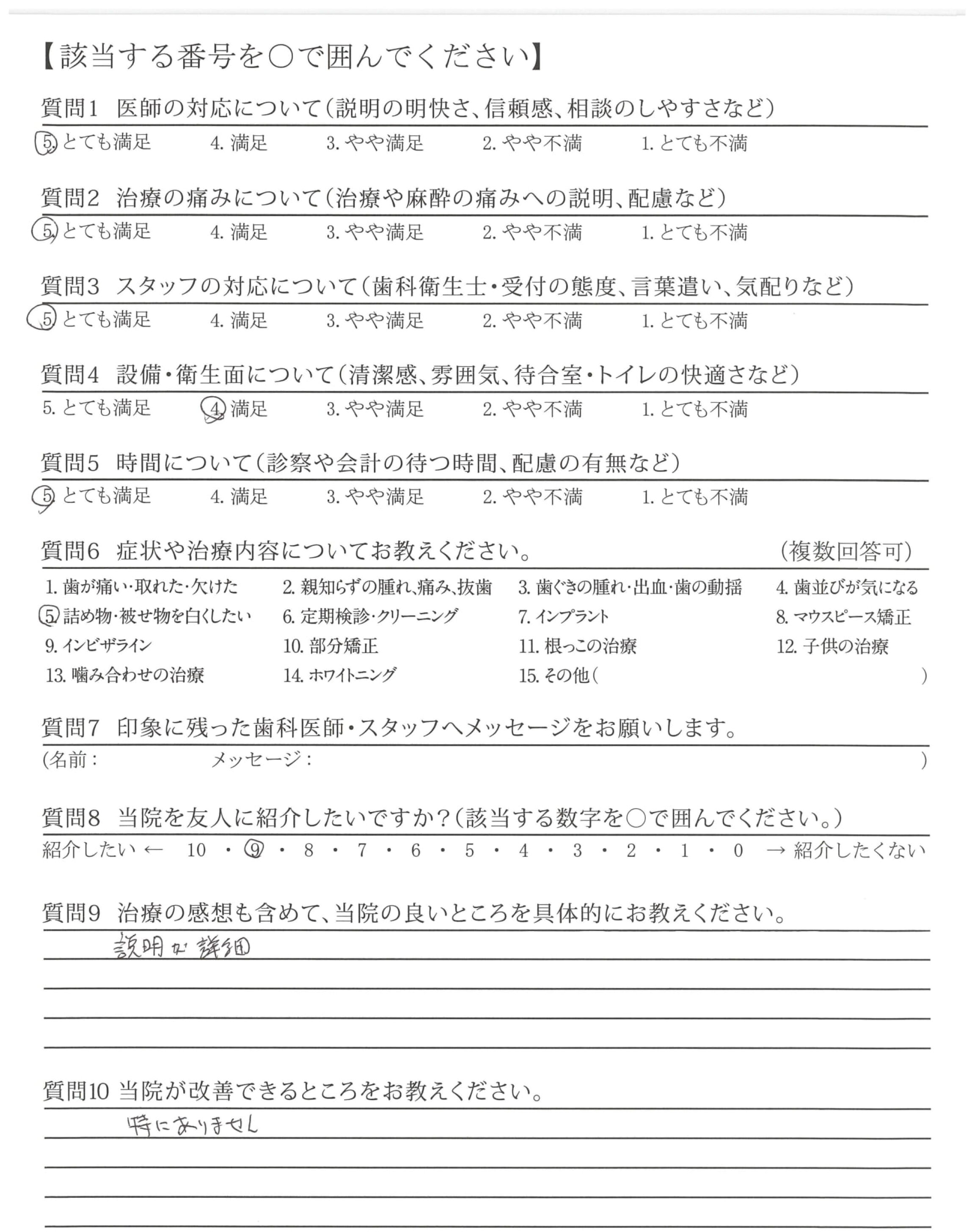 久しぶりの歯科で不安でしたがわかりやすくたくさんの質問にも快くご解答下さり安心しました。治療処置?も早く驚きました。