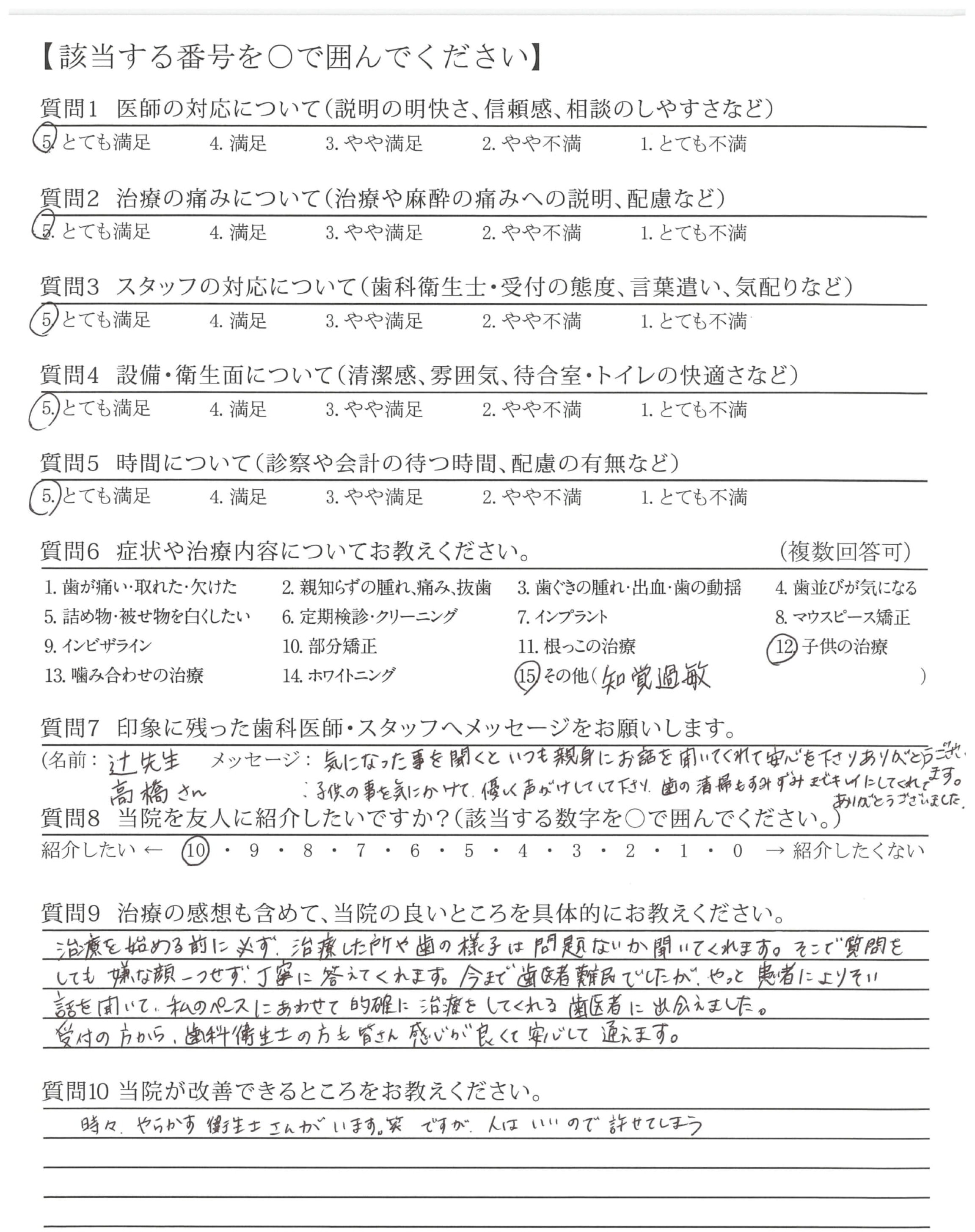 子供の事を気にかけて、優しく声がけして下さり、歯の清掃もすみずみまでキレイにしてくれてありがとうございました。