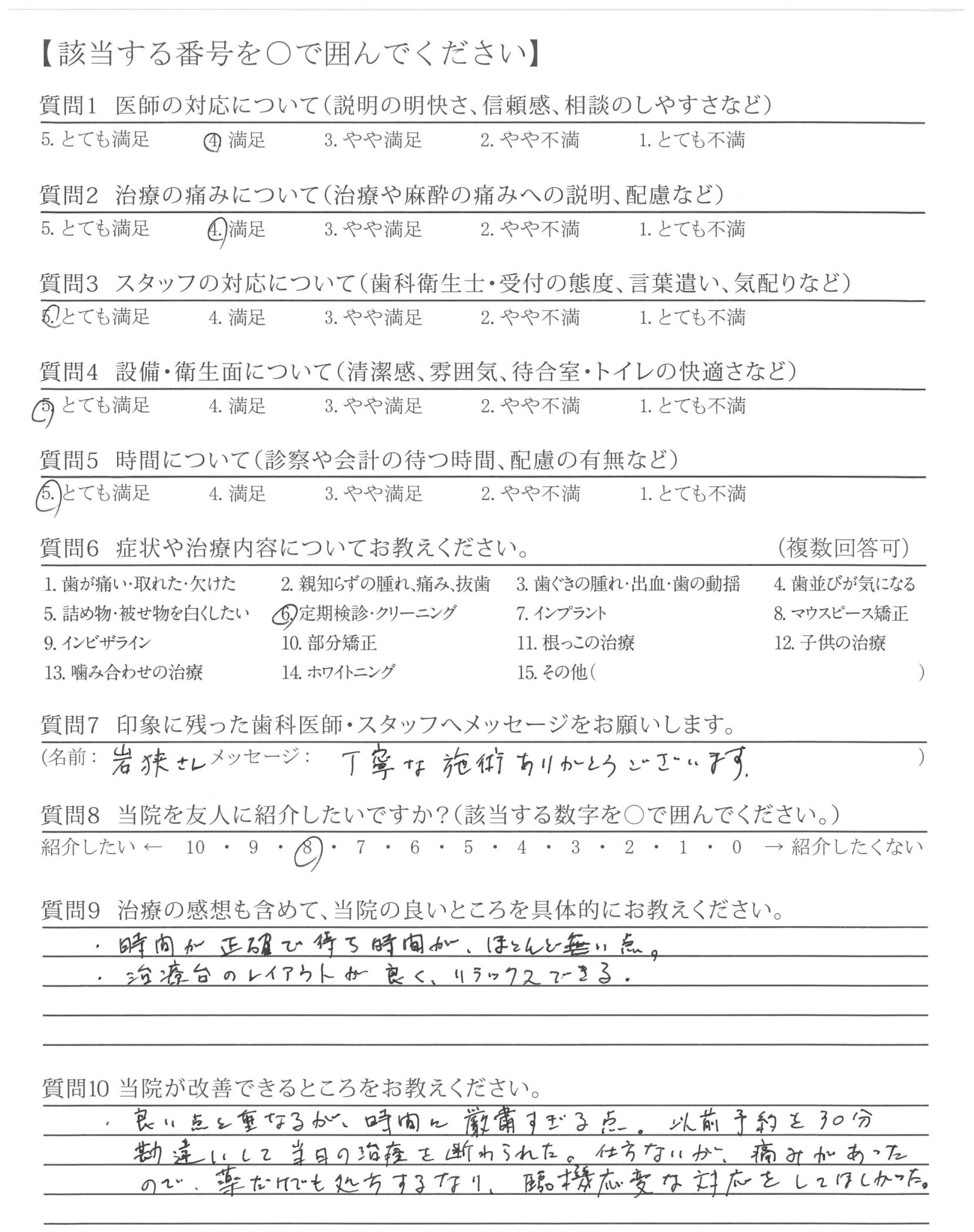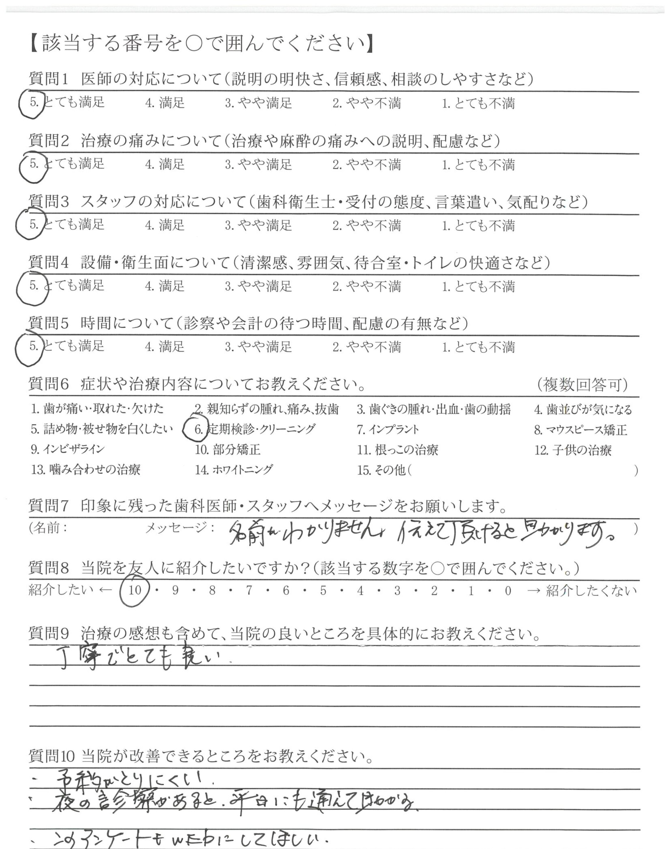 最初はさし歯が取れて、前の歯科では、救急は受け付けてもらえなかったが、その日の内に仮歯を作っていただき、本当に助かりました。会社勤めしていたので、どうしようと思い、友人に紹介してもらって、スピードが速く、悪い所は、治していただき、うれしいかぎりでした。