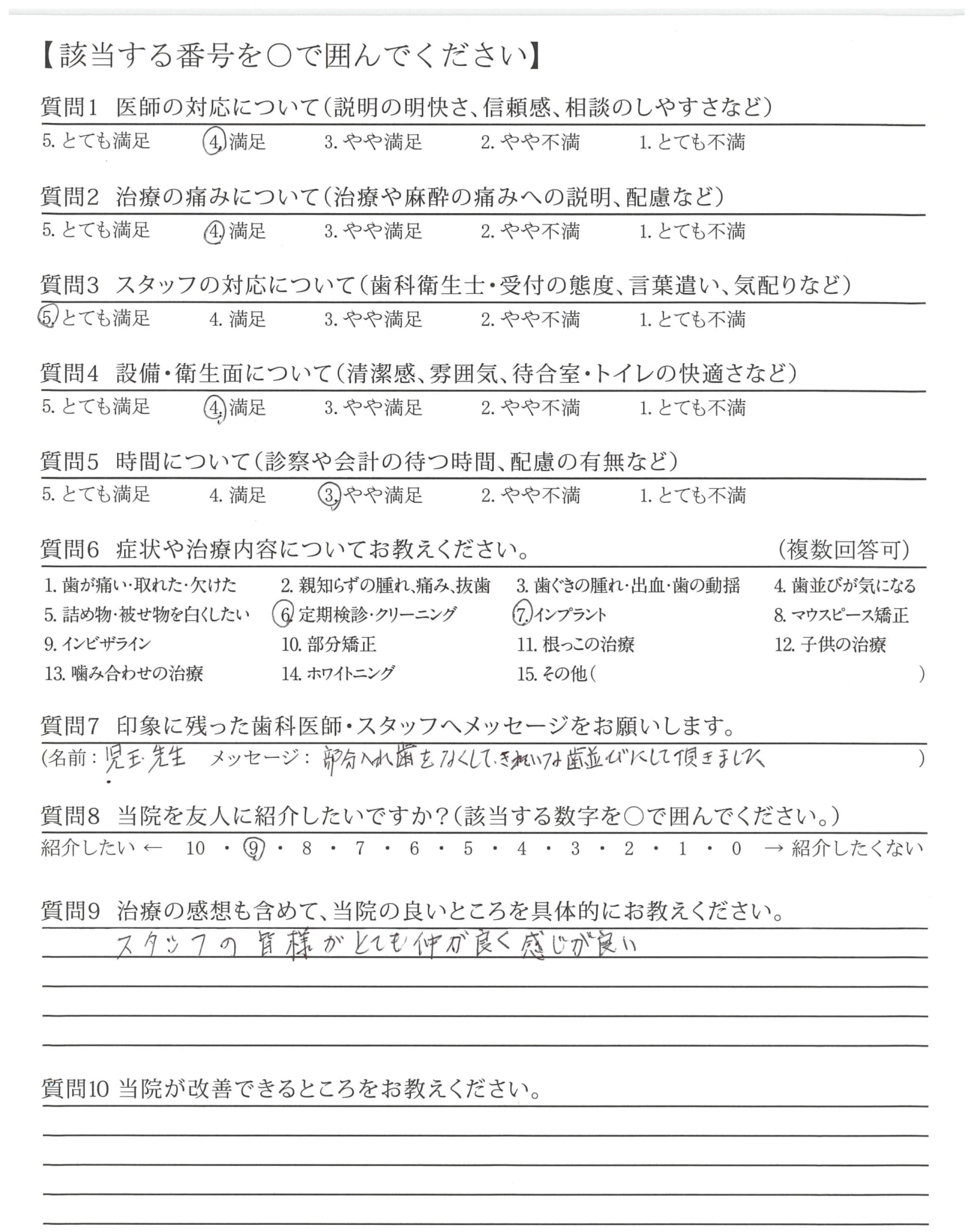 話し方がおだやかで治療もとても親切・丁寧にして下さり感謝しております。ありがとうございました。