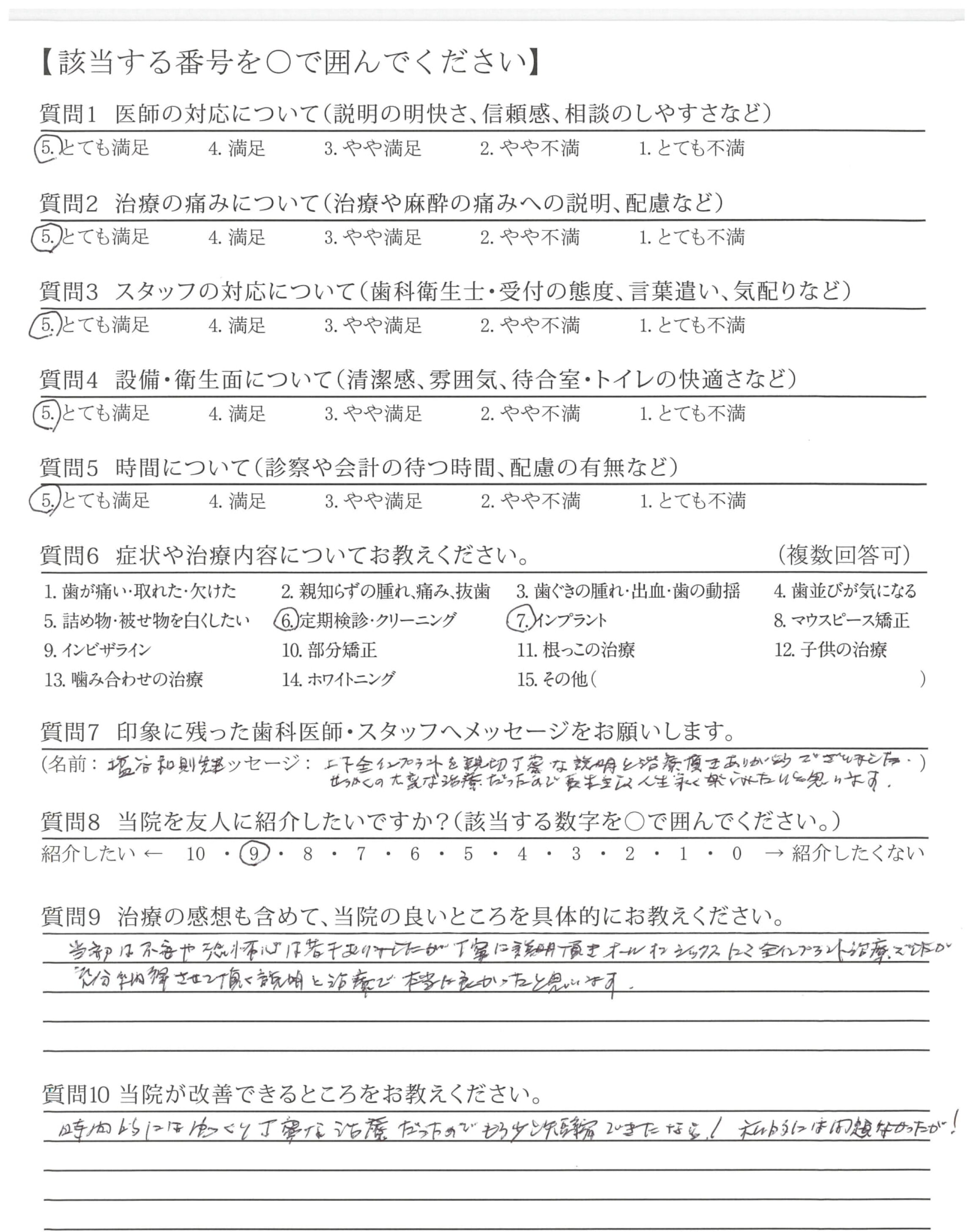 上下全インプラントを親切丁寧な説明と治療頂きありがとうございました。せっかくの大変な治療だったので長生きな人生永く楽しみたいと思います。