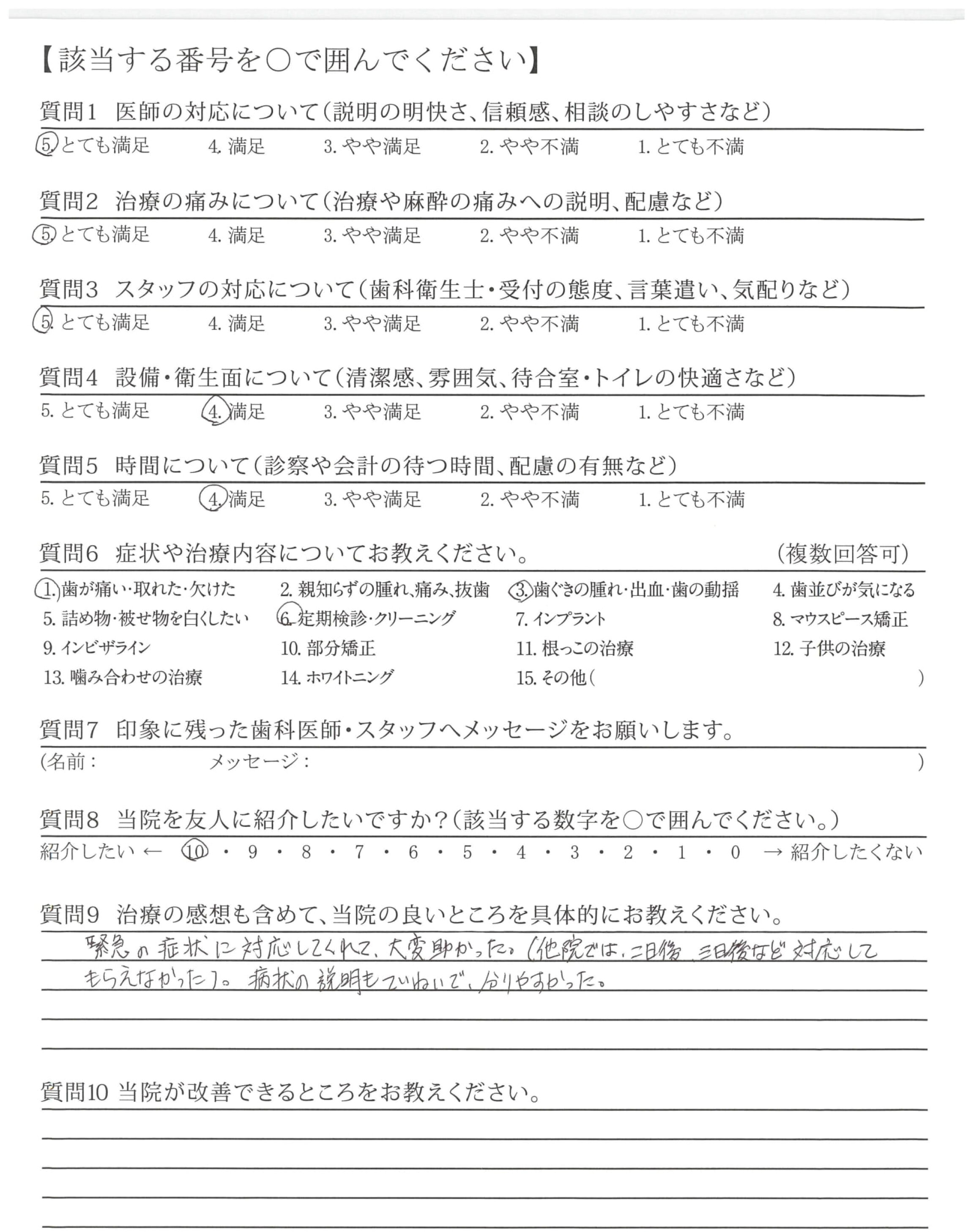 緊急の症状に対応してくれて、大変助かった。(他院では、二日後、三日後など対応してもらえなかった。)