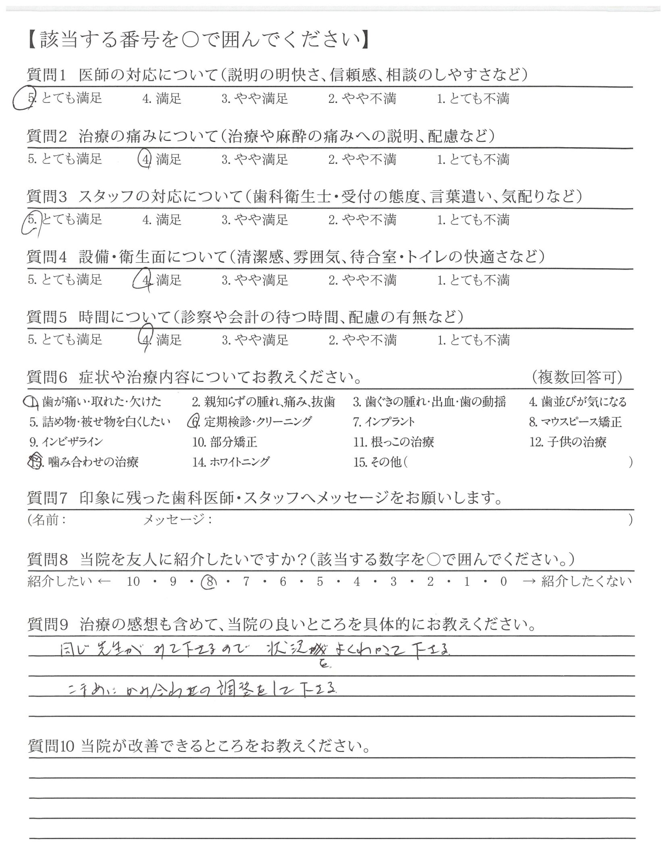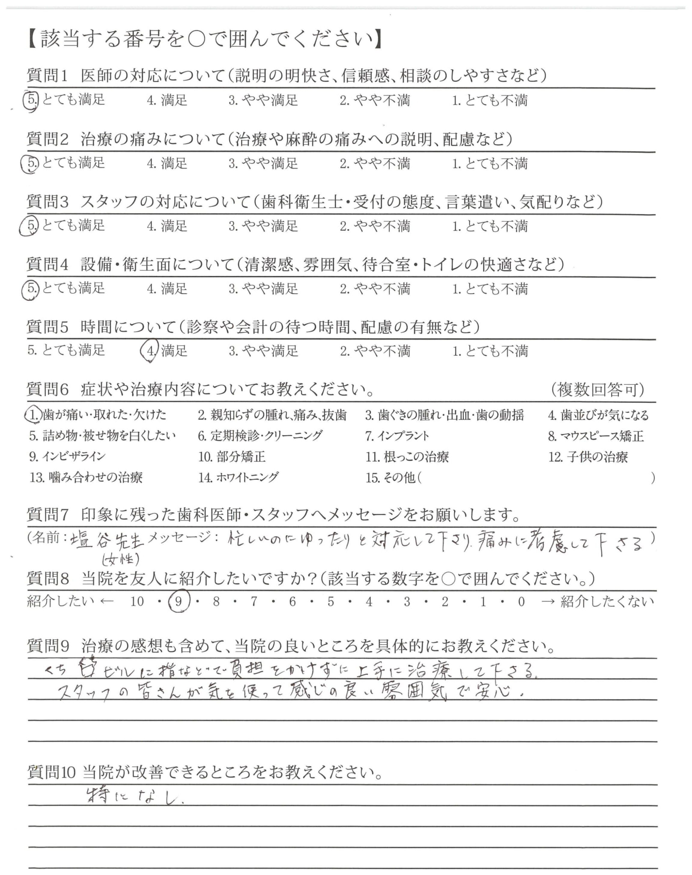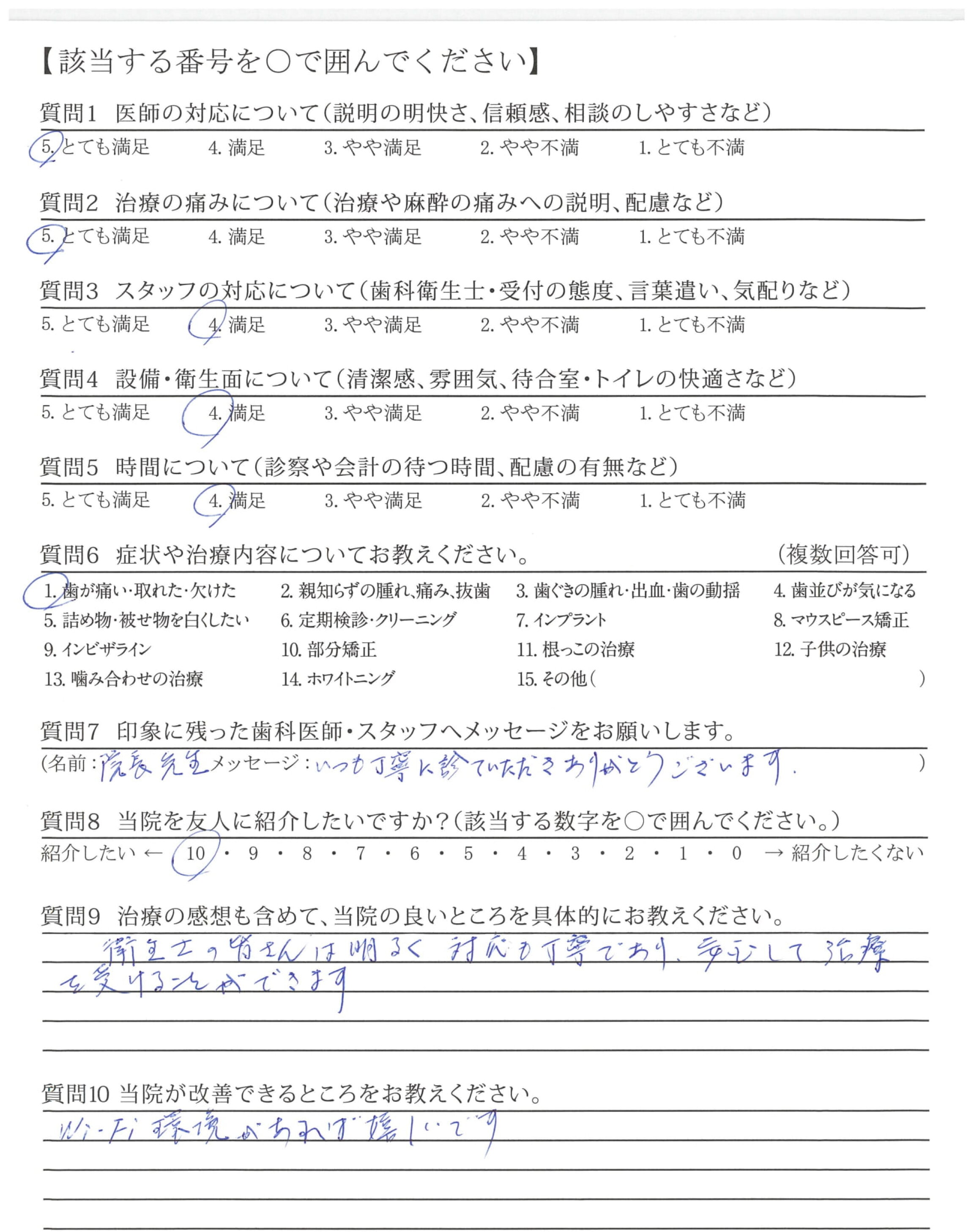 いつも丁寧に説明、治療してくださり、感謝しています。