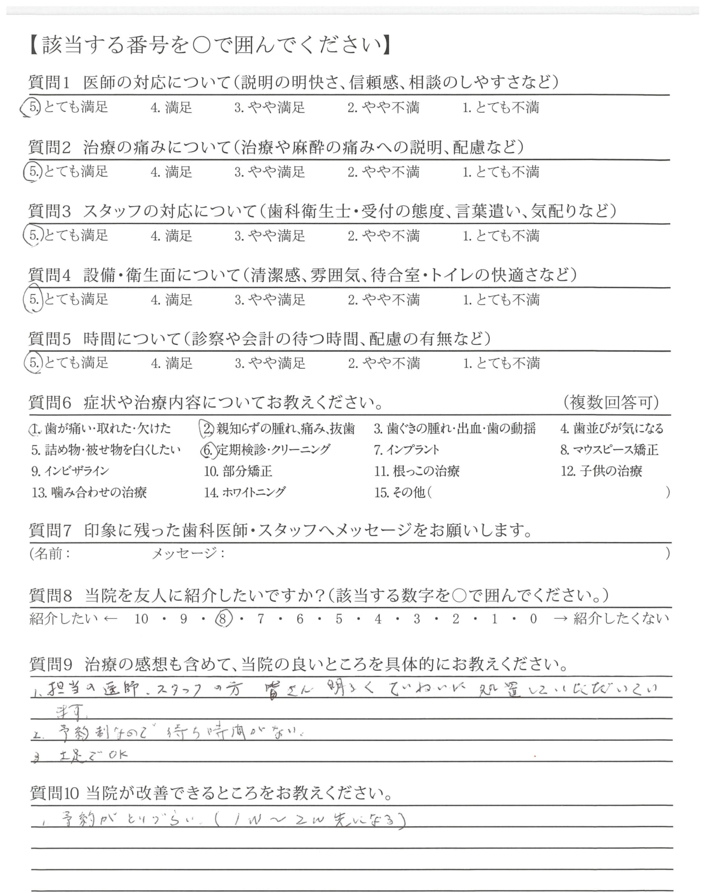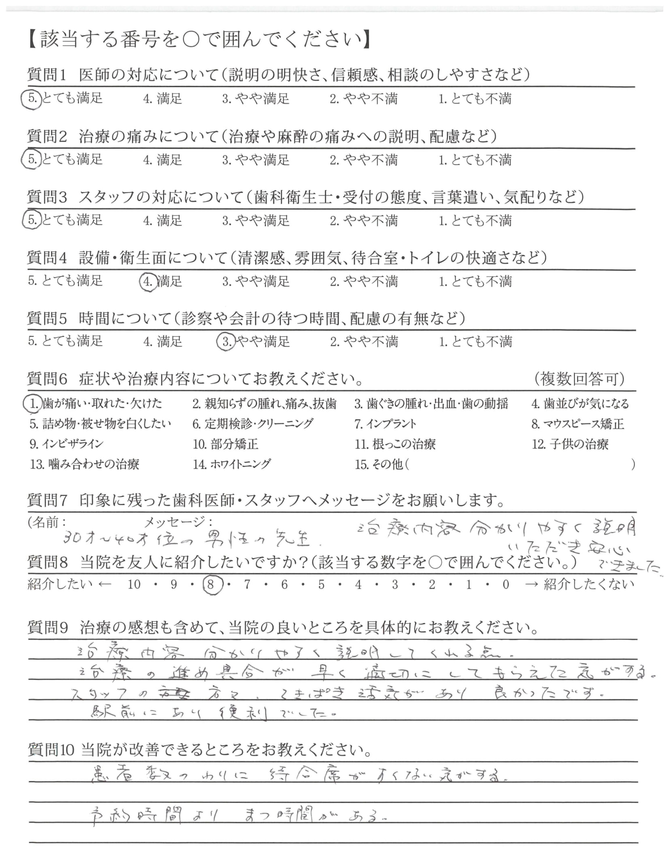 受付も先生も衛生士さんも皆さんとても感じがよく、説明も分かりやすく、私への確認も都度していただけ安心して治療ができました。