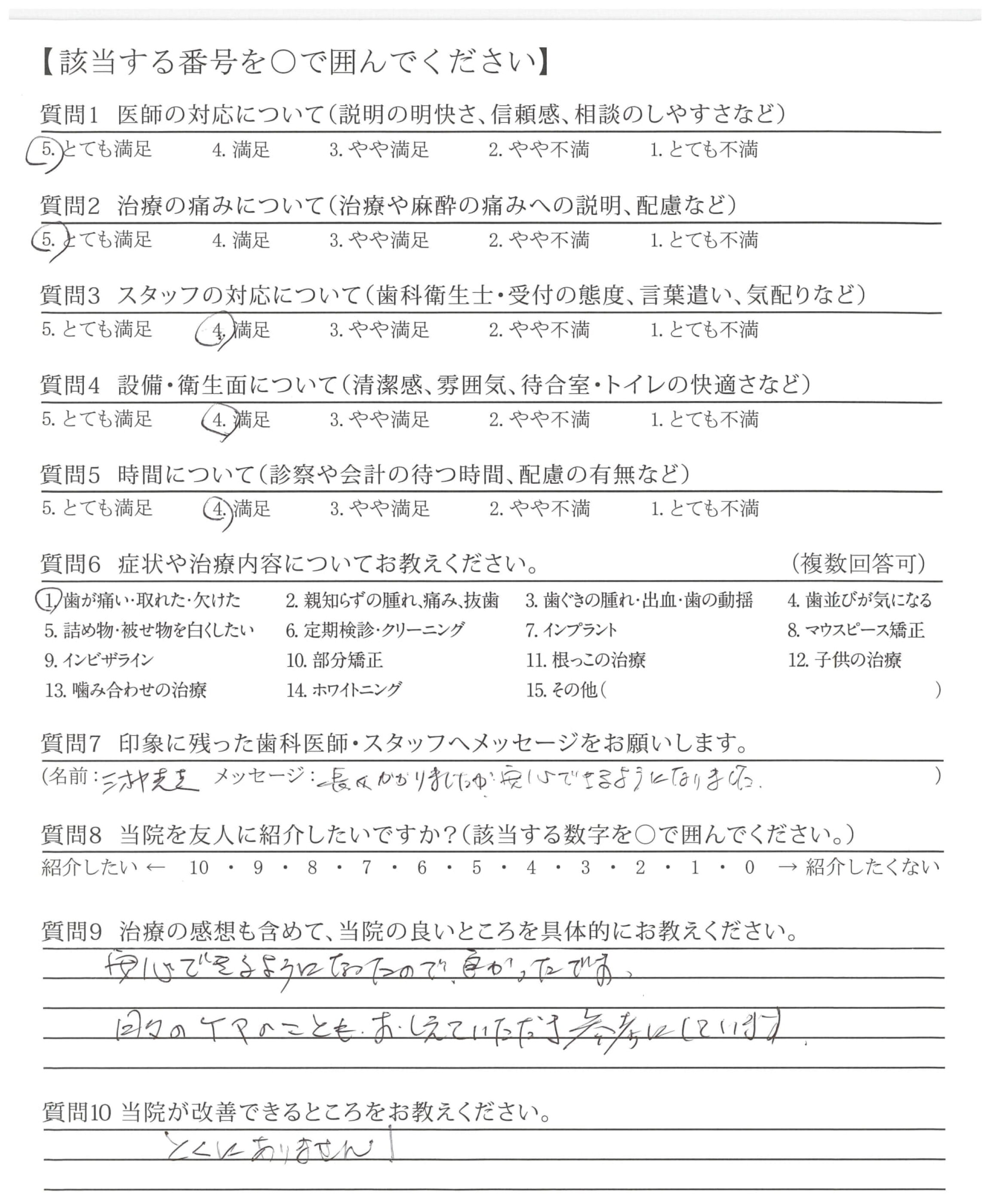 できる限りのことを精一杯して下さったこと常に笑顔で対応して下さったことに心から感謝致します。(歯の治療回数については、私の方から希望したことではないのですが、お医者のお気持ちが伝わってくるようでした。)