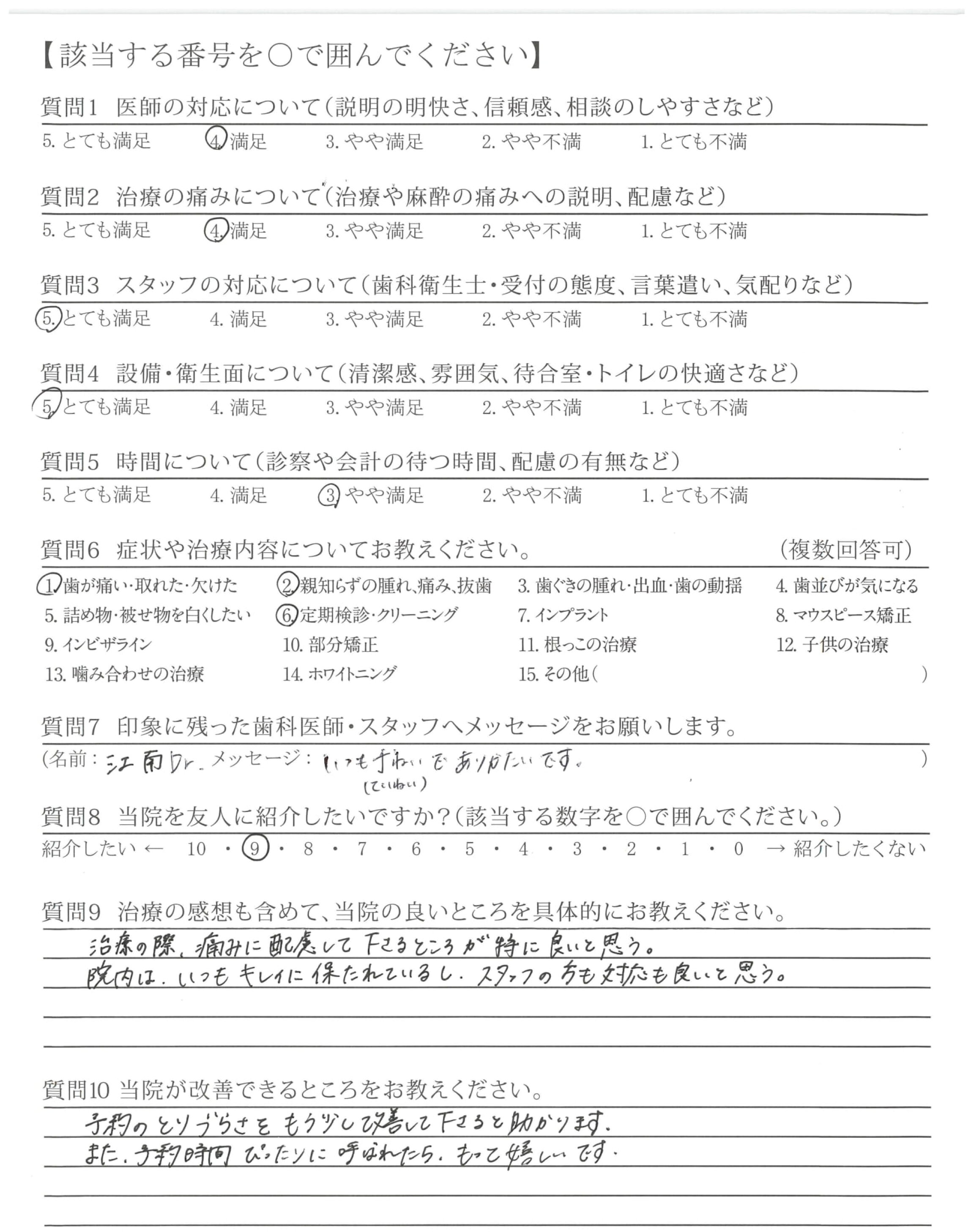他院では強引に無理な治療を勧めてくるところもありました(金銭面的な内容)。貴院は無理に勧めてくることなく、その治療をする上でのメリット、デメリットを説明いただいた。そして相談しながら治療を進めてくれた点が良かったです。