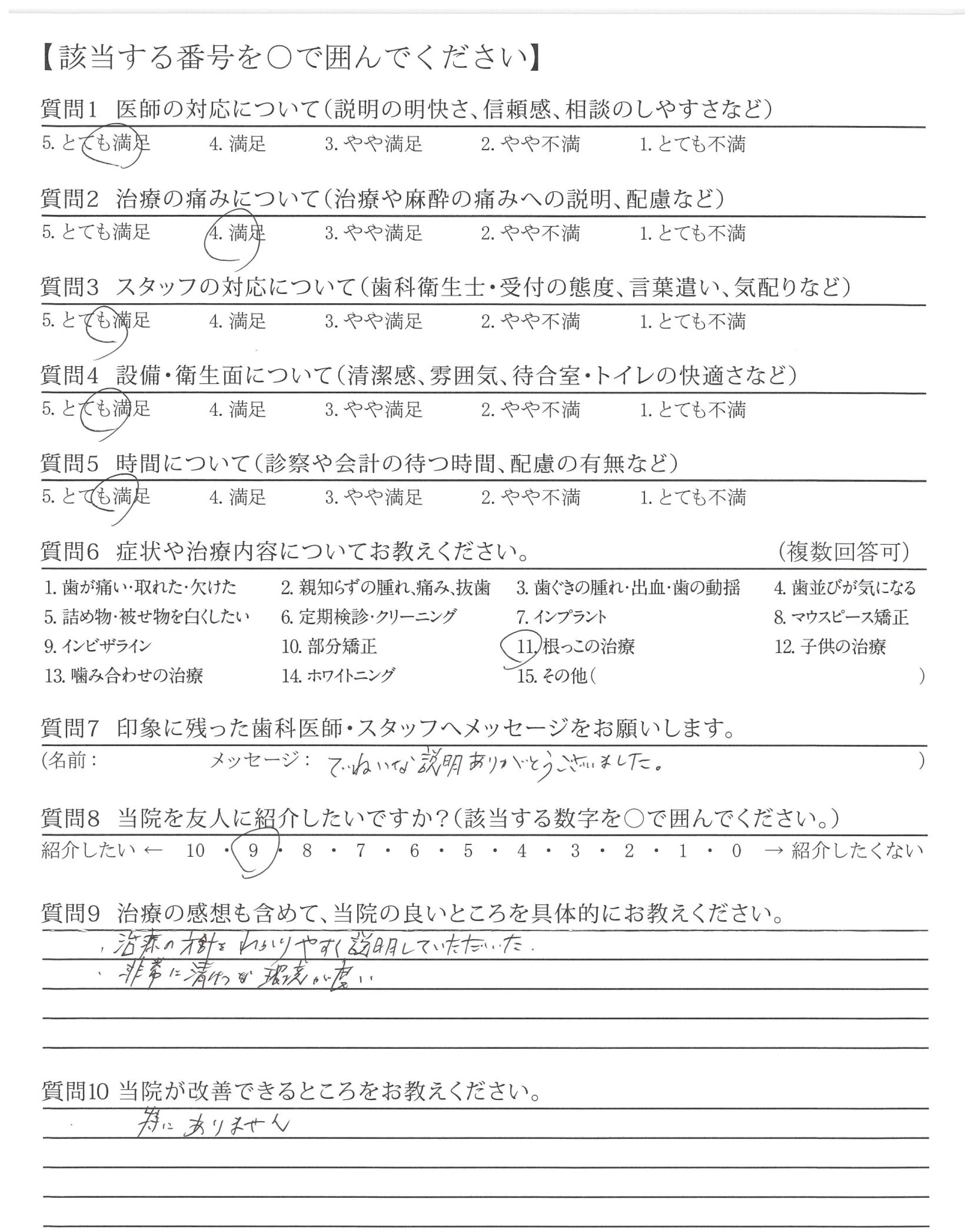 治療前に歯の箇所ごとに、どのような治療を行うか具体的な説明をして下さった上で治療を始めていたところが非常に丁寧な対応でした。